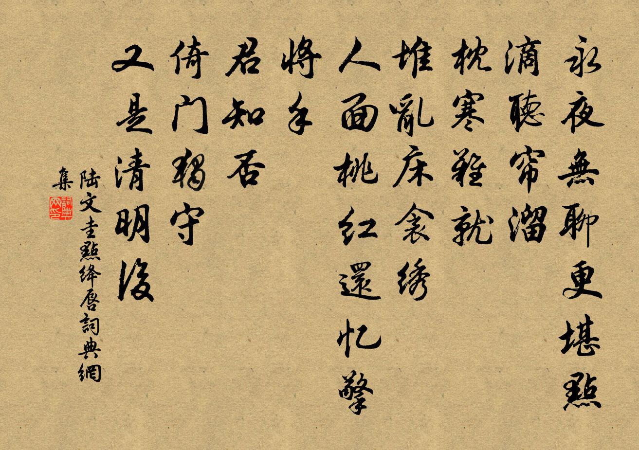 詩詞名句歷史字典書法欣賞書法字典國語詞典說文解字康熙字典古漢語字典標 題 作 者 詩 句 點絳唇作者:陸文圭 朝代:元代點絳唇原文永夜無聊,更堪點滴聽簾溜。枕寒難就。堆亂床衾繡。人面桃紅、還憶擎將手。君知否。倚門獨守。又是清明後。詩詞問答問:點絳唇的作者是誰?答:陸文圭問:點絳唇寫於哪個朝代?答:元代問:點絳唇是什麼體裁?答:詞陸文圭點絳唇書法欣賞點絳唇書法作品詩詞推薦頌古十六首釋道寧〔宋代〕妙體本如如,無勞待卷舒。直饒憑麽去,未免草庵居。晉蒲葵扇孫元晏〔唐代〕拋舍東山歲月遙,幾施經略挫雄豪。若非名德喧寰宇,爭得蒲葵價數高。感興二首於石〔宋代〕游魚聞餌香,寧悟鉤入口。不忍一朝飢,竟落漁人手。捕雉必以媒,相呼欣得偶。失身羅網中,乃為媒所誘。嗟哉讀史王安石〔宋代〕自古功名亦苦辛,行藏終欲付何人。當時黮暗猶承誤,末俗紛紜更亂真。糟粕所傳非粹美,丹青難寫是精神。區區乞彩箋歌韋莊〔唐代〕浣花溪上如花客,綠闇紅 * 不識。留得溪頭瑟瑟波,潑成紙上猩猩色。手把金刀擘彩雲,有時剪破秋天碧。不使虞美人(代簡督伯和借《戰國策》)王千秋〔宋代〕要津去去無由據。已分平生負。擬將懷抱向誰開。萬水千山、聊為借書來。玄都晝永閒難度。欲正書中句。黃琮丹醉題埭西酒家陸游〔宋代〕陣陣新寒入布裘,偶乘小醉得閒遊。丹楓落日野橋晚,斷雁濕雲江路秋。馬得一鳴何恨斥,金經百鏈豈容柔?不知偈頌七十二首釋祖欽〔宋代〕堂堂日用妙無痕,才涉織毫即是塵。照水銀蟾沉夜魄,戀花香蝶醉芳魂。潞州張大宅病酒,遇江使寄上十四兄李賀〔唐代〕秋至昭關後,當知趙國寒。系書隨短羽,寫恨破長箋。病客眠清曉,疏桐墜綠鮮。城鴉啼粉堞,軍吹壓蘆煙。岸幘題趙昌木瓜花范成大〔宋代〕秋風魏瓠實,春雨燕脂花。彩筆不可寫,滴露勻朝霞。過子陵釣台葉棐恭〔宋代〕勢利輕捐寄傲中,毅然高節凜秋風。耕閒釣寂千年跡,立懦貪廉萬世功。須信林間無怨鶴,更知天外有冥鴻。扁舟赤壁袁枚〔清代〕一面東風百萬軍,當年此處定三分。漢家火德終燒賊,池上蛟龍竟得雲。江水自流秋渺渺,漁燈猶照獲紛紛。我來遇術士飲以扈酒陸游〔宋代〕行藥來村北,觀魚立水邊。忽逢長揖客,能算小行年。酒薄聊赬頰,囊空闕贈錢。時清君未死,訪我華山前。房陵舊第宋祁〔宋代〕謫去房陵席尚溫,回看北第已消魂。當時賀廈翩翻者,今日張羅不過門。矮齋雜詠二十首春思華岳〔宋代〕東風吹恨入青樓,滿目春容總是愁。楊柳織成絲萬縷,憑誰裁作翠茸裘。游將軍岩胡寅〔宋代〕初識後亭山,一賞北岩秀。更聞將軍隱,飛策飛雲岫。何為英烈姿,石壁寄門竇。和非馬力竭,依險聊自救。無乃浣溪沙(季欽擁雙妙麗,使來求長短句,為賦)朱敦儒〔宋代〕折桂歸來懶覓官。十年風月醉家山。有人挾瑟伴清閒。楚畹飛香蘭結佩,藍田生暖玉連環。擁書萬卷看雙鸞。有贈白玉蟾〔宋代〕我見千家鬧管弦,金瓶玉水養春妍。一朝花落空枝在,爨下焦枯亦可憐。曾聞李白之詩否,以色事人幾長久。斷蕊獨酌杜牧〔唐代〕長空碧杳杳,萬古一飛鳥。生前酒伴閒,愁醉閒多少。煙深隋家寺,殷葉暗相照。獨佩一壺游,秋毫泰山小。答令狐侍郎(令狐峘)韋應物〔唐代〕一凶乃一吉,一是復一非。孰能逃斯理,亮在識其微。三黜故無慍,高賢當庶幾。但以親交戀,音容邈難希。況昔名句推薦山邊幽谷水邊村,曾被疏花斷客魂。張嵲《墨梅》 只言啼鳥堪求侶,無那春風欲送行。高適《夜別韋司士》 猿啼客散暮江頭,人自傷心水自流。劉長卿《重送裴郎中貶吉州》 暖風熏得遊人醉,直把杭州作汴州。林升《題臨安邸》 霧失樓台,月迷津渡。秦觀《踏莎行·郴州旅舍》 揚雲霓之晻藹兮,鳴玉鸞之啾啾。屈原《離騷》 舒捲江山圖畫,應答龍魚悲嘯,不暇顧詩愁。楊炎正《水調歌頭·登多景樓》 君以為易,其難也將至矣。左丘明《國語·晉語·郭偃論治國之難易》 山不在高,有仙則名水不在深,有龍則靈劉禹錫《陋室銘》 泛樓船兮濟汾河,橫中流兮揚素波。劉徹《秋風辭》