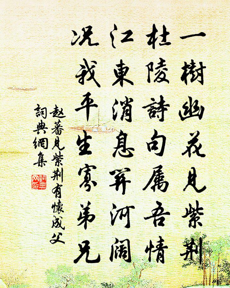 詩詞名句歷史字典書法欣賞書法字典國語詞典說文解字康熙字典古漢語字典標 題 作 者 詩 句 見紫荊有懷成父作者:趙蕃 朝代:宋代見紫荊有懷成父原文一樹幽花見紫荊,杜陵詩句屬吾情。江東訊息關河闊,況我平生寡弟兄。詩詞問答問:見紫荊有懷成父的作者是誰?答:趙蕃問:見紫荊有懷成父寫於哪個朝代?答:宋代趙蕃見紫荊有懷成父書法欣賞見紫荊有懷成父書法作品詩詞推薦九日憶俞若晦章甫〔宋代〕出處殊途會面難,君留湖上我江乾。黃花三度不同醉,白髮數莖尤寡歡。鶚立寥寥天地大,鴻飛漠漠水雲寒。登高次韻董三餘約賞月丹瑞香陳著〔宋代〕老仙平日鏈心丹,荏苒光陰百歲閒。隨分種花供冷眼,逢人留酒有溫顏。乾坤只作醒中夢,風月何妨忙處閒。有約失調名佚名〔宋代〕休休得也□,雲深處、高臥斜陽。自城南濠上步月之葆光韓維〔宋代〕厭踏塵中路,遠尋濠上行。水聲喧夜塹,月色滿春城。{街圭換土}{街圭換土}交遊樂,依依里巷情。優哉不知句佚名〔唐代〕春至偏無興,秋來只是眠。(《閒居》)餞傅理掾劉黻〔宋代〕一郡一理掾,橫浦為之宗。青青草不枯,曾識無極翁。遂寧起鼻祖,陸續書問通。乃今有耳孫,力學追遐蹤。潔靜過陽羅洑項安世〔宋代〕陽羅洑外黃陂路,灄口湖邊孝感河。鉦鼓已通南草市,腥膻欲涴大江波。家家戶外無驚犬,日日轅門有凱歌。端藉冬日可愛(一作陳諷詩)張正元〔唐代〕寒日臨清晝,遼天一望時。未消埋徑雪,先暖讀書帷。屬思光難駐,舒情影若遺。晉臣曾比德,謝客昔言詩。散彩冬至前月赴季父梅花之集與韓蒲向憲唐乾諸人胡寅〔宋代〕的皪凝懷開自尺,風亭微馥許君知。直須藉草傾松葉,絕勝登樓唱竹枝。韓壽香囊難取似,何郎粉面且隨宜。豈知游嶽麓寺三首張嵲〔宋代〕杖策松門興未窮,更過金地雨花中。山泉淅瀝通幽戶,林葉蕭森下晚風。目極平皋方蒼莽,煙深城郭自空濛。他年劉元煇來三首方回〔宋代〕君宅蒲荷岸,吾廬槿菊籬。相望能幾步,不見動逾時。老更甘清苦,閒應笑拙痴。門迎到花底,銜袖有新詩。宋頌趙湘〔唐代〕九區混茫,皇天錫皇。羲教農化,勛紀華彰。繼華於禹,承禹於湯。比於文武,逮其成康。聖道攸傳,富壽無疆。和趙簿題席麻林居士小隱四韻五邁〔宋代〕棋聲響蒼石,茶灶燒枯松。故人惠然來,風竹為先容。野性曠而適,機心疏更慵。生憐謝安石,攜妓污名峰。古行宮章孝標〔唐代〕瓦煙疏冷古行宮,寂寞朱門反鎖空。殘粉水銀流砌下,墮環秋月落泥中。鶯傳舊語嬌春日,花學嚴妝妒曉風。天子飄轉鄭克已〔宋代〕飄轉未歸客,風帆不夜舟。斷雲依水定,薄月帶沙流。香倚黃花岸,心清白露秋。林鴉棲未穩,飛亂北山頭。樂語王義山〔宋代〕閒雲潭影日悠悠。暮倚朱簾更少留。龍壽本齊箕與翼,□從今日,一年一度,東極慶千秋。醉桃源王吉昌〔元代〕暗藏兩曜撫坤乾。綿綿細斡旋。扶持來往貫三田。還元五氣全。河車運,玉爐煎。炎炎結汞鉛。彩霞光襯晃禪天。題周草窗江村小景扇面呂勝之〔宋代〕飛鷺落鳧渚,山花燦如繡。愛閒人不來,柴門掩春晝。示疑者張嵲〔宋代〕天見已如摩勒果,佛求休待缽曇花。萬緣畢竟歸空劫,舉世徒勞算海沙。除幻已超白骨觀,修真閒運紫河車。時人偈頌一百二十三首釋祖欽〔宋代〕集雲一關,似乎等閒。看時容易,透時即難。森羅萬象,從教側目,三世諸佛,迥絕躋攀。一徑古松苔蘚斑。名句推薦後不乏人,榮之方久,賢者自苦亦惠嗣。來俊臣《羅織經·固榮卷第六》 長記海棠開後,正傷春時節李清照《好事近·風定落花深》 春草細還生,春雛養漸成。揭傒斯《畫鴨》 胡沙沒馬足,朔風裂人膚。韋元甫《木蘭歌》 悅其名而喪其實。尹文《尹文子·大道上》 莫失莫忘,仙壽恆昌。曹雪芹《紅樓夢·第八回》 斜日更穿簾幕,微涼漸入梧桐。晏殊《破陣子·燕子欲歸時節》 朔風如解意,容易莫摧殘。崔道融《梅花》 思君如流水,何有窮已時。徐幹《室思》 家家乞巧望秋月,穿盡紅絲幾萬條。林傑《乞巧》