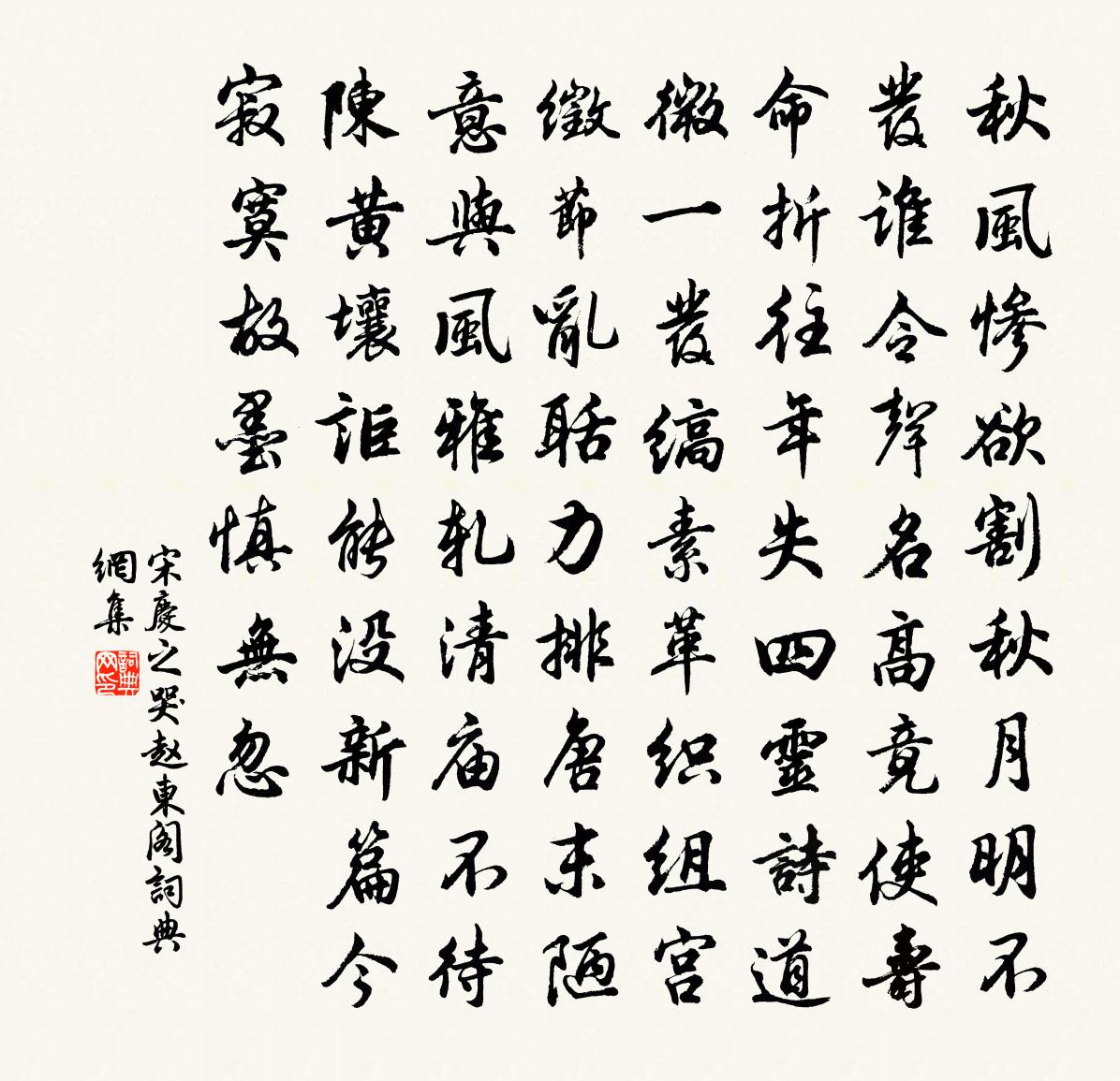 詩詞名句歷史字典書法欣賞書法字典國語詞典說文解字康熙字典古漢語字典標 題 作 者 詩 句 哭趙東閣作者:宋慶之 朝代:宋代哭趙東閣原文秋風慘欲割,秋月明不發。誰令聲名高,竟使壽命折。往年失四靈,詩道微一發。縞素革織組,宮徵節亂聒。力排唐末陋,意與風雅軋。清廟不待陳,黃壤詎能沒。新篇今寂寞,故墨慎無忽。詩詞問答問:哭趙東閣的作者是誰?答:宋慶之問:哭趙東閣寫於哪個朝代?答:宋代宋慶之哭趙東閣書法欣賞哭趙東閣書法作品詩詞推薦月石吳頤〔宋代〕嫦娥促輕車,翩翩下瑤城。窮幽得靈山,意欲家平生。隳石擬素魄,神功夜無聲。佳桂願托根,老兔祈偕行。上帝題經樓語釋印肅〔宋代〕般若貫華嚴,涅槃通寶積。迷則龍宮海藏,悟則一字不識。教演三伯余會,度人無數百億。如今滿目放光明,十二早朝書事司馬光〔宋代〕太白明如李,東方三丈高。晨光孤照闕,霧氣濕侵袍。槐柳經霜慘,驊騮得路豪。素飧無小補,府仰愧金鰲。村莊即事耕吳〔宋代〕菊過重陽尚吐香,晚秋風景屬村莊。日羹野菜同妻飯,時傅鄰篘對客觴。霜後樹枝多老醜,雨餘山色半微茫。近來庵中雜書陸游〔宋代〕茅茨一室有餘樂,轍環四海誰知心?輟耕壟上鴻鵠志,長嘯山中鸞鳳音。和秦奉之題蘄春驛浸月軒王之道〔宋代〕千山初過雨,萬籟不鳴風。寶鑑沉寒水,冰輪上太空。竹梢低蘸碧,楓葉冷浮紅。終欲金沙去,經營一畝宮。題耕織圖二十四首奉懿旨撰趙孟頫〔元代〕冬至陽來復,草木漸滋萌。君子重其然,吾道自此亨。父母坐堂上,子孫列前榮。再拜稱上壽,所願百福並。人生池亭獨坐李彌遜〔宋代〕物華苒苒競芳新,六月紅蕖自作春。走馬看花傳好句,長梯摘實賴幽人。雨餘門巷無留客,月上池台絕過塵。為約晚投慈恩寺呈俊上人許渾〔唐代〕雙岩瀉一川,十里絕人煙。古廟陰風地,寒鍾暮雨天。沙虛留虎跡,水滑帶龍涎。不及曹溪侶,空林已夜禪。鷓鴣天(霜夜)趙長卿〔宋代〕門外寒江泊小船。月明留客小窗前。夜香燒盡更聲遠,斗帳低垂暖意生。醺著酒,炙些燈。伴他針線懶成眠。情知大滿禪師贊釋慧開〔宋代〕再出頭來滿面塵,那堪喜舌興搖唇。松枯石爛憑誰委,累及痴呆蹈碓人。殘春獨來南亭因寄張祜杜牧〔唐代〕暖雲如粉草如茵,獨步長堤不見人。一嶺桃花紅錦黦,半溪山水碧羅新。高枝百舌猶欺鳥,帶葉梨花獨送春。仲蔚名利吟邵雍〔宋代〕重之以名,見人之情。厚之以利,見人之意。情意內也,內重則外輕。名利外也,內賤則外貴。庵中獨居感懷陸游〔宋代〕自閉庵門不點燈,惰耕村叟罷參僧。一生已是膠黏日,投老安能夏造冰?頑面敢辭乾汝唾,蔬餐聊得曲吾肱。高舂寄長沙燕守度鄭獬〔宋代〕魏都南館相逢日,鬧向春風倒一尊。連夜花開駐歸騎,即時席上插降旛。雲藏夢澤煙蒲老,秋卷湘江雪浪翻。聞道次韻答樊山 其二王冕〔元代〕功名多跋涉,貧賤得安閒。坐石聽流水,開樓見遠山。報衙蜂澒洞,悅景鳥綿蠻。更愛斜陽外,游雲作陣還。句宋祁〔宋代〕要待花餘見秋實,縹肌細肉薦盤珍。調李教授李復〔宋代〕君不見屈平放逐南辭楚,憔悴行吟並江浦。一聞鼓枻笑獨醒,搔首低回愧漁父。又不見淵明鼓澤投簪纓,退隱衡門車制華岳〔宋代〕昔年劉震帥池陽,曾制輕車學運糧。獨輻不堪承重向,至今零落在行廓。留題石經院三首蘇轍〔宋代〕盤曲山前路,流年向此消。興亡須一吊,范叟臥山腰。名句推薦釀泉為酒,泉香而酒洌;歐陽修《醉翁亭記》 向來吟秀句,不覺已鳴鴉。韓翃《酬程延秋夜即事見贈》 送行無酒亦無錢,勸爾一杯菩薩泉。蘇軾《武昌酌菩薩泉送王子立》 問弄雪飄枝,無雙亭上,何日重遊。鄭覺齊《揚州慢·瓊花》 野臣潛隨擊壤老,日下鼓腹歌可封。鮑防《元日早朝行》 事有所出,功有所止。劉向《戰國策·趙二·武靈王平晝閒居》 岸邊兩兩三三,浣沙游女。柳永《夜半樂·凍雲黯淡天氣》 老柘葉黃如嫩樹,寒櫻枝白是狂花。白居易《早冬》 不似天涯,捲起楊花似雪花。蘇軾《減字木蘭花·立春》 撥雪尋春,燒燈續晝。暗香院落梅開後。毛滂《踏莎行·元夕》