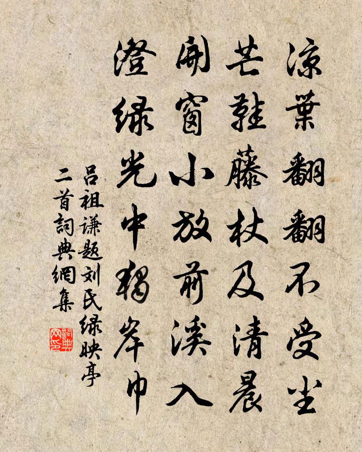 詩詞名句歷史字典書法欣賞書法字典國語詞典說文解字康熙字典古漢語字典標 題 作 者 詩 句 題劉氏綠映亭二首作者:呂祖謙 朝代:宋代題劉氏綠映亭二首原文涼葉翻翻不受塵,芒鞋藤杖及清晨。開窗小放前溪入,澄綠光中獨岸巾。詩詞問答問:題劉氏綠映亭二首的作者是誰?答:呂祖謙問:題劉氏綠映亭二首寫於哪個朝代?答:宋代呂祖謙題劉氏綠映亭二首書法欣賞題劉氏綠映亭二首書法作品詩詞推薦觀荷方岳〔宋代〕紅紅白白兩娉婷,一種風流各黃刑。紅亦非紅白非白,阿嬌微醉阿環醒。和胡端約岩桂六首蔡戡〔宋代〕薔薇清露染衣裳,綽約仙姿淡淡妝。碧玉參差張翠幄,黃金錯落綴珠璫。和過張祜處士丹陽故居陸龜蒙〔唐代〕勝華通子共悲辛,荒徑今為舊宅鄰。一代交遊非不貴,五湖風月合教貧。魂應絕地為才鬼,名與遺編在史臣。聞道晚次臨涇喻鳧〔唐代〕路入犬羊群,城寒雉堞曛。居人只尚武,過客謾投文。馬怯奔渾水,雕沈莽蒼雲。沙田積蒿艾,竟夕見燒焚。寄趙宣教釋寶曇〔宋代〕卻立群峰北望看,斷虹飛雨即家山。一時別舸惟公在,半世清游比夢閒。卜築未嫌身老大,著書先怯眼斕斑。湖西酬楊給事兼見贈台中沈佺期〔唐代〕子云推辨博,公理擅詞雄。始自尚書省,旋聞給事中。言從溫室秘,籍向瑣闈通。顧我叨郎署,慚無草奏功。分曹山月池朱應龍〔宋代〕池底看明月,明月在山頭。清光連上下,分作兩輪秋。偈頌一百零二首釋紹曇〔宋代〕入荒田不揀,信手拈來草。緯地與經天,頭頭俱是妙。打成一片見全功,碧眼黃頭俱靠倒。豈不見長慶棱道者坐破眉州郡圃種稚柏三千李石〔宋代〕三千稚翠繞池亭,他日摩挲考歲星。為語邦人須耐久,春紅何必似冬青。和臘前梅堯臣〔宋代〕漢家戍日看看近,雲景蒼茫已歲昏。欲驗方書治百藥,預調飛走獵平原。土人燻肉經春美,宮女藏鉤舊戲存。獨把書雲萍錄張煒〔宋代〕聚若浮萍散若雲,江湖姓氏總相聞。何煩爵里重鋪敘,只倩梅花舉似君。元符祀感生帝五首佚名〔宋代〕俯臨下土,回復上天。觸類而長,荷福無邊。武夷山仙城徐凝〔唐代〕武夷無上路,毛徑不通風。欲共 * 住,仙城半在空。夢上天(此後十首,並和劉猛)元稹〔唐代〕夢上高高天,高高蒼蒼高不極。下視五嶽塊累累,仰天依舊蒼蒼色。蹋雲聳身身更上,攀天上天攀未得。西瞻若水雲海亭俞灝〔宋代〕戀戀欄乾雲復留,恍然天地與身浮。水涵空界光無際,山在地州翠欲流。點破琉璃雲表雁,足成圖畫柳邊舟。歲闌首尾吟邵雍〔宋代〕堯夫非是愛吟詩,詩是堯夫曠望時。一片園林擁京國,幾層樓觀犯雲霓。朝昏天氣屢變易,今古人情旋合離。欲問游東林寺黃滔〔唐代〕長生猶自重無生,言讓仙祠佛寺成。碑折誰忘康樂制,山靈表得遠公名。松形入漢藤蘿短,僧語離經耳目清。莫怪紀愁晃沖之〔宋代〕北風吹我裳,夏潦漂我屋。牛羊踐我稼,雀鼠耗我谷。雪寒附我指,雨 * 疾我腹。朝行桑榆間,秋序傷遠目。莫信筆方蒙仲〔宋代〕筆床茶灶答蛩吟,搖落秋風萬里心。白髮蕭蕭酒初醒,一龕鐙火四更深。留鶴江有感陳允平〔宋代〕抱玉歸來淚滿襟,世間何許覓知音。此生雖有噬臍悔,到死終無嘗膽心。伏櫪馬思雲路遠,避鉤魚隱石潭深。故人名句推薦遊人日暮相將去,醒醉喧譁。歐陽修《採桑子·清明上巳西湖好》 世人解聽不解賞,長飆風中自來往。李頎《聽安萬善吹觱篥歌》 記問之學,不足以為人師。戴聖《禮記·學記》 春雪滿空來,觸處似花開。東方虬《春雪》 西門秦氏女,秀色如瓊花。李白《秦女休行》 貧無可奈惟求儉,拙亦何妨只要勤。王永彬《圍爐夜話·第三則》 紛紛世事無窮盡,天數茫茫不可逃。羅貫中《三國演義·第一百二十回》 馬駭輿,則君子不安輿;庶人駭政,則君子不安位。荀子《荀子·王制》 其出彌遠,其知彌少。老子《老子·德經·第四十七章》 兩句三年得,一吟雙淚流。賈島《題詩後》