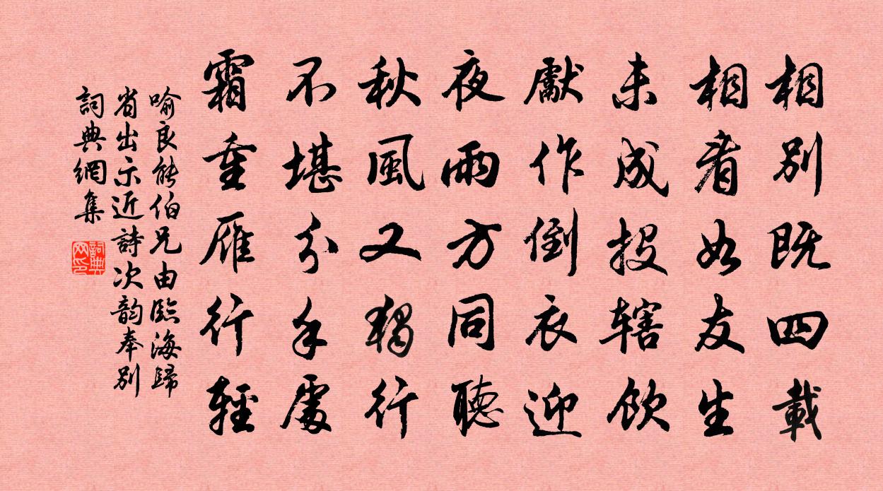 詩詞名句歷史字典書法欣賞書法字典國語詞典說文解字康熙字典古漢語字典標 題 作 者 詩 句 伯兄由臨海歸省出示近詩次韻奉別作者:喻良能 朝代:宋代原文相別既四載,相看如友生。未成投轄飲,先作倒衣迎。夜雨方同聽,秋風又獨行。不堪分手處,霜重雁行輕。詩詞問答問:《伯兄由臨海歸省出示近詩次韻奉別》的作者是誰?答:喻良能問:該詩寫於哪個朝代?答:宋代書法欣賞伯兄由臨海歸省出示近詩次韻奉別書法作品詩詞推薦聞蛙二首宋祁〔宋代〕蛙聲直可厭,聒耳橫相干。怒氣何關勇,私鳴不為官。喜遷鶯馮延巳〔唐代〕宿鶯啼,鄉夢斷,春樹曉朦朧。殘燈吹燼閉朱櫳,人語隔屏風。香已寒,燈已絕,忽憶去年離別。石城花雨倚江樓武威送劉判官赴磧西行軍岑參〔唐代〕火山五月行人少,看君馬去疾如鳥。都護行營太白西,角聲一動胡天曉。奉和魯望樵人十詠樵風皮日休〔唐代〕野船渡樵客,來往平波中。縱橫清飆吹,旦暮歸期同。蘋光惹衣白,蓮影涵薪紅。吾當請封爾,直作鏡湖公。頌古三十八首釋從瑾〔宋代〕一喝兩喝,全機出沒。賓主歷然,未免俱瞎。半夜摸烏龜,明月照積雪。汴河黃庶〔宋代〕汴都峨峨在平地,宋恃其德為金湯。先帝始初有深意,不使子孫生怠荒。萬艘北來食京師,汴水遂作東南吭。甲兵寄題真希元毋自欺齋陳宓〔宋代〕本來真是與真非,只為因循逐物移。當面雷同還自笑,此心機動已天知。窮通有命寧由我,邪正唯人更問誰。委曲十二時歌釋印肅〔宋代〕日出卯,齋粥無□心覺飽。缽盂洗了自閒閒,方信趙州機便巧。師子見,全牙爪,驚殺百年老虎豹。捏怪文殊劈腦故次政殿大學士樞密洪公輓詞二首韓元吉〔宋代〕世學推東楚,文名冠異科。弟兄聯玉筍,父子擅金坡。籌幄淵謀在,陪京惠愛多。無因奠雞酒,清淚灑江波。嘲解十首王邁〔宋代〕一相當朝總百官,升沉只在笑談間。及門炙手趨炎火,傾國將身靠泰山。子獨何人蜉撼樹,眾皆重足虎當關。仙舟登牛者蛾眉亭二首楊萬里〔宋代〕謪仙攜妓戲人寰,也被千花妒玉顏。半點閒情千古恨,一波秋水兩春山。錦袍宮燭雲霄上,白薴烏紗江海間。欲寄靜女佚名〔先秦〕靜女其姝,俟我於城隅。愛而不見,搔首踟躕。靜女其孌,貽我彤管。彤管有煒,說懌女美。自牧歸荑,洵美且異寶祐二年皇子冠二十首佚名〔宋代〕有來振振,月重輪兮。瑜玉在佩,綦組明兮。左徽在羽,德結旌兮。步中采齊,矩彠循兮。句朱翌〔宋代〕經年不濯子春足,半月才梳叔夜頭。送張丞歸平江吳儆〔宋代〕來何遲暮去何忙,不道離人慾斷腸。清節如君誰可繼,遺風他日愈難忘。鱸肥酒熟歸時好,水綠山青去興長。便恐雲安玉虛觀南軒感事偶書五首杜柬之〔宋代〕二儀鼓爐鞴,四山塞氣煙。豈惟草木焦,坐恐土石然。巴峽再不登,逡巡又無年。流殍竟何歸,卒死填溝淵。哆吻端午帖子太上皇后閣周必大〔宋代〕池藥風煙淨,壺天日月長。寶書繙蕊笈,碧穗裊爐香。過亡友墓馬戴〔唐代〕憶昨送君葬,今看墳樹高。尋思後期者,只是益生勞。地遠釋文珦〔宋代〕地遠隔凡塵,因而此隱淪。閒知雲意度,清愛水精神。蔬食聊充腹, * 足蔽身。休嫌吾懶拙,懶拙廻吾真。倒犯方千里〔宋代〕盡日、任梧桐自飛,翠階慵掃。閒雲散縞。秋容瑩、暮天清窈。斜陽到地,樓閣參差簾櫳悄。嫩袖舞涼颸,拂拂生名句推薦海闊山遙,未知何處是瀟湘柳永《玉蝴蝶·望處雨收雲斷》 莫道桑榆晚,為霞尚滿天。劉禹錫《酬樂天詠老見示》 翠葉吹涼,玉容消酒,更灑菇蒲雨。姜夔《念奴嬌·鬧紅一舸》 自誠明,謂之性;自明誠,謂之教。子思《中庸·第二十一章》 荷葉生時春恨生,荷葉枯時秋恨成。李商隱《暮秋獨游曲江》 君子安禮樂利,謹慎而無斗怒,是以百舉而不過也。荀子《荀子·臣道》 江上旗亭,送君還是逢君處吳大有《點絳唇·送李琴泉》 君看石芒碭,掩淚悲千古李白《丁督護歌》 少小離家老大回,鄉音無改鬢毛衰。賀知章《回鄉偶書二首·其一》 女兒年幾十五六,窈窕無雙顏如玉。蕭衍《東飛伯勞歌》