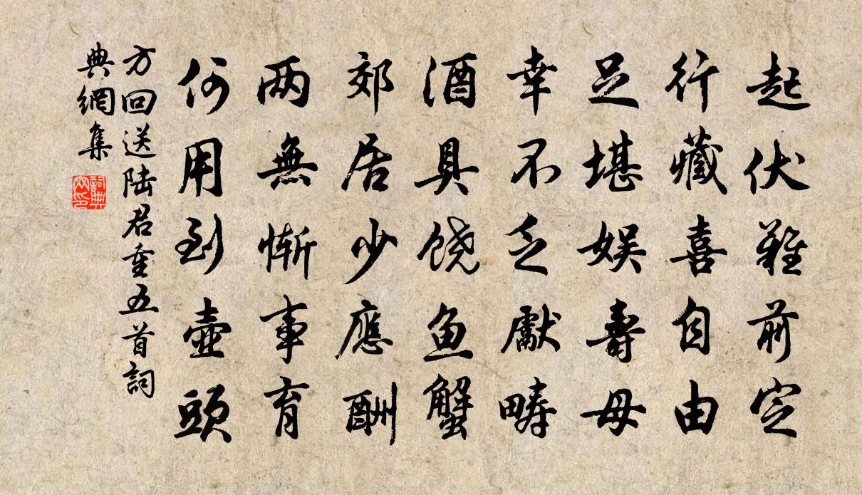詩詞名句歷史字典書法欣賞書法字典國語詞典說文解字康熙字典古漢語字典標 題 作 者 詩 句 送陸君重五首作者:方回 朝代:宋代送陸君重五首原文起伏難前定,行藏喜自由。足堪娛壽母,幸不乏先疇。酒具饒魚蟹,郊居少應酬。兩無慚事育,何用到壺頭。詩詞問答問:送陸君重五首的作者是誰?答:方回問:送陸君重五首寫於哪個朝代?答:宋代方回送陸君重五首書法欣賞送陸君重五首書法作品詩詞推薦留題顯聖寺蘇軾〔宋代〕渺渺疏林集晚鴉,孤村煙火梵王家。幽人自種千頭橘,遠客來尋百結花。浮石已乾霜後水,焦坑閒試雨前茶。只疑紹興別廟樂歌五首真宗〔宋代〕仙馭弗返,眇邈清都。肆此嘉肴,既豐既腴。奠享有成,鼓樂愉愉。入我豆籩,率禮無逾。立春日陸游〔宋代〕慶元丁巳春來晚,人日初過近上元。空對一樽三太息,無人為戴縷金旛!滿江紅(送王實之)劉克莊〔宋代〕天壤王郎,數人物、方今第一。談笑里、風霆驚座,雲煙生筆。落落元龍湖海氣,琅琅董相天人策。問如何、十載五月二十一日風雨大作陸游〔宋代〕風雨縱橫夜徹明,須臾更覺勢如傾。出門已絕近村路,對面不聞高語聲。銜舳江關多蜀估,宿師淮浦飽吳粳。老民次前韻謝胡運屬二首陳造〔宋代〕爐煙褭褭上晴絲,伴閱長須送似詩。眼著昏花予已老,句鏘哀玉子能奇。隨人趨步庸非俗,取意妝梳自入時。大手贈姜邦傑潘檉〔宋代〕詩人擁節古來稀,今見梅山際盛時。傳世篇章紅錦爛,去天門戶碧油垂。風霜氣老同陳柏,亭館花開對蜀葵。應記攤破浣溪沙·揉破黃金萬點輕李清照〔宋代〕揉破黃金萬點輕,剪成碧玉葉層層。風度精神如彥輔,太鮮明。梅蕊重重何俗甚,丁香千結苦粗生。熏透愁人千里晚晴四首趙蕃〔宋代〕五日舟行雨間晴,晚逢寒日上晴林。山因絕翳修眉展,水得無風墜鏡深。可恨飄零獨南北,不如水鳥共浮沈。向來光孝寺作茶供方岳〔宋代〕一藤碎踏兩山雲,看盡朝嵐與夕曛。留得如來捨身相,共敲蒼雪了爐熏。訪陳二白居易〔唐代〕曉垂朱綬帶,晚著白綸巾。出去為朝客,歸來是野人。兩餐聊過日,一榻足容身。此外皆閒事,時時訪老陳。送暢當赴山南幕盧綸〔唐代〕含情脫佩刀,持以佐賢豪。是月霜霰下,伊人行役勞。事將名共易,文與行空高。去矣奉戎律,悲君為我曹。句宋祁〔宋代〕曉日侵簾押,春寒到被池。題江心寺翁卷〔宋代〕名與金山並,僧言景更幽。寺無雙嶼近,地占一江浮。曾是龍為宅,還疑蜃吐樓。他鄉遠歸者,望此得停舟。除夕王邁〔宋代〕憶昔都門值歲除,高樓張燭戲呼盧。久依淨社參尊宿,難向新豐認酒徒。天子未知工劃賦,鄰人或倩寫桃符。寒宵和四二侄用林道叟見寄字韻吳芾〔宋代〕華發蕭蕭日夜疏,賓士不止欲何如。得拋印綬心方適,歸見湖山氣始舒。世事轉頭如蝶夢,人生到此似蘧廬。我今采詩官-監前王亂亡之由也白居易〔唐代〕采詩官,采詩聽歌導人言。言者無罪聞者誡,下流上通上下泰。周滅秦興至隋氏,十代采詩官不置。郊廟登歌贊君句王灣〔唐代〕月華照杵空隨妾,風響傳砧不到君。(見《河嶽英靈集》)朝中措(為人壽)辛棄疾〔宋代〕年年金蕊艷西風。人與菊花同。霜鬢經春重綠,仙姿不飲長紅。焚香度日盡從容。笑語調兒童。一歲一杯為壽,從送人赴倉台許應龍〔宋代〕帝念畿甸民,財力俱有限。俗吏肆貪殘,侵漁盪貲產。致治在得賢,刺史尤當揀。明公如范滂,清節邁楊綰。疏寵名句推薦雪花全似梅花萼。細看不是雪無香,天風吹得香零落。王旭《踏莎行·雪中看梅花》 望極春愁,黯黯生天際。柳永《蝶戀花·佇倚危樓風細細》 池台竹樹三畝餘,至今人道江家宅。劉禹錫《金陵五題·並序》 世業事黃老,妙年孤隱淪宋之問《始安秋日》 魯女東窗下,海榴世所稀。李白《詠鄰女東窗海石榴》 不管三七二十一馮夢龍《醒世恆言·卷一》 日射紗窗風撼扉,香羅拭手春事違。李商隱《日射》 黃河九天上,人鬼瞰重關。元好問《水調歌頭·賦三門津》 君子必在己者,不必在人者也。呂不韋《呂氏春秋·覽·孝行覽》 及茲春未深,數畝猶足佃。王守仁《謫居糧絕請學於農將田南山詠言寄懷》