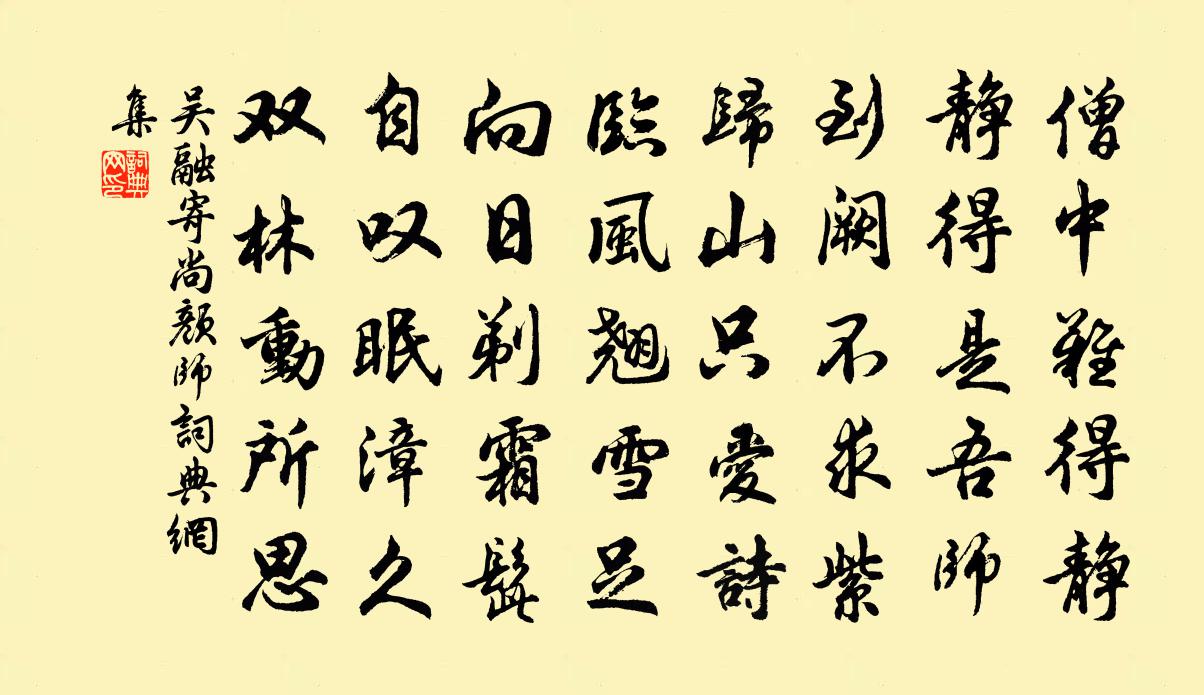 詩詞名句歷史字典書法欣賞書法字典國語詞典說文解字康熙字典古漢語字典標 題 作 者 詩 句 寄尚顏師作者:吳融 朝代:唐代寄尚顏師原文僧中難得靜,靜得是吾師。到闕不求紫,歸山只愛詩。臨風翹雪足,向日剃霜髭。自嘆眠漳久,雙林動所思。詩詞問答問:寄尚顏師的作者是誰?答:吳融問:寄尚顏師寫於哪個朝代?答:唐代問:寄尚顏師是什麼體裁?答:五律吳融寄尚顏師書法欣賞寄尚顏師書法作品注釋全唐詩:卷685-7詩詞推薦用前韻答車玉峰王柏〔宋代〕人物如君屹鼎湖,高山仰止我儀圖。講篇損益開新式,略紀刪修有定模。目斷交情殊恨闊,心涵古道岩相符。去年天津橋汪元量〔宋代〕白楊獵獵柳青青,怒浪高低不肯平。一自堯夫分手後,更無人聽杜鵑聲。絕句蔣堂〔宋代〕歸來深隱太湖濱,天與扶持百歲身。雖是浮雲隔雙闕,丹心愛戴在君親。書黁公詩後(並敘)蘇軾〔宋代〕過加祿鎮南二十五里大許店,休焉於逆旅祁宗祥家。見壁上有幅紙題詩云:滿院秋光濃欲滴,老僧倚杖青松側。只偈傾一百六十九首釋智朋〔宋代〕北郁單越,西瞿耶尼。有利無利,不離行市。韓蘄王夫人楊維楨〔元代〕巫家卜偶不為嫌,優女占夫事更堅。 看取異時真畏友,九重書上議黃天。 北歸至廬陵過州學前記認舊遊嘆同舍之半不在曾豐〔宋代〕久落殊鄉今始回,學門未改舊崔嵬。交遊髭鬢綠成白,齋館檐楹朱上煤。同舍無多登仕路,連年已半入泉台。閽人臨江仙山主〔元代〕見了教人情慘切,回頭別覓真修。逢師悲願話根由。遠離苦海,親得盤舟。跳出火宅三界外,四衢露地白牛。隨身瓦店雨作四首楊萬里〔宋代〕詩人長怨沒詩材,天遣斜風細雨來。領了詩材還又怨,問天風雨幾時開。杏花王禹偁〔宋代〕長愁風雨暗離披,醉遶吟攪得幾時。唯有流鶯偏稱意,夜來偷宿最繁枝。山中得劉秀才京書施肩吾〔唐代〕自笑家貧客到疏,滿庭菸草不能鋤。今朝誰料三千里,忽得劉京一紙書。對琴酒白居易〔唐代〕西窗明且暖,晚坐卷書帷。琴匣拂開後,酒瓶添滿時。角樽白螺盞,玉軫黃金徽。未及彈與酌,相對已依依。冷冷萬年歡(壽兩國夫人胡氏)丁察院〔宋代〕葛井丹明,西來金母,霓旌雲旆。移下瑤池,竹外一壺秋水。菊□香留宿醉。看後夜、冰輪滿桂。貂蟬映、虹玉稱朱郎元章以予不得宮觀與諸侄有唱和見寄攬之晁說之〔宋代〕狂醉何為號八仙,三郎宮裡亦頹然。呼山絳節方無數,犯闕紅旗自有緣。便醉攜家船上去,已輸傍舍瓮頭眠。箕南雲朔逢山友張蠙〔唐代〕會面卻生疑,居然似夢歸。塞深行客少,家遠識人稀。戰馬分旗牧,驚禽曳箭飛。將軍雖異禮,難便脫 * 。偈頌一百零一首釋慧性〔宋代〕韶陽一曲自高歌,困來一覺和衣倒。淺種深耕得自由,珊瑚枝頭日杲杲。金剛隨機無盡頌法界通花分第十九釋印肅〔宋代〕法界是檀那,人天福德魔。力盡箭還墜,依前入愛河。賀鄧璠使君正拜袁州彭蟾〔唐代〕六年惠愛及黎甿,大府論功俟陟明。尺一詔書天上降,二千石祿世間榮。新添畫戟門增峻,舊躡 * 轉平。更待送友人下第歸吳劉滄〔唐代〕共惜年華未立名,路岐終日軫羈情。青春半是往來盡,白髮多因離別生。楚岸帆開雲樹映,吳門月上水煙清。東歸金縷曲(絕江觀桃,座間和韻)劉辰翁〔宋代〕問何年種植。獨成蹊、穠華爛漫,錦開千步。花下老人猶記我,不似那回賞處。並吹卻、道邊謝墅。黃四娘家今何名句推薦夕陽西下,斷腸人在天涯。馬致遠《天淨沙·秋思》 蒂有餘香金淡泊,枝無全葉翠離披。曹雪芹《殘菊》 想子胥今夜見嫦娥,沉冤雪。史達祖《滿江紅·中秋夜潮》 念故人,千里至此共明月。寇準《踏莎行·寒草煙光闊》 我心匪石,不可轉也。佚名《柏舟》 解釋春風無限恨,沉香亭北倚闌乾。李白《清平調·其三》 歌沉玉樹,古寺空有疏鍾發。李綱《六么令·次韻和賀方回金陵懷古鄱陽席上作》 千古興亡多少事?悠悠。辛棄疾《南鄉子·登京口北固亭有懷》 天憐客子鄉關遠。借與花消遣。蔣捷《虞美人·梳樓》 好風憑藉力,送我上青雲。曹雪芹《臨江仙·柳絮》