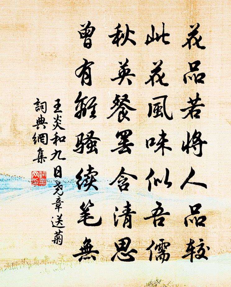 詩詞名句歷史字典書法欣賞書法字典國語詞典說文解字康熙字典古漢語字典標 題 作 者 詩 句 和九日堯章送菊作者:王炎 朝代:宋代和九日堯章送菊原文花品若將人品較,此花風味似吾儒。秋英餐罷含清思,曾有離騷續筆無。詩詞問答問:和九日堯章送菊的作者是誰?答:王炎問:和九日堯章送菊寫於哪個朝代?答:宋代王炎和九日堯章送菊書法欣賞和九日堯章送菊書法作品詩詞推薦滿庭芳·夏日溧水無想周邦彥〔宋代〕風老鶯雛,雨肥梅子,午陰嘉樹清圓。地卑山近,衣潤費爐煙。人靜烏鳶自樂,小橋外、新綠濺濺。憑闌久,黃蘆屺瞻道中馬廷鸞〔宋代〕蓐食需明出遠村,筍輿咿軋睡昏昏。禾麻豐歲雲連畝,風露高秋水落痕。清曉跨鞍兒從父,當年戲彩母憐孫。白頭君俞惠詩覓洛中所得大金菊輒次韻酬二篇韓維〔宋代〕禪老心真異眾心,不緣歌舞費黃金。春芳落盡慵開眼,豫乞寒花伴苦吟。里人俞退翁自號南山南菊逸賞賦詩以道其志繼汪炎昶〔宋代〕山人舊隱南山南,家具惟存賦詩筆。翁浮清醖夜□雲,菊泛寒香秋滿堂。模放已逼東籬真,經營況似南村宅。懶從上留田行曹丕〔魏晉〕居世一何不同。上留田。富人食稻粱。上留田。貧子食糟與糠。上留田。貧賤亦何傷。上留田。祿命懸在蒼天。上山中呈聶心遠諸客文天祥〔宋代〕誰入山來問野舟,一篙花外渡深流。小顰風樹蹁躚鶴,淺約湍沙浩蕩鷗。湖上有時思洛社,人間何處不滁州。徘徊句釋曉瑩〔宋代〕漏鼓乍聽連岸響。樓頭歐陽修〔宋代〕百尺樓頭萬疊山,楚江南望隔晴煙。雲藏白道天垂幕,簾卷黃昏月上弦。桑落蒲城催熟酒,柳衰章陌感凋年。發光贈姚合張籍〔唐代〕丹鳳城門向曉開,千官相次入朝來。唯君獨走沖塵土,下馬橋邊報直回。哭張文翁同舍趙文〔宋代〕豈意渴相如,俄為化子輿。平生一杯酒,活計百篇書。同舍遂欲盡,吾生不願餘。如今念夫子,痛飲未全疏。扶上蕭長公來訪示以諸公詩卷謂與予游從之不久不劉學箕〔宋代〕生平不願為傭書,亦不願作章句儒。酒酣詩成吐素霓,意氣凜凜吞千夫。前年排雲叫閶闔,出門一夜車四角。去年偈頌二百零五首釋正覺〔宋代〕去時還復似來時,明月蘆華夜不迷。轉棹又歸何處去,秋光目斷水天低。雲岩樓鑰〔宋代〕但見雲生谷,初無石似岩。得名非舊觀,買地作精藍。境勝環修竹,門深擁翠杉。禪林自家處,莫問後三三。命子 其九陶淵明〔魏晉〕厲夜生子,遂而求火。凡百有心,奚特於我!既見其生,實欲其可。人亦有言,斯情無假。風入松 題石壇道士焚香沈禧〔元代〕暮雲收盡紫霄寬。灝氣襲衣冠。清泉白石長為伍,松頭露、冷滴方壇。此際千林影斷,於時萬籟聲乾。道人星下禮江村晚望釋斯植〔宋代〕保處問歸程,滄茫入句清。雲生峰頂白,月近水邊明。芳草連平楚,晴樓出遠城,此身南北外,漁火是閒情。頌古釋道顏〔宋代〕種穀不生豆苗,蒸砂豈能成飯。大通智勝如來,一個擔板底漢。蝶戀花(寧都半歲歸家,欲別去而意終不決也)趙長卿〔宋代〕葉底蜂衙催日晚。向晚勻妝,巧畫宮眉淺。翠幕無風香自遠。金船酌酒須教滿。未說別離魂已斷。雨幌雲屏,只恐句諶祜〔宋代〕此情消遣終難去,無路追尋豈是愚。貧甚戲作絕句陸游〔宋代〕糴米歸遲午未炊,家人竊閔乃翁飢。不知弄筆東窗下,正和淵明乞食詩。名句推薦玉座猶寂寞,況乃妾身輕。謝朓《同謝諮議詠銅雀台》 青青子衿,悠悠我心。佚名《子衿》 風雨牢愁無著處,那更寒蛩四壁。文天祥《酹江月·和友驛中言別》 秋霜不惜人,倏忽侵蒲柳。李白《長歌行》 尺幅鮫鮹勞解贈,叫人焉得不傷悲。曹雪芹《紅樓夢·第三十四回》 昔年多病厭芳尊,今日芳尊惟恐淺。錢惟演《木蘭花·城上風光鶯語亂》 射有似乎君子。失諸正鵠,反求諸其身。子思《中庸·第十四章》 去好去惡,臣乃見素;去舊去智,臣乃自備。韓非及後人《韓非子·主道》 惟有今宵,皓彩皆同普。郭應祥《醉落魄·丙寅中秋》 以小人之慮,度君子之心。劉義慶《世說新語·雅量》