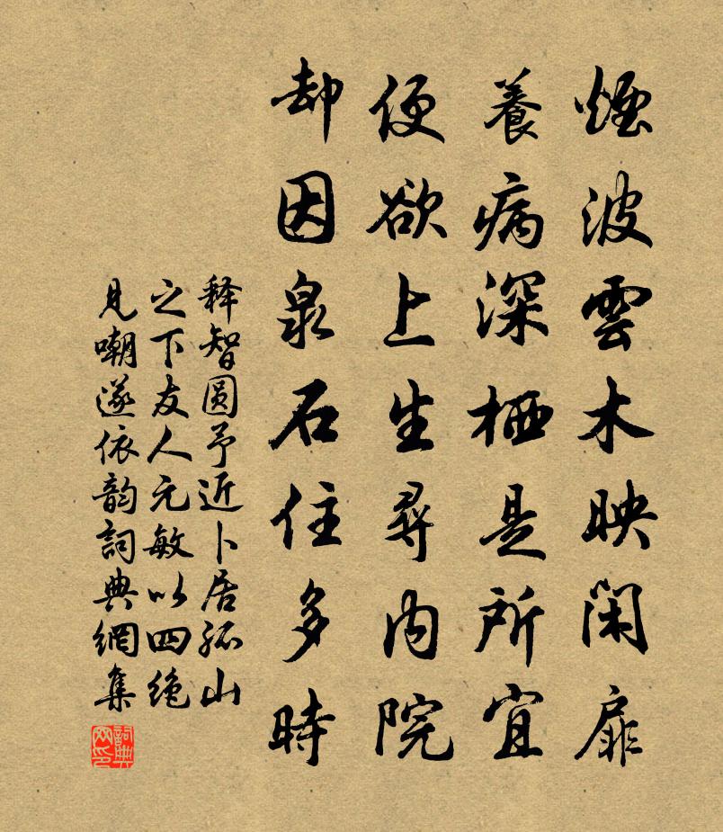 詩詞名句歷史字典書法欣賞書法字典國語詞典說文解字康熙字典古漢語字典標 題 作 者 詩 句 予近卜居孤山之下友人元敏以四絕見嘲遂依韻作者:釋智圓 朝代:宋代原文煙波雲木映閒扉,養病深棲是所宜。便欲上生尋內院,卻因泉石住多時。詩詞問答問:《予近卜居孤山之下友人元敏以四絕見嘲遂依韻》的作者是誰?答:釋智圓問:該詩寫於哪個朝代?答:宋代書法欣賞予近卜居孤山之下友人元敏以四絕見嘲遂依韻書法作品詩文賞析【原題】:予近卜居孤山之下友人元敏以四絕見嘲遂依韻和酬詩詞推薦還神岡圓首座戒刀頌黃庭堅〔宋代〕平生受用,三尺吹毛。歡喜斬新,拾得孟勞。夢中喚起,猶自忉忉。我王庫中,無如是刀雜詩二首曹丕〔魏晉〕漫漫秋夜長,烈烈北風涼。展轉不能寐,披衣起彷徨。彷徨忽已久,白露沾我裳。俯視清水波,仰看明月光。天漢江行書事劉滄〔唐代〕遠渚蒹葭覆綠苔,姑蘇南望思裴徊。空江獨樹楚山背,暮雨一舟吳苑來。人度深秋風葉落,鳥飛殘照水煙開。寒潮錢陳群故詩以志惜乾隆〔清代〕沈去錢存勢已孤,陡觀遺奏故人無。江南忽爾失二老,天子原非友匹夫。蒙邑應成蝶醒夢,香山那復鹿重扶。詩郵永壽縣太君周氏輓辭二首王安石〔宋代〕永壽開新邑,長沙返舊塋。金葩冷鈿軸,粉字暗銘旌。薤久露難濕,蘭餘風尚清。慶鍾知有在,令子合升卿。與趙陳同過歐陽叔弼新治小齋戲作蘇軾〔宋代〕江湖渺故國,風雨傾舊廬。東來三十年,愧此一束書。尺椽亦何有,而我常客居。羨君開此室,容膝真有餘。拊床頌古十七首釋大觀〔宋代〕客泛靈槎犯鬥牛,銀河碧海暗通流。崑崙推倒無依倚,萬里長空一樣秋。和劉後村梅花百詠方蒙仲〔宋代〕西湖已死猶名世,東閣更佳何與人。但得心傳清白事,不須足踏軟紅塵。次韻王龜齡大著省中黃梅周必大〔宋代〕化工未幻酴醾菊,先放細梅伴群玉。幽姿著意慕鉛黃,正色何心輕萼綠。妝成自淺風味深,對此寧辭食無肉。可憐幕官相約觀芳草於法曹之亭黃宰病不至以詩來洪咨夔〔宋代〕似無細雨還應有,欲落余花更復留。草際水邊青未了,可禁杯酒為扶頭。上慧力寺鄒登龍〔宋代〕今代空王宅,前朝處士家。牛車回象藏,鹿苑發龍華。松密風生樹,江空月在沙。闍黎飯鍾後,邀我試新茶。次韻程泰之正字奉祠惠照院詠雪五首周必大〔宋代〕造化平心混萬殊,高低一色眩離朱。如何尚愛南枝瘦,偏以凝脂助曼膚。聞金之一鄧牧心葉去文皆羽化山中仇遠〔宋代〕獨居學道坐柘禪,鹿豕交遊七十年。能以幻軀當雨雪,終無虛腹坐神仙。平生文字知誰愛,老死山林絕可憐。他日村居二首陳傅良〔宋代〕業已將身落耦耕,時於觀物悟浮生。擇棲未定鳥離立,避礙已通魚並行。野老窺巢占太歲,牧兒敲角報殘更。絕勝送趙介之赴舂陵十首彭龜年〔宋代〕忍酒非上策,忍醉乃真方。長憶醒時悔,須減醉時狂。頌古九首釋了演〔宋代〕臨行特地揚家醜,帶累傍人滿面慚。霹靂一聲雲雨散,至今父子未相諳。大行皇帝輓詞五首許月卿〔宋代〕創始昌陵漢,中興高廟堯。登遐皆十月,揚烈擅三朝。再造煌煌業,參侔浩浩霄。中興兼創始,二帝侑逍遙。詩一首袁思永〔宋代〕萬疊雲山擁郡樓,憑欄下瞰臥龍湫。二年吏役何曾到,孤負清風月白秋。送客二首雍陶〔唐代〕與君同在少年場,知己蕭條壯士傷。可惜報恩無處所,卻提孤劍過鹹陽。行人立馬強盤迴,別字猶含未忍開。好去題柱二首陳師道〔宋代〕從昔嬋娟多命薄,如今歌舞更能詩。孰知文雅河陽令,不削瓊奴柱下題。名句推薦兩岸桃花烘日出,四圍高柳到天垂。一尊心事百年期。姜彧《浣溪沙·山滴嵐光水拍堤》 有熊有羆,有貓有虎,慶既令居,韓姞燕譽。佚名《韓奕》 林壑斂暝色,雲霞收夕霏。謝靈運《石壁精舍還湖中作》 煙籠寒水月籠沙,夜泊秦淮近酒家。杜牧《泊秦淮》 主貴多變,國貴少變。國多物,削;主少物,強。商鞅《商君書·去強》 憐君片雲思,一棹去瀟湘。杜牧《送薛種游湖南》 翠貼蓮蓬小,金銷藕葉稀。李清照《南歌子·天上星河轉》 柘彈何人發,黃鸝隔故宮。溫庭筠《清明日》 輕輕飛動,把賣花人搧過橋東王和卿《醉中天·詠大蝴蝶》 憑君莫話封侯事,一將功成萬骨枯。曹松《己亥歲感事》
