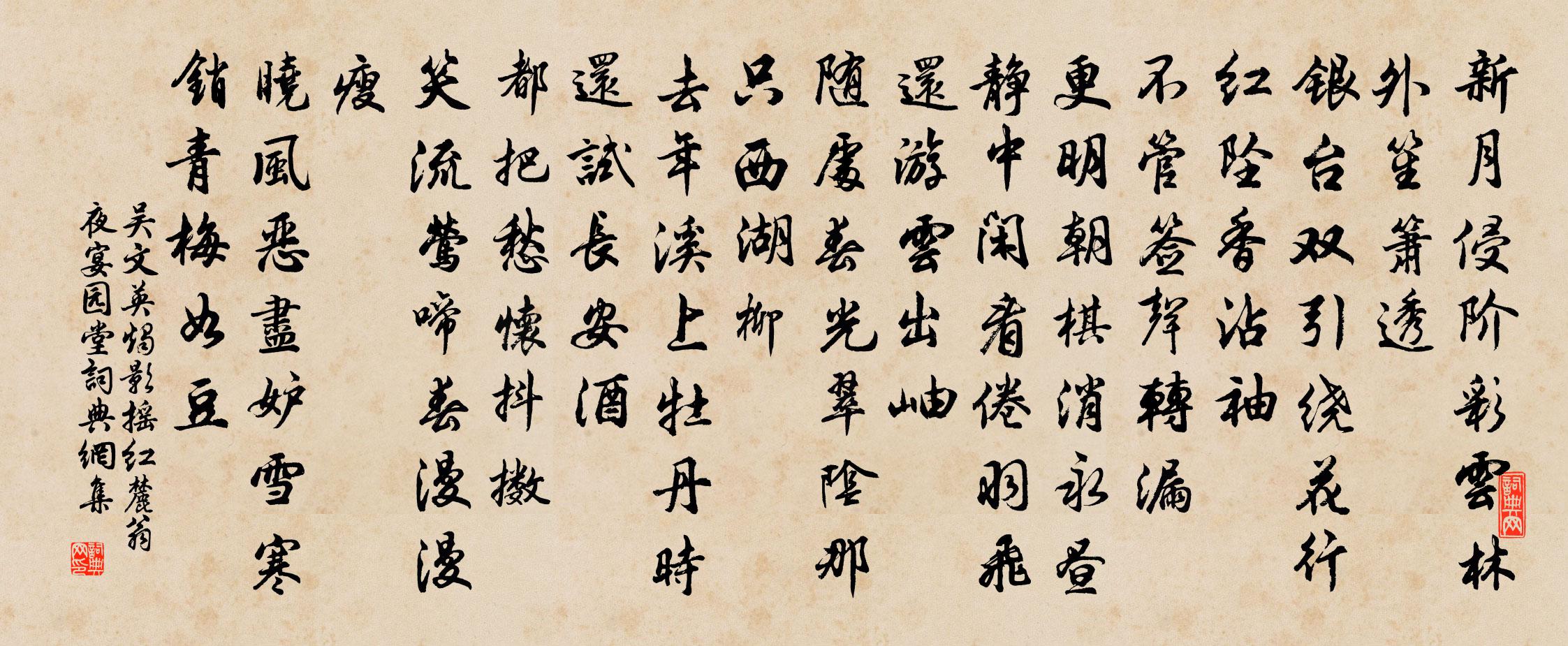 新月侵階,彩雲林外笙簫透。銀台雙引繞花行,紅墜香沾袖。