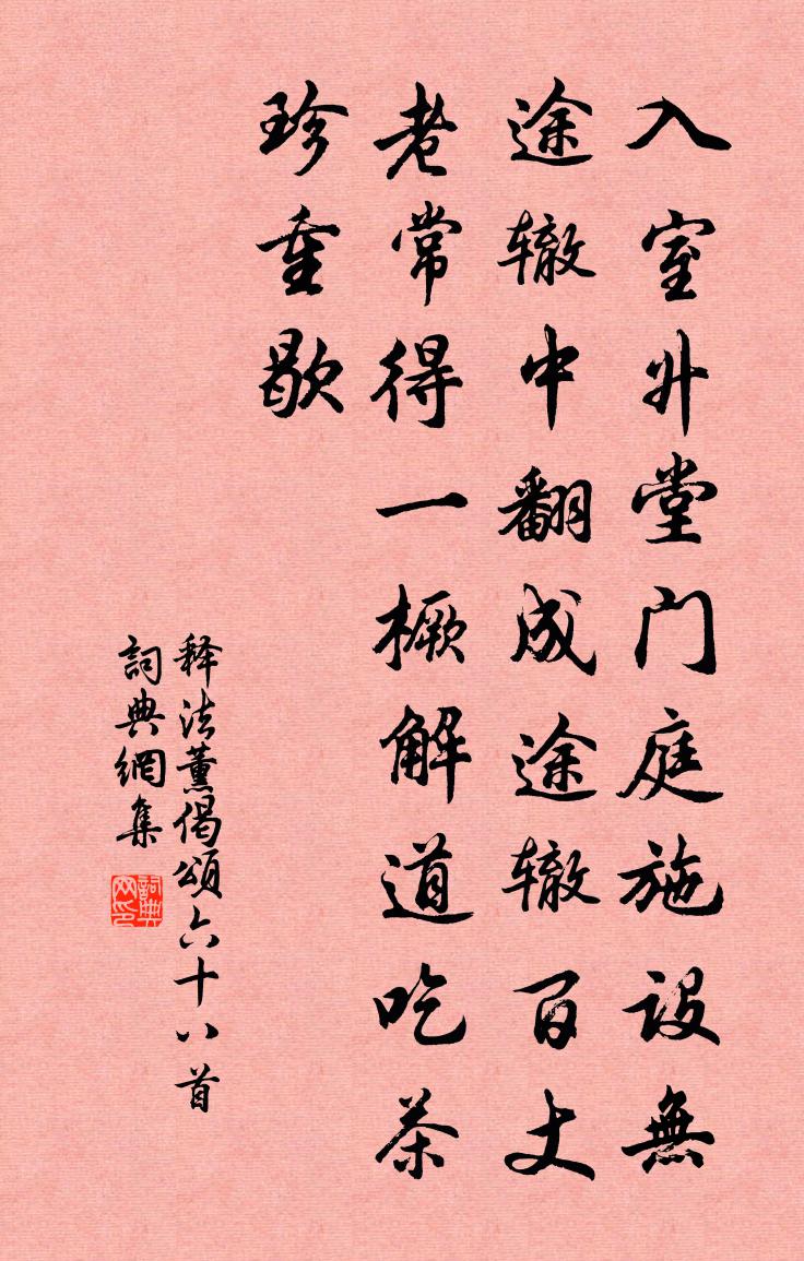 詩詞名句歷史字典書法欣賞書法字典國語詞典說文解字康熙字典古漢語字典標 題 作 者 詩 句 偈頌六十八首作者:釋法薰 朝代:宋代偈頌六十八首原文入室升堂,門庭施設。無途轍中,翻成途轍。百丈老常得一橛,解道吃茶珍重歇。詩詞問答問:偈頌六十八首的作者是誰?答:釋法薰問:偈頌六十八首寫於哪個朝代?答:宋代釋法薰偈頌六十八首書法欣賞偈頌六十八首書法作品詩詞推薦春懷十首汪莘〔宋代〕曳杖登春台,萬物含光輝。天地豈不大,孤雲獨無依。我友在東海,古屋弦湘妃。昔醉芙蓉浦,今掩桃李扉。不見是日雨陰殊甚咫尺如隔然趙蕃〔宋代〕青山咫尺不容看,豈是山靈意有難。定自知儂坐詩瘦,故令空霧作漫漫。春郊即事蔡戡〔宋代〕一犁春雨欲平塍,預卜今年穡事成。天意卻愁人意懶,故令布穀苦催耕。不寐十首方回〔宋代〕竺國輪迴說,誣民斷勿疑。還知已死後,即是未生時。六道何憑考,三身故強推。反終更原始,不寐試深思。有客問予每日何事客退賦此鄭剛中〔宋代〕杜門管得酒瓶乾,餘事誰能著眼看。仿佛殘香幽夢斷,冥濛細雨落花寒。林梢寺隱孤鍾晚,水外人喧社飲歡。萬里江頭春日真山民〔宋代〕風暖旗亭煮酒香,醉醒始悟是他鄉。駕言行邁路千里,豈不懷歸天一方。春事漸消鶯語老,離愁偏勝柳絲長。無聊鳴皋歌,送岑征君(時梁園三尺雪,在清泠池作)李白〔唐代〕若有人兮思鳴皋,阻積雪兮心煩勞。洪河凌競不可以徑度,冰龍鱗兮難容舠。邈仙山之峻極兮,聞天籟之嘈嘈。霜寄題謝景思藥寮仍用其韻王之望〔宋代〕城府年來怪跡疏,端因藥圃滯巾車。芒鞋入谷親尋種,野服巡欄自把鋤。室藹芝蘭無俗物,房深花木稱僧居。他時絕句張伯端〔宋代〕俗語常言合聖道,宜向其中細尋討。能將日用顛倒求,天地塵沙盡成寶。守茶塢子舍新塋衛宗武〔宋代〕自閱管郭書,風水好成癖。維舟走霅嶠,川谷幾遍歷。晚年乃得此,於焉擬藏骨。身謀適不偶,命子為冢宅。痴兒衛鞅徐鈞〔宋代〕心術刑名太刻殘,網深文峻眾心寒。倉忙客舍無歸處,始悔當年法欠寬。浮遠堂吳漢英〔宋代〕天險東南限此江,支分暨水北為陽。孤山不動嬰潮怒,容艇飛來說路長。檻外煙雲如出沒,坐中頃刻變炎涼。裴回磧西頭送李判官入京岑參〔唐代〕一身從遠使,萬里向安西。漢月垂鄉淚,胡沙費馬蹄。尋河愁地盡,過磧覺天低。送子軍中飲,家書醉里題。游天台山張祜〔唐代〕崔嵬海西鎮,靈跡傳萬古。群峰日來朝,累累孫侍祖。三茅即拳石,二室猶塊土。傍洞窟神仙,中岩宅龍虎。名從虎丘方仲荀〔宋代〕海湧起平田,禪扉古木間。出城先見塔,入寺始登山。堂靜參徒散,巢喧乳鶴還。祖龍求寶劍,曾此鑿孱顏。連日作陰頗有雨雪意陸游〔宋代〕十分曆日過 * ,徂歲迫人殊可驚。霜木蕭蕭臨古道,雪雲慘慘冒高城。山頭噤雀無生意,水面飢鳶有墮聲。剩壓次韻王定國馬上見寄蘇軾〔宋代〕昨夜霜風入裌衣,曉來病骨更支離。疏狂似我人誰顧,坎軻憐君志未移。但恨不攜桃葉女,尚能來趁菊花時。南台送楊皞擢第游江南錢起〔唐代〕行人臨水去,新詠復新悲。萬里高秋月,孤山遠別時。掛帆嚴子瀨,酹酒敬亭祠。歲晏無芳杜,如何寄所思。送於制乾二首釋寶曇〔宋代〕一笑無煩論古今,就中首肯即吾真。君今正與司南合,直指何曾更問人。春日二首呈黃子邁大卿戴復古〔宋代〕帝里風光二月新,西湖幾隊踏青人。杏花時節偏饒雨,楊柳門牆易得春。或是或非塵里事,無窮無達醉中身。五陵名句推薦雪中何以贈君別,惟有青青松樹枝。岑參《天山雪歌送蕭治歸京》 滿則慮嗛,平則慮險,安則慮危荀子《荀子·仲尼》 關山萬里不可越,誰能坐對芳菲月。盧思道《從軍行》 雲山行處合,風雨興中秋。高適《送魏八》 破帽遮顏過鬧市,漏船載酒泛中流。魯迅《自嘲》 唯天下至誠,方能經綸天下之大經,立天下之大本子思《中庸·第三十二章》 眉尖早識愁滋味,嬌羞未解論心事。黃公度《菩薩蠻·眉尖早識愁滋味》 臨水整烏紗。兩鬢蒼華。故鄉心事在天涯。吳琚《浪淘沙·岸柳可藏鴉》 家童掃蘿徑,昨與故人期。錢起《谷口書齋寄楊補闕》 天下者、大具也,不可以小人有也,不可以小道得也,不可以小力持也。荀子《荀子·正論》
