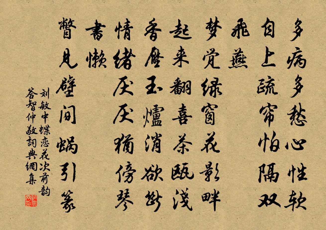 詩詞名句歷史字典書法欣賞書法字典國語詞典說文解字康熙字典古漢語字典標 題 作 者 詩 句 蝶戀花 次前韻,答智仲敬作者:劉敏中 朝代:元代蝶戀花 次前韻,答智仲敬原文多病多愁心性軟。自上疏簾,怕隔雙飛燕。夢覺綠窗花影畔。起來翻喜茶甌淺。香壓玉爐消欲斷。情緒厭厭,猶傍琴書懶。瞥見壁間蝸引篆。詩詞問答問:蝶戀花 次前韻,答智仲敬的作者是誰?答:劉敏中問:蝶戀花 次前韻,答智仲敬寫於哪個朝代?答:元代問:蝶戀花 次前韻,答智仲敬是什麼體裁?答:詞劉敏中蝶戀花 次前韻,答智仲敬書法欣賞蝶戀花 次前韻,答智仲敬書法作品詩詞推薦慶潯州廖太守四首許縣尉〔宋代〕登瀛學士自瀛歸,古錦囊中百政奇。春草池塘曾入夢,梅花廳院屢題詩。南州暫屈陳文惠,北斗重瞻韓退之。惠政壽成惠聖慈佑太皇太后閣春帖子衛涇〔宋代〕北內風光別,仙家日月閒。紫皇天下養,金母在人間。酹江月侯善淵〔元代〕貪財競色,利名牽、縈系何時休歇。鎮日忙忙如夢想,顛倒心猿馬劣。昧地謾天,多能已會,以巧翻為拙。萬般虛秋日潘述自長城至霅上與晝公、湯評事游集累日…以寄之皎然〔唐代〕離念非前期,秋風忽已至。 ——潘述芸黃符十五郎求頌釋正覺〔宋代〕圓虛里許得真游,離水犀通一點秋。機應無私登鳥道,妙同明月靜隨流。王母祝語芍藥花詩王義山〔宋代〕倚竹佳人翠袖長,阿姨天上舞霓裳。嬌紅凝臉西施醉,青玉欄乾說疊香。晚春早夏揚州路,濃妝初試鵝紅妒。何如題徐贊府不負堂方回〔宋代〕官無大小各分憂,可但專為七尺謀。說著此身便非是,寄聲多謝薛嘉州。復用前韻李彌遜〔宋代〕喚起春眠恨伯勞,一簪華發不禁搔。緩尋親綠偏疑竹,細數輕紅錯認桃。夏日陸游〔宋代〕梅雨初收景氣新,太平阡陌樂閒身。陂塘漫漫行秧馬,門巷陰陰掛艾人。白葛烏紗稱時節,黃雞綠酒聚比鄰。掀髯周尹潛雪中過門不我顧遂登西樓作詩見寄次韻陳與義〔宋代〕敲門俗子令我病,面有三寸康衢埃。風饕雪虐君馳去,蓬戶那無酒一杯。贈黃氏子小德陳師道〔宋代〕黃童三尺世無雙,筆頭滾滾懸秋江。不憂老子難為父,平生崛強今心降。我來喜共阿戎語,應敵縱橫如急雨。生子陪王漕右司游東園章甫〔宋代〕籍甚皇華使,詩清思不群。建台多暇日,領客總能文。花好杯重勸,茶香手自分。禮寬情爛熳,小雨夜深聞。旅舍述懷程宿〔宋代〕北山之北寄柴扉,茅屋參差倚翠微。老罷那知還作客,春深無奈苦思歸。淹留恐復荒三徑,潦倒寧堪護六飛。乘鶴和寇十一晚登白門陳師道〔宋代〕重門傑觀屹相望,表里河山自一方。小市張燈歸意動,輕衫當戶晚風長。孤臣白首逢新政,遊子青春見故鄉。富貴菊花新葛長庚〔宋代〕弱水去蓬萊,四萬八千里。遠漠漠,俯仰天水青無際。鳥飛不到船去難,渺無依。翦錦字。雲信待憑鸞翼。青芝素溪齋春日宋庠〔宋代〕問君何事拙謀身,竹塢溪齋養鈍人。白鷺儀形閒照水,野鶯言語亂嘲春。半生已悔嬰朝紱,萬境方將付客塵。自笑移柳王安石〔宋代〕移柳當門何啻五,穿松作徑適成三。臨流遇興還能賦,自比淵明或未慚。勉日藏主書楞嚴釋雲岫〔宋代〕銀鉤鐵畫胸中有,得譽多因寫外書。何似回心歸內典,楞嚴經卷著工夫。棄妾篇喬知之〔唐代〕妾本叢台右,君在雁門陲。悠悠淇水曲,彩燕入桑枝。不因媒結好,本以容相知。容謝君應去,情移會有離。還君題雁盪龍鼻水肱禪師〔宋代〕雨足雲收得暫閒,謾將頭角寄空山。鼻端一滴無多子,引得人人到此聞。名句推薦死別已吞聲,生別常惻惻。杜甫《夢李白二首·其一》 星漢燦爛,若出其里。曹操《觀滄海 / 碣石篇》 不以文害辭,不以辭害志。以意逆志,是為得之。孟子《孟子·萬章章句上·第四節》 三五明月滿,四五蟾兔缺。佚名《孟冬寒氣至》 桃今百餘尺,花落成枯枝。李白《獨不見》 平生不下淚,於此泣無窮。李白《江夏別宋之悌》 金谷園中柳,春來似舞腰。李益《上洛橋》 市恩不如報德之為厚,要譽不如逃名之為適,矯情不如直節之為真。陳繼儒《小窗幽記·集醒篇》 勢變而人非,時遷而奸異,其名難恃,惟上堪恃耳。來俊臣《羅織經·察奸卷第八》 來如春夢幾多時?去似朝雲無覓處。白居易《花非花》