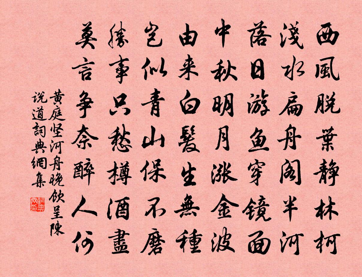 詩詞名句歷史字典書法欣賞書法字典國語詞典說文解字康熙字典古漢語字典標 題 作 者 詩 句 河舟晚飲呈陳說道作者:黃庭堅 朝代:宋代河舟晚飲呈陳說道原文西風脫葉靜林柯,淺水扁舟閣半河。落日游魚穿鏡面,中秋明月漲金波。由來白髮生無種,豈似青山保不磨。勝事只愁樽酒盡,莫言爭奈醉人何。詩詞問答問:河舟晚飲呈陳說道的作者是誰?答:黃庭堅問:河舟晚飲呈陳說道寫於哪個朝代?答:宋代問:黃庭堅的名句有哪些?答:黃庭堅名句大全黃庭堅河舟晚飲呈陳說道書法欣賞河舟晚飲呈陳說道書法作品詩詞推薦覽趙州語釋慧空〔宋代〕趙州借得空生口,便自縱橫師子吼。問其佛性狗子無,問其甲子蘇州有。而今此口還空生,古佛依前成漏逗。掀翻江梅引 為飛伯賦青梅李獻能〔元代〕漢宮嬌額倦塗黃。試新妝。立昭陽。萼綠仙姿,高髻碧羅裳。翠袖卷紗閒倚竹,暝雲合,瓊枝薦暮涼。璧月浮香。五徵君松陰獨坐圖郭禮〔宋代〕盤石走新蘿,飛流下層巘。抱琴如有期,心與孤雲遠。鳥來天際微,林光澹將晚。受此鬆氣清,坐嘯不知返。聚星堂前紫薇花歐陽修〔宋代〕亭亭紫薇花,向我如有意。高煙晚溟濛,清露晨點綴。豈無陽春月,所得時節異。靜女不爭寵,幽姿如自喜。將期送周裕之赴新息令秦觀〔宋代〕丈人帶淮海英,帶抗節浮雲帶外。揮毫帶錯星錦,抵掌參竽籟。青春抱修能,脫略無范蔡。晚營三徑資,百里聊束高士詠樊先生吳筠〔唐代〕巢父志何遠,潛精人莫知。恥聞讓王事,飲犢方見移。不欲散大朴,焉能為堯師。煉真自輕舉,浮世何足遺。水調詞十首陳陶〔唐代〕黠虜迢迢未肯和,五陵年少重橫戈。誰家不結空閨恨,玉箸闌乾妾最多。羽管慵調怨別離,西園新月伴愁眉。容華送常侍舒公歸覲蘇頲〔唐代〕朝聞講藝餘,晨省拜恩初。訓胄尊庠序,榮親耀里閭。朱丹華轂送,斑白綺筵舒。江上春流滿,還應薦躍魚。檜房趙汝績〔宋代〕老檜倚虛房,能生九夏涼。讀書參句讀,臨字識偏傍。婢織蒲為履,童燒術當香。興來吟不就,頻與月商量。寄山僧(時年五十)白居易〔唐代〕眼看過半百,早晚掃岩扉。白首誰留住,青山自不歸。百千萬劫障,四十九年非。會擬抽身去,當風抖擻衣。純陽會白玉蟾〔宋代〕一點薰風舞綠槐,祝融袞火從南來。海棠落地蜂蝶去,池館無人蓮未開。溶溶一掬清和髓,純乾已作牝馬矣。岳瀆河北送洪景之進士如荊南強至〔宋代〕十年肝膽照交情,朔漠相逢意轉傾。蒼鬢飄颻予薄宦,青雲蹭蹬子諸生。更同樽俎知何地,漫與詩篇送子行。南北已亥雜詩 91龔自珍〔清代〕北俊南孊氣不同,少能炙轂老能聰。可知銷盡勞生骨,即在方言兩卷中。馬齧雪歐陽修〔宋代〕馬飢齧渴飲冰,北風捲地來崢嶸。馬悲躑躅人不行,日暮塗遠千山橫。我謂行人止嘆聲,馬當勉力無悲鳴。白溝南雨涼二首呈宗偉范成大〔宋代〕驚雷隱地送涼颸,起舞看山不自持。說與騷人須早計,片雲催雨雨催詩。謝韓乾送絲糕陳造〔宋代〕玉顆瑩澈珠就磋,吳鄉早粳莫計過,無乃風露秀結異,移種崑崙之水禾。君家廚婦窮百技,三舂九浙付重羅。銀絲饋春茶天制司屬官袁說友〔宋代〕戊午新芽上蜀江,表情未有敢先嘗。幾年爭鬭無雙品,萬里書來第一綱。水截龍章浮碾玉,爐煎蟹眼試憑湯。知君送龍池廖先生開講沙場詩余湜〔宋代〕沙場諸子弟,少小盡晞顏。迎我五經笥,歸來七島山。朝游松子洞,暮宿惠人灣。講罷西風裡,扁舟早送還。水調歌頭(和懶翁)葛長庚〔宋代〕昔在虛皇府,嘯詠紫雲中。不知何事,誤蒙天謫與公同。偶到金華洞口,忽見懶翁老子,挺挺眾中龍。握手歸仙隱過友人溪居文同〔宋代〕籬巷接菰蒲,閒扉掩自娛。水蟲行插岸,林鳥過提壺。白浪搖秋艇,青煙蓋晚廚。主人夸野飯,為我煮新蘆。名句推薦透內閣香風陣陣,掩重門暮雨紛紛。王實甫《十二月過堯民歌·別情》 更傾寒食淚,欲漲冶城潮。王安石《壬辰寒食》 夜深靜臥百蟲絕,清月出嶺光入扉。韓愈《山石》 莫等閒,白了少年頭,空悲切!岳飛《滿江紅·寫懷》 眾里尋他千百度,驀然回首,那人卻在,燈火闌珊處。辛棄疾《青玉案·元夕》 菊花何太苦,遭此兩重陽?李白《九月十日即事》 南國辛居士,言歸舊竹林孟浩然《都下送辛大之鄂》 故人南燕吏,籍籍名更香。岑參《至大梁卻寄匡城主人》 水溢芙蓉沼,花飛桃李蹊。薛道衡《昔昔鹽》 生年不滿百,常懷千歲憂。佚名《生年不滿百》