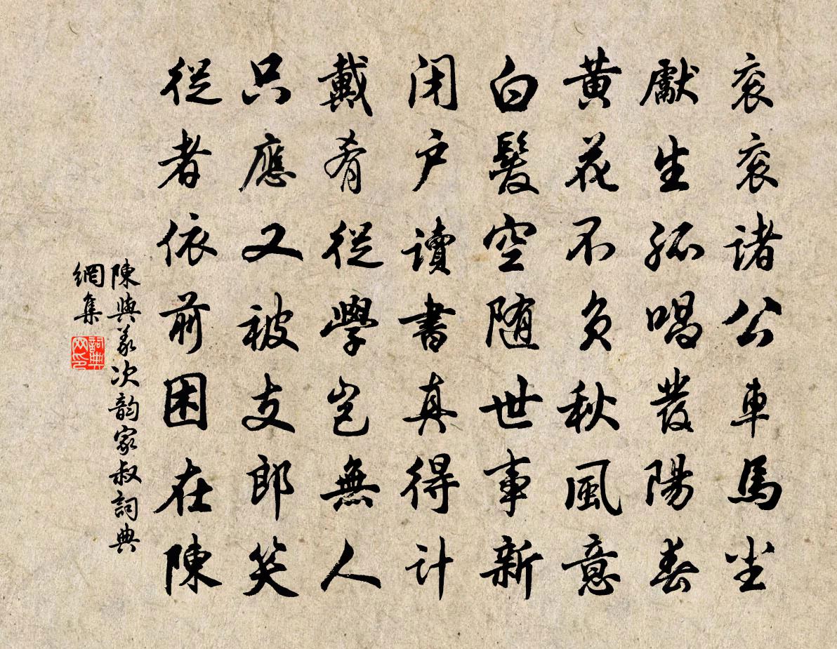 詩詞名句歷史字典書法欣賞書法字典國語詞典說文解字康熙字典古漢語字典標 題 作 者 詩 句 次韻家叔作者:陳與義 朝代:宋代次韻家叔原文袞袞諸公車馬塵,先生孤唱發陽春。黃花不負秋風意,白髮空隨世事新。閉戶讀書真得計,戴餚從學豈無人。只應又被支郎笑,從者依前困在陳。詩詞問答問:次韻家叔的作者是誰?答:陳與義問:次韻家叔寫於哪個朝代?答:宋代問:陳與義的名句有哪些?答:陳與義名句大全陳與義次韻家叔書法欣賞次韻家叔書法作品詩詞推薦苦吟楊萬里〔宋代〕蟻無秋衣鴈有喪,霜天謀食各自愁。鴈聲寒死叫不歇,蟻膝凍僵行復休。先生苦吟日色晚,老鈴來催吃朝飯。小兒天竺山居釋斯植〔宋代〕對雨吟方穩,西風忽晚晴。野花沿澗白,秋意入簾清。淺水藏魚影,重林隔磬聲。是非塵外事,誰可繼高名。宮詞王仲修〔宋代〕卷幕風來滿殿涼,暉暉紅日上迴廊。郢坊初進酴醾酒,別是人間一種香。送鞠十二朝散將漕二浙張舜民〔宋代〕聞說長安苦戴星,公家無補祇勞形。每思肥羜心先寫,今見淮山眼自青。豈乏尋常將漕輓,好留人物為朝廷。四明次韻洪慶善同飲道祖家賞梅葛立方〔宋代〕麝臍飄馥來疏蕊,霜女將寒墮瘦枝。數朵臘前舒冷艷,催花羯鼓未應知。寄白龍洞劉道人呂岩〔唐代〕玉走金飛兩曜忙,始聞花發又秋霜。徒夸籛壽千來歲,也是雲中一電光。一電光,何太疾,百年都來三萬日。其間次韻謝王粟秀才四首項安世〔宋代〕春來無酒債,客至得詩材。論文舌本壯,誦句須髯開。鮮芳曜楛朽,駿步驚駑駘。巍巍王謝家,袞袞世有才。七夕薛秉〔宋代〕紅蕖爛漫碧池香,羅綺三千侍漢皇。阿母暫來成底事,茂陵宮樹已蒼蒼。得三七舍侄書雲二月二十五日同族人至湖山賞吳芾〔宋代〕報言宗族競尋芳,共到吾廬賞海棠。亭下定知春爛熳,花間想見醉淋浪。長年心著神仙窟,此日身縻雲水鄉。苦恨南湖遣興項安世〔宋代〕朝回日日到南湖,不惜金錢散僕夫。同舍盍簪如有約,吾廬高枕更何殊。年華過雨春都盡,草色連天路欲無。樂事丙寅八月旦震興尚早坐而假寐夢與客誦雲藜羹陽枋〔宋代〕僂指寅年已半強,煩歊能幾不定期淒涼。風葉有聲宵鳴廊,試擁衾紬眠藤床。曉鉦錚樓點長準,清夢了了喔詩章。懷古蕭觀音〔遼代〕宮中只數趙家妝,敗雨殘雲誤漢王。惟有知情一片月,曾窺飛燕入昭陽。句邵伯溫〔宋代〕春去秋來好風月,鶴樓端勝庚公樓。訪李奐山人隱居文同〔宋代〕多暇無所適,故來尋隱君。搴開壓屋樹,觸散擁門雲。狀貌不妨古,言談何太文。令人重高趣,歸去每斜曛。湘川吊舜馬戴〔唐代〕伊予生好古,吊舜蒼梧間。白日坐將沒,游波疑不還。九疑雲動影,曠野竹成斑。雁集蒹葭渚,猿啼霧露山。南風相如琴台盧照鄰〔唐代〕聞有雍容地,千年無四鄰。園院風煙古,池台松檟春。雲疑作賦客,月似聽琴人。寂寂啼鶯處,空傷遊子神。述華清宮五首儲光羲〔唐代〕上在蓬萊宮,莫若居華清。朝朝禮玄閣,日日聞體輕。大聖不私己,精禋為群氓。上出蓬萊時,六龍儼齊首。長道張安國書簡帖贊岳珂〔宋代〕漢輕法言,耳目所忽。予藏於湖,亦近世物。氣並華劍,烈同段笏。匪尚其容,亦尚其骨。頃自吏部郎去國時,獨同舍趙友益追路送詩,范成大〔宋代〕東風分袂省西廊,袖有明珠照客航。道義有情通出處,文章無地著炎涼。君今猶把一麾去,我敢倦鋤三徑荒。邂逅壽馮德厚三首袁甫〔宋代〕人生汩汩逐風波,祝子長年要若何。一日洞然無障礙,元來佛法也無多。名句推薦疏星淡月鞦韆院,愁雲恨雨芙蓉面。張可久《塞鴻秋·春情》 與人善言,暖於布帛;傷人之言,深於矛戟。荀子《荀子·榮辱》 霜降碧天靜,秋事促西風。葉夢得《水調歌頭·九月望日與客習射西園余偶病不能射》 安居不用架高堂,書中自有黃金屋。趙恆《勸學詩》 舉頭忽見衡陽雁。千聲萬字情何限。陳達叟《菩薩蠻·舉頭忽見衡陽雁》 樓前綠暗分攜路,一絲柳、一寸柔情。吳文英《風入松·聽風聽雨過清明》 吾聞馬周昔作新豐客,天荒地老無人識。李賀《致酒行》 天地玄黃,宇宙洪荒。周興嗣《千字文·全文》 停船暫借問,或恐是同鄉。崔顥《長干行·君家何處住》 望雲慚高鳥,臨水愧游魚。陶淵明《始作鎮軍參軍經曲阿作》