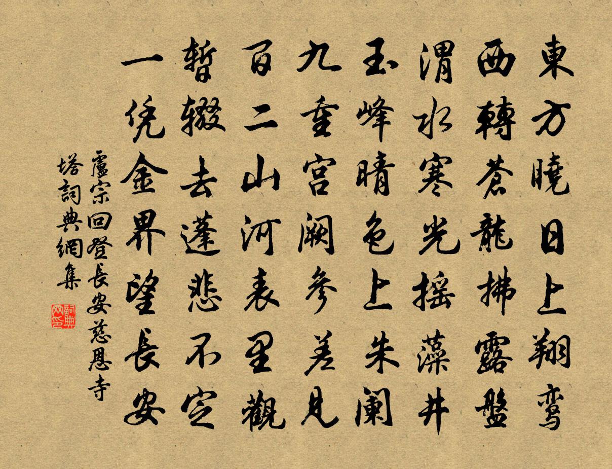 詩詞名句歷史字典書法欣賞書法字典國語詞典說文解字康熙字典古漢語字典標 題 作 者 詩 句 登長安慈恩寺塔作者:盧宗回 朝代:唐代登長安慈恩寺塔原文東方曉日上翔鸞,西轉蒼龍拂露盤。渭水寒光搖藻井,玉峰晴色上朱闌。九重宮闕參差見,百二山河表里觀。暫輟去蓬悲不定,一憑金界望長安。詩詞問答問:登長安慈恩寺塔的作者是誰?答:盧宗回問:登長安慈恩寺塔寫於哪個朝代?答:唐代問:登長安慈恩寺塔是什麼體裁?答:七律盧宗回登長安慈恩寺塔書法欣賞登長安慈恩寺塔書法作品注釋全唐詩:卷490-1詩詞推薦湖山館中酬謝士宜張埴〔宋代〕吾道不可東,老雁踏長雲。太息復太息,青海枯成塵。喙短莫叫空,此物弗貸人。顧影正念群,一唳生湖濱。宴清都趙必〔宋代〕遠遠漁村鼓。斜陽外、賓鴻三兩飛度。茅檐春小,白雲隱几,青山當戶。騷翁底事飄蓬,渾忘卻、耕徒釣侶。何時仰山見東寺索珠釋堅璧〔宋代〕無言可對輝天地,無理堪伸奪夜光。離相離名言語道,潑天高價不尋常。再併賦瑞香水仙蘭三花楊萬里〔宋代〕水仙頭重力纖弱,碧柳腰支黃玉萼。娉娉嫋嫋誰為扶,瑞香在旁扶著渠。春蘭初芽嫩仍短,嬌如穉子無人管。瑞香句方慎言〔宋代〕借問城中推妙手,誰能寫得使君心。寓興鮑溶〔唐代〕念來若望神,追往如話夢。夢神不無跡,誰使煩心用。魯聖虛泣麟,楚狂浪歌鳳。那言阮家子,更作窮途慟。點絳唇劉辰翁〔宋代〕虹玉橫簫,纖纖指按新聲作。參差重約。昨夜梁伊錯。幾許閒愁,品字都忘卻。沉吟覺。一聲哀角。滿院殘花落。登太山郭賁〔宋代〕雙屐沖煙上泰台,欲將老眼傍天開。春深疊嶂晴看雪,雨後飛泉夜聽雷。玉節攢蒼煙浩渺,群山裂翠壁崔嵬。目前偈頌六十首釋曇華〔宋代〕簸箕有唇,米跳不出,天下衲僧赤{左骨右乞}{左骨右歷}。更須撥轉上頭關,十方世界黑似漆。紀秦漢間事二首羅公升〔宋代〕秦焰亦已灰,函關碎周文。玄感老東都,不救身首分。慎勿輕瘠牛,猶足僨孤豚。高文信神武,□往乘□昏。落果龍洞二首張嵲〔宋代〕瀑溜落岩冰柱碎,迸珠跳沫似飛埃。西風更與遊人便,時送輕塵灑面來。繩技劉克莊〔宋代〕身在半天貪進步,腳離實地駭旁觀。愈悲登華高難下,載卻尋橦險不安。得陳元履家書六言四首岳珂〔宋代〕病骨經秋易怯,人情比日多疎。驚起打門軍將,傳來置驛家書。雪後許月卿六〔宋代〕雪瀏瀏時逢曉日,水粼粼處識春風。天公留取峰頭雪,與作人間別樣春。酬樂天聞李尚書拜相以詩見賀元稹〔唐代〕初因彈劾死東川,又為親情弄化權。百口共經三峽水,一時重上兩漫天。尚書入用雖旬月,司馬銜冤已十年。若待秋思陸游〔宋代〕半年閉戶廢登臨,直自春殘病至今。帳外昏燈伴孤夢,檐前寒雨滴愁心。中原形勝關河在,列聖憂勤德澤深。遙想早梅胡寅〔宋代〕何事悲搖落,空林有早春。光輝一笑粲,領略萬花新。看去疑山雪,攀來效席珍。妙香風送遠,秀影月傳真。肌冷感春申君張祜〔唐代〕薄俗何心議感恩,諂容卑跡賴君門。春申還道三千客,寂寞無人殺李園。蓮盪趙蕃〔宋代〕舟涉越溪悲,梯攀玉井危。何如澹成映,更有綠相欹。不作騷人恨,頻成謝客詩。釣船如許坐,蓑笠不辭披。同賦龍沙墅戴叔倫〔唐代〕迴轉沙岸近,欹斜林嶺重。因君訪遺蹟,此日見真龍。名句推薦自憐十五餘,顏色桃李紅。李白《長干行二首》 鬢絲日日添白頭,榴錦年年照眼明;殷堯藩《端午日》 佳節久從愁里過,壯心偶傍醉中來。蘇洵《九日和韓魏公》 秋陰時晴漸向暝,變一庭淒冷周邦彥《關河令·秋陰時晴漸向暝》 與肩挑貿易,毋占便宜;見貧苦親鄰,須加溫恤。朱柏廬《朱子家訓·全文》 君子安禮樂利,謹慎而無斗怒,是以百舉而不過也。荀子《荀子·臣道》 蓬生麻中,不扶而直;白沙在涅,與之俱黑。荀子《荀子·勸學》 柘彈何人發,黃鸝隔故宮。溫庭筠《清明日》 此生只是償詩債,白菊開時最不眠。司空圖《白菊雜書四首》 野竹交淇水,秋瓜蔓帝邱。司馬光《送雲卿知衛州》