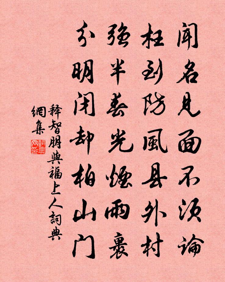 詩詞名句歷史字典書法欣賞書法字典國語詞典說文解字康熙字典古漢語字典標 題 作 者 詩 句 與福上人作者:釋智朋 朝代:宋代與福上人原文聞名見面不須論,枉到防風縣外村。強半春光煙雨裹,分明閉卻柏山門。詩詞問答問:與福上人的作者是誰?答:釋智朋問:與福上人寫於哪個朝代?答:宋代釋智朋與福上人書法欣賞與福上人書法作品詩詞推薦偈頌七十六首釋師觀〔宋代〕此從無枝葉,唯有諸貞實。我法妙難思,五千人退席。午窗坐睡蘇軾〔宋代〕 * 花盤兩膝,花竹几閣雙花肘。此間道路熟,逕到無何有。身心兩不見,息息安且久。睡蛇本亦無,何用鉤與手賈鹿泉屢約一出小詩代行十首陳杰〔宋代〕南北風殊久未諳,亂離更值旱如惔。斗升試酌西江水,應有湯年一溉甘。十蟲吟舒岳祥〔宋代〕蟲有避債夫,緝繭枝間綴。竊食檉松毛,負之以為蓋。首鼠開兩端,見人深拒閉。想汝作債初,已作逃匿計。小兒秋日錢塘作齊己〔唐代〕秋光明水國,遊子倚長亭。海浸全吳白,山澄百越青。英雄貴黎庶,封土絕精靈。句踐魂如在,應懸戰血腥。元規道人覽予心說作頌見寄次韻奉答張繼先〔宋代〕新文博不繁,披誦已清魂。意在諸緣外,心為萬法源。猶龍誰可測,牧馬自微言。三復難窮處,重來得細論。呂善化秩滿而歸兩詩贈行張栻〔宋代〕令尹三年政,湘民去息思。艱難救災歉,憂瘁見云為。薦牘今交上,夷途去不疑。正須頻顧省,御者可無辭。宵民李群玉〔唐代〕大雅無憂怨,宵民有愛憎。魯侯天不遇,臧氏爾何能。慘慘心如虺,營營舌似蠅。誰於銷骨地,一鑒玉壺冰。寄碧瑤山房蔡槃〔宋代〕市聲不到處,作屋僅三間。洗硯添新水,開窗放遠山。濕雲侵樹黑,疏雨蝕苔斑。近有間生活,吟編手自刪。次韻徐廷珪偶成於石〔宋代〕德行誰能冠四科,將興將廢道云何。百年詩酒晉元亮,萬世功名漢伏波。高枕林泉閒夢少,出門風雨落花多。人生水鳥吳融〔唐代〕煙為行止水為家,兩兩三三睡暖沙。為謝離鸞兼別鵠,如何禁得向天涯。遣季子壽黃循齋二首陽枋〔宋代〕自得遺書學子房,擬來辟穀並山陽。仙鄉不秘眼前道,俗相慚無肘後方。經葉再傳新雨露,桃花重發舊門牆。呼兒平江府文天祥〔宋代〕樓台俯舟楫,城郭滿干戈。故吏歸心少,遺民出涕多。鳩居無鵲在,魚網有鴻過。使遂睢陽志,安危今若何。壽湖南管倉五首廖行之〔宋代〕平糴慮國深,公囷匪邦積。自古斯有年,寢遠失初意。今年出緡錢,樂歲怨狼戾。此法竟施行,農民等蒙惠。春晚還致庵舒岳祥〔宋代〕亂後還山喜復哀,舊書妄人等秦灰。翛然山徑花吹盡,蠶豆青梅存一杯。【仙呂】點絳唇_辭朝寧可身不忽木〔元代〕辭朝寧可身臥糟丘,賽強如命懸君手。尋幾個知心友,樂以忘憂,願作林泉叟。【混江龍】布袍寬袖,樂然何處謁武陵春 渭南楊五生朝丘處機〔元代〕新歲才交生萬物,時令近元宵。瑞氣ㄨㄨ降碧霄。方誕謫仙苗。貌態堂堂殊勝敏,歸道厭凡囂。石爛松枯壽更遙,答謝諮議謝靈運〔南北朝〕玉衡迅駕。四節如飛。急景西馳。奔浪赴沂。英華始翫。落葉已稀。惆悵衡皋。心焉有違。九日和於使君思上京親故皎然〔唐代〕霽景滿水國,我公望江城。碧山與黃花,爛熳多秋情。搖落見松柏,歲寒比忠貞。歡娛在鴻都,是日思朝英。灩澦堆杜甫〔唐代〕巨積水中央,江寒出水長。沈牛答雲雨,如馬戒舟航。天意存傾覆,神功接混茫。干戈連解纜,行止憶垂堂。名句推薦遠信入門先有淚,妻驚女哭問何如。元稹《得樂天書》 楊柳東風樹,青青夾御河。王之渙《送別》 淡盪春光寒食天。玉爐沉水裊殘煙。夢回山枕隱花鈿。李清照《浣溪沙·淡盪春光寒食天》 天仙碧玉瓊瑤,點點揚花,片片鵝毛。薛昂夫《蟾宮曲·雪》 高岸為谷,深谷為陵。佚名《十月之交》 雲橫秦嶺家何在?雪擁藍關馬不前。韓愈《左遷至藍關示侄孫湘》 搖落深知宋玉悲,風流儒雅亦吾師。杜甫《詠懷古蹟五首·其二》 歌泣不成天已暮,悲風日夜起江生。魏禧《登雨花台》 青綾被,莫憶金閨故步晁補之《摸魚兒·東皋寓居》 楚天千里清秋,水隨天去秋無際。辛棄疾《水龍吟·登建康賞心亭》