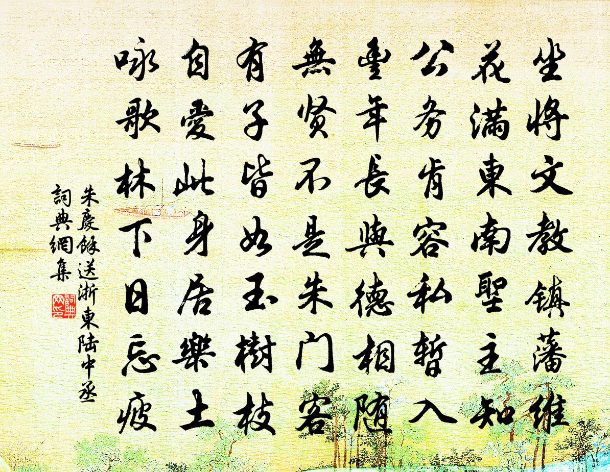 詩詞名句歷史字典書法欣賞書法字典國語詞典說文解字康熙字典古漢語字典標 題 作 者 詩 句 送浙東陸中丞作者:朱慶餘 朝代:唐代送浙東陸中丞原文坐將文教鎮藩維,花滿東南聖主知。公務肯容私暫入,豐年長與德相隨。無賢不是朱門客,有子皆如玉樹枝。自愛此身居樂土,詠歌林下日忘疲。詩詞問答問:送浙東陸中丞的作者是誰?答:朱慶餘問:送浙東陸中丞寫於哪個朝代?答:唐代朱慶餘送浙東陸中丞書法欣賞送浙東陸中丞書法作品注釋全唐詩:卷515-24詩詞推薦【雙調】雁兒落過德勝今趙善慶〔元代〕天竺寺檀古道場,水月白衣相。真珠般若林,多寶如來藏。梵相四天王,唐塑八金剛。佛隱松間塔,僧推雲外窗。子肅以古風見還詩軸頗述歸田之樂次韻答之趙蕃〔宋代〕春風書忽滿目,書感嘆離群書居。郊行書竟何之,野蔓徒侵裾。仰看嶺頭雲,片段隨卷舒。悠然若有得,似我心地送戴復古謁陳延平劉克莊〔宋代〕倉部當今第一流,艱難有詔起分憂。城危如卵支群盜,膽大於身蔽上游。應是孔明親治事,豈無子美可參謀。君行夢覺吟釋文珦〔宋代〕百年如大夢,夢裡幾紛馳。覺後識為夢,夢時曾未知。吾生今已覺,不記夢中時。在夢人無限,昏昏信可悲。維摩贊釋法薰〔宋代〕據坐胡床,風悄悄地。四八痴人夜走,未免落他圈樻。七佛之師,也遭連累。石田當時在傍,只消打個噴嚏。降虜趙嘏〔唐代〕廣武溪頭降虜稀,一聲寒角怨天微。河湟不在春風地,歌舞空裁雪夜衣。鐵馬半嘶邊草去,狼煙高映塞鴻飛。揚雄病起窺園十絕劉克莊〔宋代〕病來豈有力迎緩,耄及已將家付康。乾蠱久勞小兒子,探丸未遇大醫王。失調名(四十九歲自壽)孫惟信〔宋代〕壽花戴了。山童問、華庚多少。待瞞來、又怕旁人笑。況戒臘、淳熙可考。大衍之用恰恰好。學易後、尚一年小。南康張埴〔宋代〕彭澤鱗鱗水,匡廬漠漠煙。朝昏魚作市,伏臘蚌為田。不共劉伶酒,惟同范蠡船。膊山千八百,恨未脫珉鐫。蓬萊閣醉歸張伯玉〔宋代〕蓬萊閣上醉歸時,猶索芳樽步步隨。啼鳥似來留翠佩,旁人笑為整花枝。腰閒半嚲黃金印,頭上斜欹白接?。拍手寄雲夫史彌寧〔宋代〕黔國相逢地,蒼燈共夜篝。雲龍念東野,柏馬歡之罘。郵傳一分手,河山再見秋。交情如繾綣,不在寄書稠。朝陽贊二首釋祖欽〔宋代〕離披披破骨董,補一孔了又一孔。三竿紅日透籬邊,看來何止七八重。辛亥二月望祭齋公因游甘園朱繼芳〔宋代〕公事相妨一半春,今朝才得自由身。眼中領略能多少,細雨斜風便妒人。送李侍御宋之問〔唐代〕行李戀庭闈,乘軺振彩衣。南登指吳服,北走出秦畿。去國夏雲斷,還鄉秋雁飛。旋聞郡計入,更有使臣歸。次韻吳僧魁一山十絕方回〔宋代〕潘江陸海一笑唾,暫借禪衣隱此身。坡谷兩翁合為一,座間始可著斯人。憶舊遊 元夕雨袁易〔元代〕記笙歌茂苑,繡錦吳*,京樣風流。夜弛金吾令,正籠紗竟陌,霧暖春柔。翠蓬閬府移下,花影一天浮。任畫管催西園十詠圓通庵吳中復〔宋代〕坐對圓通境,陶然勝靜齋。觀空無物我,扣寂外形骸。燕坐埋遺照,虛名莫疚懷。人間憂樂地,所喪甚山崖。秋望有懷華岳〔宋代〕片雲如雨卷西風,綽盡遮闌眼力雄。遠水半連晴漢碧,暮霞全借夕陽紅。姓名未得聯諸子,鬢髮皤然已一翁。欲識南歌子(寄景盧)洪适〔宋代〕南浦山羅列,東湖水渺彌。主人好客過當時。斗轉參橫時候、醉如泥。莫管鶯聲老,從它柳絮飛。野園春色別無奇予去杭十六年而復來,留二年而去。平生自覺蘇軾〔宋代〕當年衫鬢兩青青,強說重臨慰別情。衰發祗今無可白,故應相對話來生。名句推薦人散市聲收,漸入愁時節。劉克莊《生查子·元夕戲陳敬叟》 法令至行,公平無私劉向《戰國策·秦一·衛鞅亡魏入秦》 人事有代謝,往來成古今。孟浩然《與諸子登峴山》 胭脂淚,相留醉,幾時重。李煜《相見歡·林花謝了春紅》 財以成者,扶而埋之;後得生者,而久禁之。墨子《墨子·22章 節用(下)》 若要俏,添重孝。馮夢龍《警世通言·卷三十五》 紫塞門孤,金河月冷,恨誰訴?朱彝尊《長亭怨慢·雁》 天地合而萬物生,陰陽接而變化起,性偽合而天下治。荀子《荀子·禮論》 西風惡。數聲新雁,數聲殘角。黃機《憶秦娥·秋蕭索》 秋冬雪月,千里一色;蘇軾《放鶴亭記》