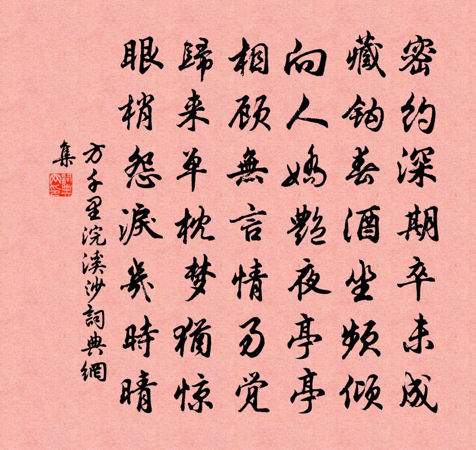 詩詞名句歷史字典書法欣賞書法字典國語詞典說文解字康熙字典古漢語字典標 題 作 者 詩 句 浣溪沙作者:方千里 朝代:宋代浣溪沙原文密約深期卒未成。藏鉤春酒坐頻傾。向人嬌艷夜亭亭。相顧無言情易覺,歸來單枕夢猶驚。眼梢怨淚幾時晴。詩詞問答問:浣溪沙的作者是誰?答:方千里問:浣溪沙寫於哪個朝代?答:宋代問:浣溪沙是什麼體裁?答:詞方千里浣溪沙書法欣賞浣溪沙書法作品詩詞推薦菩薩蠻·山城夜半催金顧貞觀〔清代〕山城夜半催金柝,酒醒孤館燈花落。窗白一聲雞,枕函聞馬嘶。 門前烏桕樹,霜月迷行處。遙憶獨眠人,早寒驚相思令·苹滿溪張先〔宋代〕苹滿溪。柳繞堤。相送行人溪水西。回時隴月低。煙霏霏。風淒淒。重倚朱門聽馬嘶。寒鷗相對飛 。江行第八十七文天祥〔宋代〕蕭蕭白楊路,死人積如丘。大江東流去,蒼山旌旆愁。香印王建〔唐代〕閒坐燒印香,滿戶松柏氣。火盡轉分明,青苔碑上字。感皇恩沈端節〔宋代〕和氣靄微霄,黃雲飄轉。東閣觀梅負詩眼。滿斟綠酒,唱個曲兒親勸。願從今日去,長相見。寶幄歡濃,玉爐香軟思山居一十首思登家山林嶺李德裕〔唐代〕自知無世用,只是愛山游。舊有嵇康懶,今慚趙武偷。登巒未覺疾,泛水便忘憂。最惜殘筋力,捫蘿遍一丘。集湯評事衡湖上望微雨皎然〔唐代〕蒼涼遠景中,雨色緣山有。雲送滿洞庭,風吹繞楊柳。蕭蕭解輕袂,盡日隨林叟。過黃泥坂袁說友〔宋代〕牽車緩上黃泥坂,復嶺重崗甚前日。躋攀千級下如之,十里三山三降陟。平生兩腳疲辛酸,歲晚行路熟蹣跚。人言滿庭芳 證仙果馬鈺〔元代〕牝鎖玄通,龍奔虎走,微微調息綿綿。清風透戶,不放馬猿顛。奼女嬰兒相遇,論清淨、至妙根源。無作做,自然送河中楊少府宴崔駙馬宅姚合〔唐代〕鳳凰樓下醉醺醺,晚出東門蟬漸聞。不使鄉人治驛路,卻將家累宿山雲。閒時採藥隨僧去,每月請錢共客分。縣吏蝶戀花楊道居〔宋代〕氣稟五行天與秀。瑞見樞延,況是黃鍾奏。日影量來添午晝。柳梅訊息年時侯。紅粉吹香簾幕透。深院笙歌,勸飲粥罷程珌〔宋代〕飯已茶三啜,隅中粥一盂。陶然詠皇化,安用東封書。戲贈李主簿施肩吾〔唐代〕官罷江南客恨遙,二年空被酒中消。不知暗數春遊處,偏憶揚州第幾橋。鶴林寺劉光祖〔宋代〕竹院逢僧話,山門掃地迎。英雄猶有跡,般若太無情。玉樹春陰密,琅玕晚暑清。半年來往屢,只合送行旌。讀史宋祁〔宋代〕順諛要領絕,書罷付函封,隸子方求益,君非賣菜傭。急雨陸游〔宋代〕炎炎赤日當空燒,簿書圍坐如居窯。黑雲壓檐忽迢嶢,急雨鼎來風駕潮。彈壓旱氣蘇枯焦,祝融退聽不敢驕。父老連日得順風趙蕃〔宋代〕上水深虞費挽牽,順風似得江神憐。雲山好處留不得,縱望令人空惘然。送鄭舜舉赴闕陳棣〔宋代〕暫綰桐川刺史章,優優布政漢循良。鳳銜初下新頒詔,雞舌曾聞舊賜香。前席久虛思見賈,璽書增寵果徵黃。從今寄南雅上人齊己〔唐代〕曾得音書慰暮年,相思多故信難傳。清吟何處題紅葉,舊社空懷墮白蓮。山水本同真趣向,侯門剛有薄因緣。他時四五用喜雪韻四首吳潛〔宋代〕不數玄真與木難,也休翦彩綴林端。五車自有神朝闕,萬寶非因賈送官。老大已殘洄曲夢,推敲且作灞陵看。忍寒名句推薦若教眼底無離恨,不信人間有白頭。辛棄疾《鷓鴣天·晚日寒鴉一片愁》 不蹶于山,而蹶於垤,則細微宜防也。王永彬《圍爐夜話·第五二則》 何處飛來林間鵲,蹙踏松梢微雪。辛棄疾《賀新郎·把酒長亭說》 雲銷雨霽,彩徹區明。王勃《滕王閣序》 飄零疏酒盞,離別寬衣帶。秦觀《千秋歲·水邊沙外》 憶對中秋丹桂叢。花在杯中。月在杯中。辛棄疾《一剪梅·中秋元月》 洛陽城裡見秋風,欲作家書意萬重。張籍《秋思》 秋色雁聲愁幾許,都在斜陽。吳文英《浪淘沙·九日從吳見山覓酒》 檐流未滴梅花凍,一種清孤不等閒。鄭燮《山中雪後》 青箬笠,綠蓑衣,斜風細雨不須歸。張志和《漁歌子·西塞山前白鷺飛》