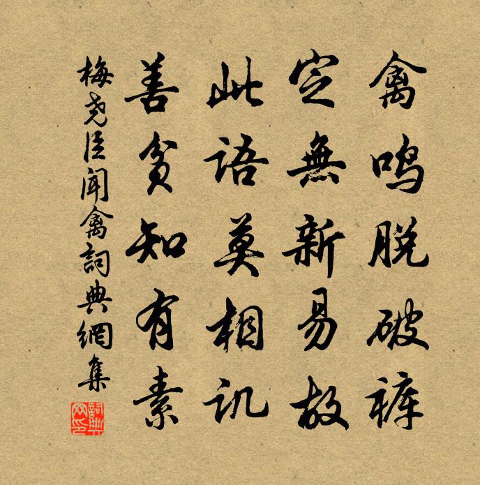 詩詞名句歷史字典書法欣賞書法字典國語詞典說文解字康熙字典古漢語字典標 題 作 者 詩 句 聞禽作者:梅堯臣 朝代:宋代聞禽原文禽鳴脫破褲,定無新易故。此語莫相譏,善貧知有素。詩詞問答問:聞禽的作者是誰?答:梅堯臣問:聞禽寫於哪個朝代?答:宋代問:梅堯臣的名句有哪些?答:梅堯臣名句大全梅堯臣聞禽書法欣賞聞禽書法作品詩詞推薦贈朱師裕方回〔宋代〕相府違離二十年,弁兮突見外孫賢。故因高韻如袁粲,豈但雄文似史遷。兵甲喧豗征馬地,音書斷阻去鴻天。因君過瑞龍觀道士錢起〔唐代〕不知誰氏子,煉魄家洞天。鶴待成丹日,人尋種杏田。靈山含道氣,物性皆自然。白鹿顧瑞草,驪龍蟠玉泉。得茲伯成先生席上賦贈韓修齡(韓,關中人,聖秋舍人小阮,流浪東吳,善說平話。)陳維崧〔清代〕月上梨花午。恰重逢、江潭舊識,喁喁爾汝。絳燭兩行渾不夜,添上三通畫鼓。說不盡、殘唐西楚。話到英雄兒女李堅甫淨居雜題一十三首退庵文同〔宋代〕未老先求退,題庵乃自呼。有才須進用,能保此名無。壽傅守釋若芬〔宋代〕鶴髮仙人年德尊,大賢之後更多聞。風流異日窺前輩,議論班班總不群。滿庭芳(賀晚生子)佚名〔宋代〕有分非難,是緣終合,采來還換須臾。少年培植,春意已敷腴。畢竟花多駐果,堅牢是、蚌老生珠。君知否,今番游西湖陳著〔宋代〕多謝東君巧剸裁,工夫都在禁城西。松蘿霽藹群峰寺,楊柳輕風十里堤。酒向畫闌樓上買,詩從翠館壁中題。都門【商調】梧葉兒_贈龜溪醫隱張雨〔元代〕贈龜溪醫隱唐茂之(二首)參苓籠,山水閒,好處在西關。放取詩瓢去,攜將酒榼還。把酒倩歌鬟,休舉似江南小送入我門來(除夕)胡浩然〔宋代〕荼壘安扉,靈馗掛戶,神儺烈竹轟雷。動念流光,四序式周回。須知今歲今宵盡,似頓覺明年明日催。向今夕,是送友人歸宣州張喬〔唐代〕失計復離愁,君歸我獨游。亂花藏道發,春水繞鄉流。暝火叢橋市,晴山疊郡樓。無為謝公戀,吟過曉蟬秋。臨江仙(明日小雨,已而風大作,復晚晴,遂見月,與客再登)葉夢得〔宋代〕捲地驚風吹雨去,卻看香霧輕浮。遙知清影遍南州。萬峰橫玉立,誰為此山留。邂逅一歡須共惜,年年長記今秋。題許尚書石刻二首姜特立〔宋代〕烏絲玉軸陀尼表,鬥草搴花錦不如。不是向來元佑腳,唐人文字晉人書。思竹窗白居易〔唐代〕不憶西省松,不憶南宮菊。唯憶新昌堂,蕭蕭北窗竹。窗間枕簟在,來後何人宿?閒居無瑕酬答假庭下三物作梅謝桃方岳〔宋代〕下欲成蹊春已殘,雨紅猶自有人看。極知不與君同調,但守平生一點酸。擬漢宮詞三首陳師道〔宋代〕月與秋期特地圓,花隨人意作春妍。郤因姊弟爭珠鳳,更欲君王意外憐。甘州/八聲甘州張炎〔宋代〕聽江湖、夜雨十年燈,孤影尚中州。對荒涼茂苑,吟情渺渺,心事悠悠。見說寒梅猶在,無處認西樓。招取樓邊月九曲櫂歌十首白玉蟾〔宋代〕幾點沙鷗泛碧流,蘆花兩岸暮雲愁。鼓樓岩下一聲笛,驚落梧桐飛起秋。偶成張耒〔宋代〕須知庖手有真如,合遣輪人笑讀書。擁褐 * 深閉目,老人於此有工夫。偶得佳酒懷尹少稷聞其連日致齋在台作長句寄韓元吉〔宋代〕孔君一月二十九日醉,太常一年三百五十九日齋。人生百歲駒過隙,直與外物勞形骸。君非太常何用爾,監祭有令吳太史慈孫元晏〔唐代〕聖德招賢遠近知,曹公心計卻成欺。陳韓昔日嘗投楚,豈是當歸召得伊。名句推薦南朝千古傷心事,猶唱後庭花。吳激《人月圓·南朝千古傷心事》 歸來三徑重掃,松竹本吾家。葉夢得《水調歌頭·秋色漸將晚》 焉知後之視今,不如今之視昔也?王通《中說·卷七·述史篇》 艱難苦恨繁霜鬢,潦倒新停濁酒杯。杜甫《登高》 入春才七日,離家已二年。薛道衡《人日思歸》 惆悵南朝事,長江獨至今。劉長卿《秋日登吳公台上寺遠眺》 夕陽倒影射疏林,江邊一帶芙蓉老。陳霆《踏莎行·晚景》 小樓昨夜又東風,故國不堪回首月明中。李煜《虞美人·春花秋月何時了》 明足以察秋毫之末,而不見輿薪,則王許之乎?孟子《孟子·梁惠王章句上·第八節》 江暗雨欲來,浪白風初起。何遜《相送》