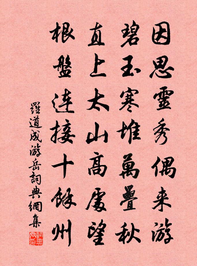 詩詞名句歷史字典書法欣賞書法字典國語詞典說文解字康熙字典古漢語字典標 題 作 者 詩 句 游岳作者:羅道成 朝代:宋代游岳原文因思靈秀偶來游,碧玉寒堆萬疊秋。直上太山高處望,根盤連線十餘州。詩詞問答問:游岳的作者是誰?答:羅道成問:游岳寫於哪個朝代?答:宋代羅道成游岳書法欣賞游岳書法作品詩詞推薦西江月譚處端〔元代〕學道休於外覓,靈苗出自心田。鐵牛耕透見根元。全在殷勤鍛鍊。認證元初面目,端身勿使邪偏。六鈞弓硬拽來圓陪群公登箕山賦得群字宋之問〔唐代〕許由去已遠,冥莫見幽墳。世薄人不貴,茲山唯白雲。寧知三千歲,復有堯為君。時佐激頹俗,登箕挹清芬。高節高宗皇帝輓詞留正〔宋代〕南北休兵久,仁恩及物深。九齡終帝夢,四海遏韶音。聖學高於古,衰衣始自今。一抔陵上土,他日卜嵩岑。送徐終秘校罷涇尉而歸梅堯臣〔宋代〕去年茶熟君得補,今來茶熟君已去。心曾不計茶有無,隼在高風自騰翥。昨日我送吳侯歸,未忍重臨離別處。不若送回聖過洞清會韓維〔宋代〕狂飈攬驚塵,□□□□□。支生強我游,華構忽在暇。入門已□□,□□□且況。主人道門老,興趣久已炎。□□王正卿何道夫和嘉字韻詩至數十道夫贈予數篇李流謙〔宋代〕清言元論極邊涯,南渡風流繼永嘉。中散一生慵作吏,淵明無日不思家。悠悠官路降胸臆,苒苒年光侮鬢華。人說黃相兒求詩陳著〔宋代〕相兒執筆請翁書,要受持從入學初。我有至言兒聽取,心宜莊敬氣宜舒。題陳將軍別墅李鹹用〔唐代〕明王獵士猶疏在,岩谷安居最有才。高虎壯言知鬼伏,葛龍閒臥待時來。雲藏山色晴還媚,風約溪聲靜又回。不獨雜曲歌辭。行路難五首賀蘭進明〔唐代〕君不見岩下井,百尺不及泉。君不見山上蒿,數寸凌雲煙。人生相命亦如此,何苦太息自憂煎。但願親友長含笑,菊趙蕃〔宋代〕蔓菊伶俜不自持,細香仍著野風吹。少年踴躍豈復夢,明日蕭條休更悲。潭水解令胡廣壽,夕英何補屈原飢。我今送兒深赴婺之月泉山長陳著〔宋代〕來汝深,吾語汝,汝今此行五百里。吾豈不欲汝在傍,朝夕告教從容里。世莫難於續書脈,孝莫大於養吾志。男兒浣溪沙納蘭性德〔清代〕記綰長條欲別難。盈盈自此隔銀灣。便無風雪也摧殘。青雀幾時裁錦字,玉蟲連夜剪春幡。不禁辛苦況相關。酬李侍御書記秋夕雨中病假見寄孟郊〔唐代〕秋風繞衰柳,遠客聞雨聲。重茲阻良夕,孤坐唯積誠。果枉移疾詠,中含嘉慮明。洗滌煩濁盡,視聽昭曠生。未覺客星閣胡仲弓〔宋代〕莫題詩句累先生,將謂先生亦釣名。說與往來台下客,可移一語贈玄英。送餘澤還義興胡寅〔宋代〕挾策漳濱兩韶稚,君後南隨州計吏。相逢冠歲璧池頭,頓覺詞華使人惴。謂宜云路恣騰踏,豈料霜蹄多蹶躓。君才偈二十二首釋洵〔宋代〕頭顱百皺發又白,兩手扶犁更出來。拈起舊時氈拍板,大家看我舞三台。囉囉哩,囉囉哩。無處有月波澄,有處無秋夜懷康節陳起〔宋代〕無眠輾轉聽更殘,心緒如絲起萬端。煎藥爐邊童夢曉,讀書檠下婦紉寒。狻猊斷火香猶婉,促織催秋袂怯單。願子新竹元稹〔唐代〕新篁才解籜,寒色已青蔥。冉冉偏凝粉,蕭蕭漸引風。扶疏多透日,寥落未成叢。惟有團團節,堅貞大小同。古意三首張耒〔宋代〕園中楊柳樹,飛舞似含羞。如何風靜處,盡放眼中愁。見維揚崔左丞李思衍〔宋代〕十里珠簾一半垂,楊州風物最宜詩。平山倚檻歐陽子,明月 * 杜牧之。吟筆新添梅鼎手,歌樓爭覓竹枝詞。濡毫名句推薦擾擾馬足車塵,被歲月無情,暗消年少。元好問《玉漏遲·詠杯》 綠池落盡紅蕖卻,荷葉猶開最小錢。楊萬里《秋涼晚步》 又到斷腸回首處,淚偷零。納蘭性德《山花子·風絮飄殘已化萍》 溫故,而知新,敦厚以崇禮。子思《中庸·第二十七章》 傷心闊別三千里,屈指思量四五年。韓偓《寒食日重遊李氏園亭有懷》 西風酒旗市,細雨菊花天。歐陽修《秋懷》 反水不收,後悔無及。范曄《後漢書·本紀·光武帝紀上》 朔風吹散三更雪,倩魂猶戀桃花月。納蘭性德《菩薩蠻·朔風吹散三更雪》 無執滯心,才是通方士;有做作氣,便非本色人。王永彬《圍爐夜話·第八六則》 自是相思抽不盡,卻教風雨怨秋聲。鄭燮《詠芭蕉》