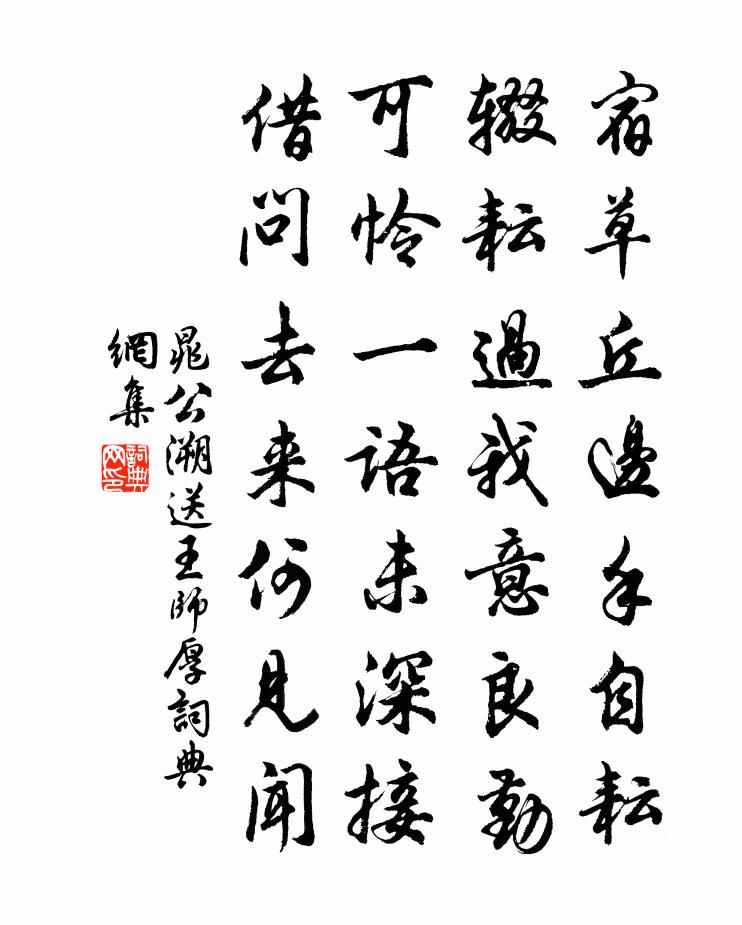 詩詞名句歷史字典書法欣賞書法字典國語詞典說文解字康熙字典古漢語字典標 題 作 者 詩 句 送王師厚作者:晁公溯 朝代:宋代送王師厚原文宿草丘邊手自耘,輟耘過我意良勤。可憐一語未深接,借問去來何見聞。詩詞問答問:送王師厚的作者是誰?答:晁公溯問:送王師厚寫於哪個朝代?答:宋代晁公溯送王師厚書法欣賞送王師厚書法作品詩詞推薦寄黃濟川吳則禮〔宋代〕一片桃花有底急,咬咬已複韻春懷。痿羸不覺楊花罷,款久忽然蝴蝶來。如許快人帆腹飽,絕如撩我浪頭開。異時春從天上來 承御韓氏者,祖母之 也,姿淑王惲〔元代〕御。事金宣宗天與二帝,歷十有九年,正大末以放出宮。明年壬辰,鑒輅樂巡,又明年國亡於蔡,韓遂謫石抹子昭吏上宋祁〔宋代〕吏上重門鑰,樓喧疊鼓撾。翠沈遙嶺樹,紅斂暝叢花。杼促蟲聲急,眉拖月魄斜。煩心銷熱盡,不待鎮嘉瓜。霅上宴別許渾〔唐代〕山斷水茫茫,洛人西路長。笙歌留遠棹,風雨寄華堂。紅壁耿秋燭,翠簾凝曉香。誰堪從此去,雲樹滿陵陽。答張令卷梅堯臣〔宋代〕嘗聞甥似舅,似舅詩尤少。古意得河源,新聲變春鳥。讀之不敢倦,十未能一曉。顛倒文字間,使吾心擾擾。青玉案 贈染何先生馬鈺〔元代〕無涯火院常籠罩。似醉夢,難分曉。賣弄惺惺非耍俏。爭財競氣,戀妻男,算到底,終須掉。譬似無常坑窖了。便磁釣翁李新〔宋代〕尺巘方壺小,泓泉渤海深。陶公慈母手,抔土故人心。蓑笠不愁敝,鰷鱨何處尋。虛堂值蕭瑟,猶苦百蟲吟。題辛道士房儲光羲〔唐代〕全神不言命,所尚道家流。迨此遠南楚,遂令思北游。先生秀衡岳,玉立居玄丘。門帶江山靜,房隨瑤草幽。逍遙衡門佚名〔先秦〕衡門之下,可以棲遲。泌之洋洋,可以樂飢。豈其食魚,必河之魴?豈其取妻,必齊之姜?豈其食魚,必河之鯉?賞竹吟金朋說〔宋代〕放鶴空庭竹似賓,輕風晴日綠篩金。幽人寧使食無肉,不可軒墀少此君。句羅椅〔宋代〕華裾客子袖文過。jm全宋詩卷三二九一張仲良久約出郊以詩督之楊萬里〔宋代〕百花亭下花如海,子厚宅前溪似油。幕下風流法曹掾,坐窗猶未作遨頭。送唐次武元衡〔唐代〕都門去馬嘶,灞水春流淺。青槐驛路長,白日離尊晚。望望煙景微,草色行人遠。載答林逋〔宋代〕官曹久已稱廉吏,田裡時來顧散人。文戰談圍棋局外,絳侯何事號功臣。曉兒輩吳潛〔宋代〕諸兒憐我太焦熬,我把真機告汝曹。外白內黃常抱守,出朱入墨任紛撓。治齊固有曹參逸,理蜀寧無諸葛勞。畢竟常寧道中懷許介之樂雷發〔宋代〕雨過池塘路未乾,人家桑柘帶春寒。野巫豎石為神像,稚子搓泥作藥丸。柳下兩姝爭餉路,花邊一犬吠征鞍。行吟又賡張翼韻朱元璋〔明代〕臘前三白曠無涯,應是天公降六花。九曲河深凝底凍,張騫無處再乘槎。落南二年無人相牽輓詩幾於廢羅子琳跫然至止曾豐〔宋代〕冷落江西香火緣,嶺南人少問吾傳。一行水陸余千里,兩歲風花僅百篇。句眼竟誰知落處,古囊長是掛閒邊。獿人林正甫察院出示送劉德修都運殿院詩並德修和虞儔〔宋代〕彈劾生風筆有神,天教末路得相親。從來名下無虛士,今見朝端第一人。銷印不知誰發難,投珠那得謂無因。何妨偈二首釋顯〔宋代〕吃粥了也,頭上安頭。洗缽盂去,為蛇畫足。更問如何,自納敗闕。名句推薦不盡眼中青,是愁來時節張元乾《石州慢·寒水依痕》 我行殊未已,何日復歸來。宋之問《題大庾嶺北驛》 兩人對酌山花開,一杯一杯復一杯。李白《山中與幽人對酌》 虎踞龍蟠何處是,只有興亡滿目。辛棄疾《念奴嬌·登建康賞心亭呈史致道留守》 況是青春日將暮,桃花亂落如紅雨。李賀《將進酒》 精誠所加,金石為開。范曄《後漢書·列傳·光武十王列傳》 好時節,願得年年,常見中秋月。徐有貞《中秋月·中秋月》 中秋月。月到中秋偏皎潔。徐有貞《中秋月·中秋月》 歲暮遠為客,邊隅還用兵。杜甫《歲暮》 暗教愁損蘭成,可憐夜夜關情張炎《清平樂·候蛩淒斷》