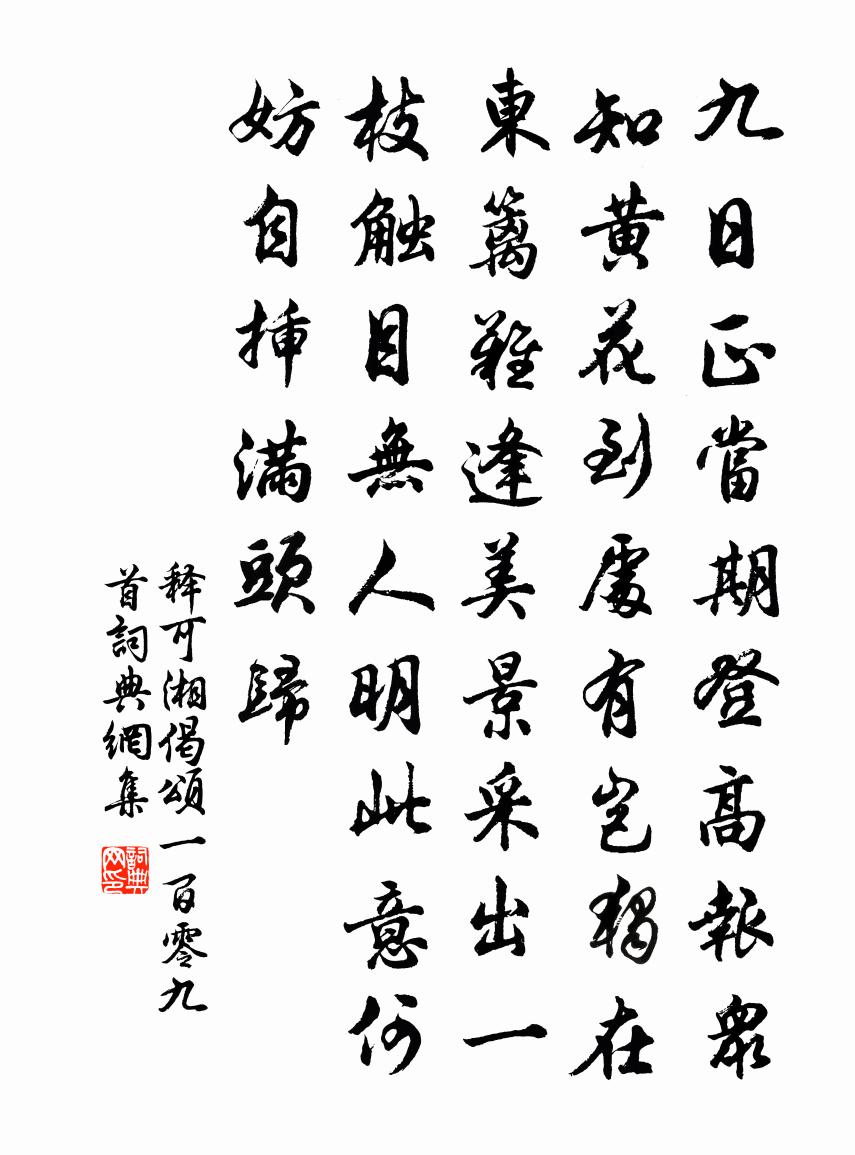 詩詞名句歷史字典書法欣賞書法字典國語詞典說文解字康熙字典古漢語字典標 題 作 者 詩 句 偈頌一百零九首作者:釋可湘 朝代:宋代偈頌一百零九首原文九日正當期,登高報眾知。黃花到處有,豈獨在東籬。難逢美景,采出一枝。觸目無人明此意,何妨自插滿頭歸。詩詞問答問:偈頌一百零九首的作者是誰?答:釋可湘問:偈頌一百零九首寫於哪個朝代?答:宋代釋可湘偈頌一百零九首書法欣賞偈頌一百零九首書法作品詩詞推薦無俗念 樂道丘處機〔元代〕迎今送古,嘆春花秋月,年年如約。物換星移人事改,多少翻騰淪落。家給千兵,官封一品,得也無依託。光陰如蟬賦曹植〔魏晉〕唯夫蟬之清素兮,潛厥類乎太陰。在盛陽之仲夏兮,始游豫乎芳林。實澹泊而寡慾兮,獨怡樂而長吟。聲皦皦而彌舊聞邵叟名今識面目於詩句字畫中輒取二詩賡王洋〔宋代〕曾參古佛問忘情,可笑初孩尚未名。自刻肺肝戾定誓,時牽耳目雙寒盟。苦無藉在書窗冷,賴有知憐風竹聲。好是頌證道歌證道歌釋印肅〔宋代〕放四大,莫把促,本無毫髮堪依託。地水火風亦假名,十二緣生如兔角。殘句背之不見與無同蘇軾〔宋代〕背之不見與無同。舟行陳藻〔宋代〕眾流江漸闊,百怪石如生。錯聽人聲鬧,空岩答槳鳴。晚霽趙蕃〔宋代〕雨歇蟬聲抱木悲,茅檐獨立看雲移。一陰十日不見月,想見清光分外奇。北山秋晚徐夤〔唐代〕十載衣裘盡,臨寒隱薜蘿。心閒緣事少,身老愛山多。玉露催收菊,金風促剪禾。燕秦正戎馬,林下好婆娑。堯戒佚名〔先秦〕戰戰慄栗,日謹一日。人莫躓于山,而躓於垤。結客少年場行庾信〔南北朝〕結客少年場。春風滿路香。歌撩李都尉。果擲潘河陽。隔花遙勸酒。就水更移床。今年喜夫壻。新拜羽林郎。定知秋懷二首曾鞏〔宋代〕為州詎非忝,即事亮何成。幸茲桑麻熟,復爾倉箱盈。閭里凶黨戢,階除嚚拺訟清。日攜二三子,飽食中園行。念海濱石根莖而生類於芝者俗呼為石花已為作記鄭剛中〔宋代〕幻化無窮,天巧難覷。諸香妙華,種種呈露。都隨春來,亦隨春去。繽紛顛倒,與空同處。此華希有,周流四序。城南即事張栻〔宋代〕茅亭水溜四周遭,花木經春一一高。卻望西山隔江水,經思一葉泛雲濤。秋日留別義初上人羅鄴〔唐代〕塞寺窮秋別遠師,西風一雁倍傷悲。每嗟塵世長多事,重到禪齋是幾時。霜嶺自添紅葉恨,月溪休和碧雲詞。關河泛舟和持國梅堯臣〔宋代〕綠源去未窮,夾岸樹蒙蒙。弱蔓低侵水,殘芳不隱叢。浣衣思越婦,折筍擬江童。薄暮回船處,潭魚動鏡中。後圃侍郎芍藥酴醾三花競發戴時可載酒來同酌陳著〔宋代〕前日對花賦三詩,醉後誰復記當時。雪溪公子忽呈似,一見如夢中見之。世閒何事非虛妄,嘯里著句豈狂痴。富公素梅 四二王冕〔元代〕仙子歸來夜未央,瑞香風動翠羅裳。月明無處韜清影,簫管迎春上玉堂。塞上行鮑溶〔唐代〕西風應時筋角堅,承露牧馬水草冷。可憐黃河九曲盡,氈館牢落胡無影。又次韻二首廖行之〔宋代〕年來那復不時須,斗酒珍藏敢罪孥。安我饋漿窮逆旅,有誰攜榼訪幽居。粗粱何擇皆庚癸,題品寧當辨酪酥。自笑題鳳翔西郭新亭姚合〔唐代〕西郭塵埃外,新亭制度奇。地形當要處,人力是閒時。結構方殊絕,高低更合宜。棟樑清俸買,松竹遠山移。佛寺名句推薦幾硯昔年游,於今成十秋。司馬光《送龔章判官之衛州·新及第》 一日不見,如三月兮。佚名《子衿》 傷心故人去後,冷落新詩。晁沖之《漢宮春·梅》 事親孝,與士信,臨財廉,取予義,分別有讓,恭儉下人,常思奮不顧身以徇國家之急。班固《漢書·傳·司馬遷傳》 一葉度春風,芳芳自相接。蕭衍《芳樹》 糝徑楊花鋪白氈,點溪荷葉疊青錢。杜甫《絕句漫興九首·其七》 桂棹兮蘭枻,斵冰兮積雪;屈原《九歌》 五更櫪馬靜無聲。鄰雞猶怕驚。吳文英《醉桃源·元日》 誰憐散髻吹笙,天涯芳草關情。納蘭性德《清平樂·孤花片葉》 君使臣以禮,臣事君以忠。孔子弟子《論語·八佾篇》