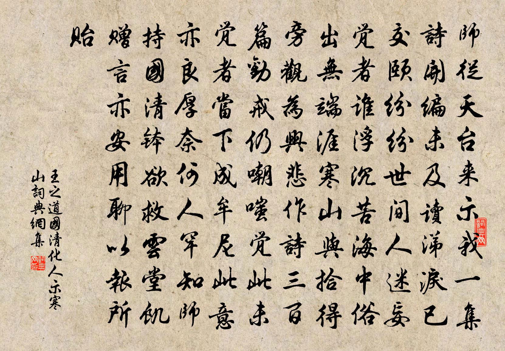 詩詞名句歷史字典書法欣賞書法字典國語詞典說文解字康熙字典古漢語字典標 題 作 者 詩 句 國清化人示寒山作者:王之道 朝代:宋代國清化人示寒山原文師從天台來,示我一集詩。開編未及讀,涕淚已交頤。紛紛世間人,迷妄覺者誰。浮沉苦海中,俗出無端涯。寒山與拾得,旁觀為興悲。作詩三百篇,勸戒仍嘲嗤。覺此未覺者,當下成牟尼。此意亦良厚,奈何人罕知。師持國清缽,欲救雲堂飢。贈言亦安用,聊以報所貽。詩詞問答問:國清化人示寒山的作者是誰?答:王之道問:國清化人示寒山寫於哪個朝代?答:宋代王之道國清化人示寒山書法欣賞國清化人示寒山書法作品詩詞推薦南歌子楊無咎〔宋代〕巾染烏煙碧,衣拖曉露鮮。盈盈風骨小神仙。特地勾牽處士、夢巫山。星宿羅胸次,牙籤弄指端。憑君為算小行年偈傾一百六十九首釋智朋〔宋代〕一棒一喝,疾雷破山,一提一唱,崩空峭壁。諸佛傍觀有分,諸祖拈掇不出。只如入已還閉。起潛觀心四絕詞旨俱勝仍用非字奉酬以盡愚衷錢時〔宋代〕恥過如何更作非,觀心須識動之微。一朝透脫無疆界,處處吾家不用歸。挽劉文蔚家鉉翁〔宋代〕先天妙義說來多,聖處工夫幾切磋。一點英靈長不昧,平生學力定難磨。暮春風景堪聞瑟,塵世紛華付擲梭。聞道嚴州道中見月以禱雨不飲陳宓〔宋代〕赤城三千里,離家四十程。豈無瓶可倒,忍對月仍明。在處嗟吁氣,窮村鼓鐸聲。有神司下土,能不惻垂情。送葉尊師歸處州耿湋〔唐代〕風馭南行遠,長山與夜江。群祆離分野,五嶽拜旌幢。石髓調金鼎,雲漿實玉缸。犭斤犭斤吠聲曉,洞府有仙厖。和宋永兄愛日樓見寄八首黃公度〔宋代〕野意樓前滿,秋聲樹杪回。歲華行老矣,午夢思悠哉。碌碌甘捐棄,時時幸往來。不才詩有債,多病酒為媒。次韻子瞻感舊蘇轍〔宋代〕還朝正三伏,一再趨未央。久從江海游,苦此劍佩長。夢中驚和璞,起坐憐老房。為我忝丞轄,置身願並涼。此心村舍陸游〔宋代〕筱屋楓林下,柴門芡浦旁。先鳴雞腷膊,徐上日蒼涼。服藥貧寧輟,觀書老有常。仍須教童徲,世世力耕桑。乙未和楊謹仲教授春興楊萬里〔宋代〕歸歟還復換年芳,不分官梅惱石腸。黃帽政堪供短掉,白頭可更獻長楊。忽逢社裡催搜句,安得花邊對舉觴?天上游山寺周南〔宋代〕山寺清明蛺蝶飛,中庭古佛供琉璃。僧房也有追游市,瓦狗泥車誑小兒。緣識宋太宗〔宋代〕天界殊勝理,凡愚不易知,曩因誰可究,淺近故懷疑。的實歸真性,回邪入正持。哭師皋白居易〔唐代〕南康丹旐引魂回,洛陽籃舁送葬來。北邙原邊尹村畔,月苦煙愁夜過半。妻孥兄弟號一聲,十二人腸一時斷。往者答何君表感古冢黃庭堅〔宋代〕墨頭萬蟲地上行,大鈞鉅冶之化生。反覆生沒如車軫,直與歲月為將迎。至人獨解諸物攖,鏈神含嚼太和精。不取積雨新晴,鴐幸聚景園擬口號楊萬里〔宋代〕帝心憂麥復憂桑,一念通天轉雨腸。五色日華銷積靄,三春花草殿余芳。黃雲暖照天顏喜,紅藥濃熏禁篽香。見說明融盆池二首沈說〔宋代〕老瓦盆深漾細萍,雨多流卻半瓣青。夜涼偶出庭心看,缺處光涵三兩星。龍井十題坤泉釋元淨〔宋代〕物外老餘生,泉發幽岩里。自可給瓶盂,不羨滄溟水。飯牛歌寧戚〔先秦〕南山矸,白石爛,生不遭堯與舜禪。短布單衣適至骭,從昏飯牛薄夜半,長夜漫漫何時旦?滄浪之水白石粲,中有禽言周紫芝〔宋代〕婆餅焦雲穰穰,麥穗黃。婆餅欲焦新麥香,今年麥熟不敢嘗,斗量車載傾囷倉,化作三軍馬上糧。過蒼嶺樓鑰〔宋代〕黃雲滿塢沙田稻,白雪漫山薺菜花。路人縉雲頻借問,碧香酒好是誰家。名句推薦樂易者常壽長,憂險者常夭折。荀子《荀子·榮辱》 幽蘭旋老,杜若還生,水鄉尚寄旅。吳文英《鶯啼序·春晚感懷》 相思只在,丁香枝上,豆蔻梢頭。王雱《眼兒媚·楊柳絲絲弄輕柔》 宜有詞仙,擁素雲黃鶴,與君遊戲。姜夔《翠樓吟·淳熙丙午冬》 谷鳥吟晴日,江猿嘯晚風。李白《江夏別宋之悌》 桃花落,閒池閣。山盟雖在,錦書難托。陸游《釵頭鳳·紅酥手》 禍與福同門,利與害同城。佚名《增廣賢文·下集》 日出入安窮?時世不與人同。佚名《日出入》 勞歌一曲解行舟,紅葉青山水急流。許渾《謝亭送別》 得時無怠,時不再來,天予不取,反為之災。左丘明《國語·越語·越興師伐吳而弗與戰》