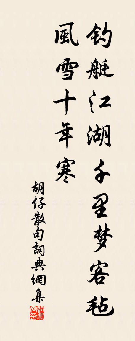 詩詞名句歷史字典書法欣賞書法字典國語詞典說文解字康熙字典古漢語字典標 題 作 者 詩 句 句作者:胡仔 朝代:宋代句原文釣艇江湖千里夢,客氈風雪十年寒。詩詞問答問:句的作者是誰?答:胡仔問:句寫於哪個朝代?答:宋代胡仔句書法欣賞句書法作品詩詞推薦野狐泉柳林元稹〔唐代〕去日野狐泉上柳,紫牙初綻拂眉低。秋來寥落驚風雨,葉滿空林踏作泥。眉州鹿鳴宴李石〔宋代〕六六成鱗吹,呦呦賦鹿鳴。三仙隨勸駕,千佛要題名。俎豆初筵秩,衣冠習俗榮。便須煩舉送,我亦魯諸生。如夢令張雨〔元代〕靜默兩家茅舍。特地月明狼藉。不管候蟲吟,高枕北窗清夜。清夜。清夜。涼似樊川水榭。送吳促庶待制出守長沙王珪〔唐代〕畫船催鼓送將行,一醉離觴下玉京。延閣漏間空紫橐,洞庭波起獵紅旌。曾冠獬廌奸回讋,卻佩龍泉種落驚。莫向頌古釋道顏〔宋代〕單刀直入更休論,擬議之間賓主分。不是放他旻德過,須知興化棒頭明。擬九頌雁湖程公許〔宋代〕水平湖兮溶溶,雁鳴秋兮雝雝,氣相求兮聲相應,渺萬里兮葭葺叢。晴雲淡兮天宇清,行不亂兮字縱橫。伊美人兮悼秦醫劉克莊〔宋代〕最曉陰陽證,於身獨不靈。有妻持舊肆,無子學遺經。蟲蝕抄方篋,莎生曬藥庭。城中醫絕少,堪惜爾雕零。山居雜詩九十首曹勛〔宋代〕古半喜妙供,溪蓀種勻抽。蘸水浮翠蝟,絡石駢栗皺。薿薿巧凝綠,梢梢眇含秋。相對几案間,蕭然無與儔。春社日效宛陵先生體社雨陸游〔宋代〕開歲才幾時,春社忽已及。茫茫草色深,蕭蕭雨聲急。扶犁行白水,不惜芒屨濕。村童更可憐,赤腳牛背立。大遊仙詩(一作歐陽炳)歐陽炯〔唐代〕赤城霞起武陵春,桐柏先生解守真。白石橋高曾縱步,朱陽館靜每存神。囊中隱訣多仙術,肘後方書濟俗人。自領經西塢偶題溫庭筠〔唐代〕搖搖弱柳黃鸝啼,芳草無情人自迷。日影明滅金色鯉,杏花唼喋青頭雞。微紅奈蒂惹峰粉,潔白芹芽穿燕泥。借問慧和微以布衫送壽昌可師有偈答之戲成四首釋慧空〔宋代〕寸絲不掛魚游網,萬善嚴身月入雲。若是壽昌端的處,明年一領更煩君。義貓行錢時〔宋代〕我家老狸奴,健捕無其比。去年能養兄,二男而一女。種草不碌碌,趫捷俱可喜。策勛到鄰家,高臥不憂鼠。今年梅市道中陸游〔宋代〕去去浮官浦,悠悠數客檣。蓼花低蘸水,楓樹老經霜。簫鼓迎神鬧,鉏耰下麥忙。城西小市散,歸艇滿斜陽。沁園春毛滂〔宋代〕秀稟元精,靈鍾崧岳,命世大賢。自飛英任路,承流百里,郎官星彩,輝映經躔。勁柏凌霜,香梅嬌雪,珪月彎彎望江南 詠弦月納蘭性德〔清代〕初八月,半鏡上青霄。斜倚畫闌嬌不語,暗移梅影過紅橋,裙帶北風飄。蝶戀花黃裳〔宋代〕萬籟無聲天地靜。清抱朱弦,不愧丹霄鏡。照到林梢風有信。抬頭疑是梅花領。萬感只應閒對景。獨倚危欄,擾擾酬楊侍郎憑見寄劉禹錫〔唐代〕翔鸞闕底謝皇恩,纓上滄浪舊水痕。疏傅揮金忽相憶,遠擎長句與招魂。洋州三十景蓼嶼鮮于侁〔宋代〕盈枝紅欲滴,照水色更好。朝暮幾回新,何用催秋老。減字木蘭花(五勸)沈瀛〔宋代〕酒巡未止。更說五行人聽喜。康節淳風。說道諸公運數通。乞漿得酒歲在申酋,乞漿得酒。更檢戊申前定壽。亥子名句推薦鶯嘴啄花紅溜,燕尾點波綠皺。秦觀《如夢令·春景》 舞低楊柳樓心月,歌盡桃花扇底風。晏幾道《鷓鴣天·彩袖殷勤捧玉鍾》 春日載陽,有鳴倉庚。佚名《七月》 天公見玉女,大笑億千場。李白《短歌行》 殊方日落玄猿哭,舊國霜前白雁來。杜甫《九日五首·其一》 金谷園中柳,春來似舞腰。李益《上洛橋》 映階碧草自春色,隔葉黃鸝空好音。杜甫《蜀相》 登泰山而小天下。孟子《孟子·盡心章句上·第二十四節》 形在江海之上,心存魏闕之下劉勰《文心雕龍·神思》 殘杏枝頭花幾許。啼紅正恨清明雨。趙令畤《蝶戀花·欲減羅衣寒未去》