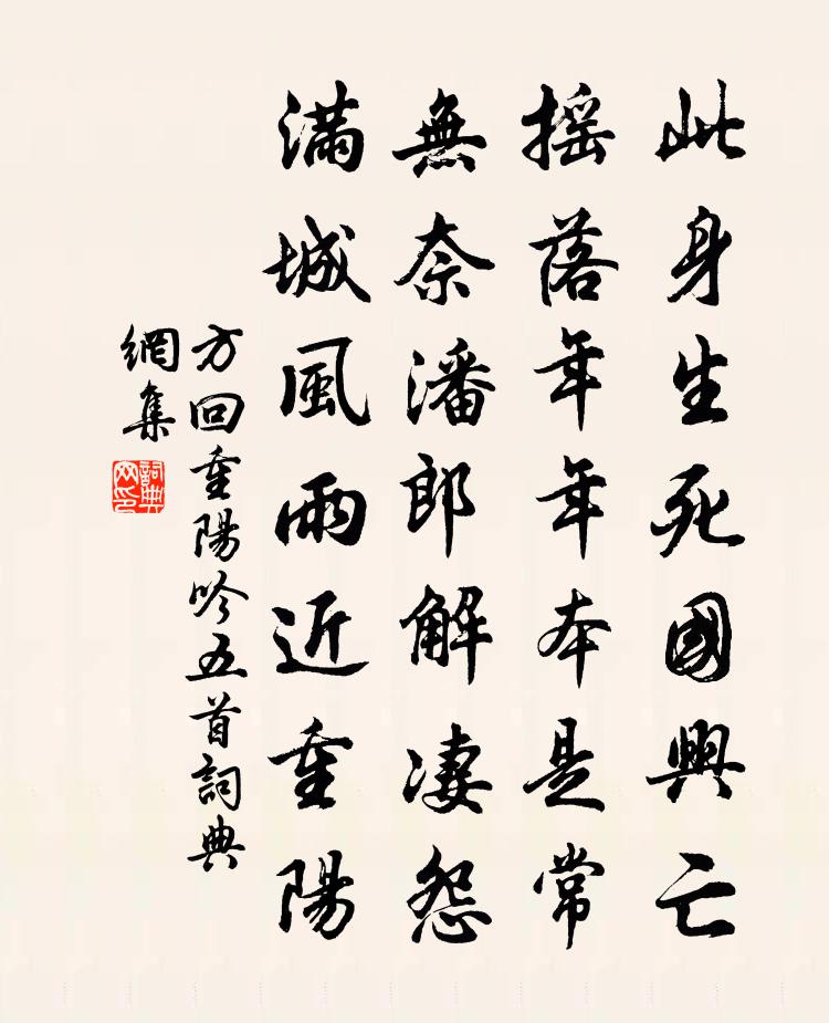 詩詞名句歷史字典書法欣賞書法字典國語詞典說文解字康熙字典古漢語字典標 題 作 者 詩 句 重陽吟五首作者:方回 朝代:宋代重陽吟五首原文此身生死國興亡,搖落年年本是常。無奈潘郎解悽怨,滿城風雨近重陽。詩詞問答問:重陽吟五首的作者是誰?答:方回問:重陽吟五首寫於哪個朝代?答:宋代方回重陽吟五首書法欣賞重陽吟五首書法作品詩詞推薦峨眉真人陳圖南真贊黃庭堅〔宋代〕一藤出山,來正人紀。見藝祖太宗,曰天下定矣。如月在天,去來無疵。巍巍頎頎,為帝王師。聖哲肺腑,天人眉高公權之母郭氏輓詩魏了翁〔宋代〕婦道始衷終,寧過三者從。髧髦維我特,蓬首為誰容。但識同心處,寧拘異域封。壇前兩溪水,晝夜自溶溶。江神子(發金陵)方岳〔宋代〕梅花吹夢過溪橋。路迢迢。雪初消。似恁天寒,詩瘦想無柳。聽得草堂人有語,能幾日,是生朝。亂雲深處洗山瓢邊將曾鞏〔宋代〕太祖太宗能得人,長壘橫邊遮虜塵。太傳李漢超,侍中何繼筠,二子追接吳與孫,鎮齊撫棣功業均。卓哉祖宗信英壽徐意一參政方蒙仲〔宋代〕黃花晚節香愈勁,老圃秋容景更奇。欲侑瓣香無好語,且偷忠獻一聯詩。賡李篔房韻釋文珦〔宋代〕故國頻關夢,春深一到來。卻因風景異,便棹雨舟回。其可忘諸夏,真堪賦七哀。天居曾入處,滿目舊寒苔。雜曲歌辭楊柳枝皇甫松〔唐代〕春入行宮映翠微,玄宗侍女舞菸絲。如今柳向空城綠,玉笛何人更把歡。呈李卿黃庭堅〔宋代〕歌舞如雲四散飛,東園籃轝醉歸時。細看春色低紅燭,仰折花枝墜接(上四下離)。仙李迴風轉長袖,野桃侵雨浸山齋獨宿贈晏上人楊衡〔唐代〕幢幢雲樹秋,黃葉下山頭。蟲響夜難度,夢閒神不游。窗燈寒幾盡,簾雨曉階愁。何以禪棲客,灰心在沃州。題趙景安二亭尺五二首陳造〔宋代〕坐看銀山卷壞雲,濤頭蜚過不逡巡。世間壯觀何人領,付與亭中筆有神。贈遠二首薛濤〔唐代〕擾弱新蒲葉又齊,春深花發塞前溪。知君未轉秦關騎,月照千門掩袖啼。芙蓉新落蜀山秋,錦字開緘到是愁。閨閣高宜試劍石李新〔宋代〕巨石中分斷,涓流自此東。堯仁方宅土,項氏曷當鋒。興起漢高業,勤勞夏禹功。故應行道者,知古企遺蹤。釋迦出山相贊釋師範〔宋代〕入山去,何所圖,出山來,胡為乎。早知今日事,悔不憤當初。唐多令劉辰翁〔宋代〕日落紫霞洲。蘭舟穩放流。玉虹仙、如在黃樓。何必錦袍吹玉笛,聽欸乃、數聲秋。赤壁舞濤頭。周郎還到不。倚句晏殊〔宋代〕素花皎霜雪,紅艷比瑤瓊。呈高庵偈釋自圓〔宋代〕外國言音不可窮,起雲亭下一時通。口門廣大無邊際,吞盡楊歧栗棘蓬。韓子師朝路為小人無禮去國再來婺女姜特立〔宋代〕推敲乍可恕詩客,攘臂豈容遭怒螗。三尺何時屍鼠輩,九霄一日失鵷行。君王擬聽尚書履,使者行催相園裝。共喜送劉半千平陽簿歐陽修〔宋代〕嶺梅歸驛路迢迢,越鳥巢傾木半喬。松徑就荒聊 * ,桂叢留隱定相招。家庭噪鵲爭喧樹,夜帳驚猿自擁條。何處題雁盪山范宗尹〔宋代〕一逕入幽,隨山幾縈盤。雲樹深蓊蔚,石溪響潺湲。我來春色晚,山花亦何繁。好鳥不知名,向人自關關。遺我發悼亡姬韋莊〔唐代〕鳳去鸞歸不可尋,十洲仙路彩雲深。若無少女花應老,為有姮娥月易沈。竹葉豈能消積恨,丁香空解結同心。湘江名句推薦為有書來與我期,便從蘭杜惹相思。莊棫《定風波·為有書來與我期》 尋尋覓覓,冷冷清清,淒悽慘慘戚戚。李清照《聲聲慢·尋尋覓覓》 白水滿春塘,旅雁每迥翔。沈約《詠湖中雁》 無心非,名為錯。有心非,名為惡。李毓秀《弟子規·信》 寧可濕衣,不可亂步李汝珍《鏡花緣·第二十回》 雪照山城玉指寒,一聲羌管怨樓間。劉著《鷓鴣天·雪照山城玉指寒》 江春不肯留歸客,草色青青送馬蹄。劉長卿《送李判官之潤州行營》 長夏村墟風日清,檐牙燕雀已生成。張耒《夏日三首·其一》 風雨送春歸,飛雪迎春到。 * 《卜運算元·詠梅》 蕭條清萬里,瀚海寂無波。李白《塞上曲》