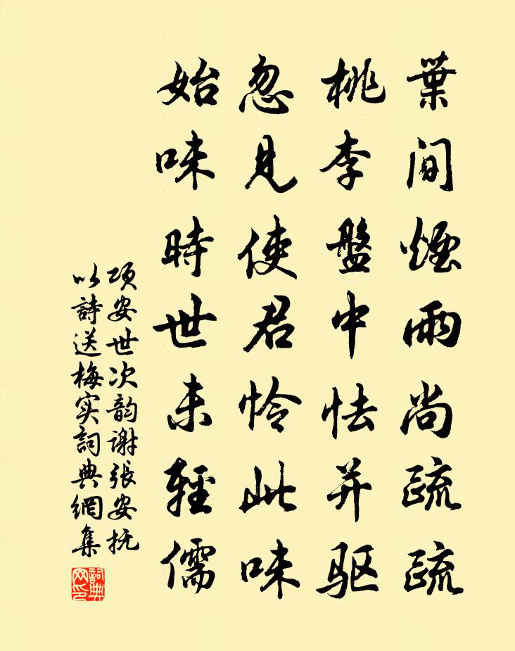 詩詞名句歷史字典書法欣賞書法字典國語詞典說文解字康熙字典古漢語字典標 題 作 者 詩 句 次韻謝張安撫以詩送梅實作者:項安世 朝代:宋代次韻謝張安撫以詩送梅實原文葉間煙雨尚疏疏,桃李盤中怯並驅。忽見使君憐此味,始味時世未輕儒。詩詞問答問:次韻謝張安撫以詩送梅實的作者是誰?答:項安世問:次韻謝張安撫以詩送梅實寫於哪個朝代?答:宋代項安世次韻謝張安撫以詩送梅實書法欣賞次韻謝張安撫以詩送梅實書法作品詩詞推薦獨處陸游〔宋代〕老夫閉門衰疾嬰,小兒適有南山行,一奴入市暮未返,愔愔不聞鳥雀鳴。地爐火死凍腳硬,欲作薄粥愁空槍。平生包家山董嗣杲〔宋代〕綺霞蒸日透林梢,一族南山尚姓包。冷水峪邊苔色老,沖雲樓下樹陰高。園鄰古道傳耕籍,台倚青城想拜郊。欲趁山窩適興何夢桂〔宋代〕剩得閒身鎮自憐,更憐閒占此山泉。滿階碧草客稀到,半榻白雲人對眠。窗影枝搖知雀踏,壁痕苔濕認蝸涎。日長秋夜吟楊冠卿〔宋代〕銅壺漏澀秋宵永,翠梧葉落敲金井。錦帳香消枕玉寒,驚回昨夢難重省。起來刁斗連營靜,碧雲飛下征鴻影。蠻箋光宅寺王安石〔宋代〕齊安孤起宋興前,光宅相仍一水邊。蜂分蟻爭今不見,故窠遺垤尚依然。五王廟張舜民〔宋代〕清汴河邊五君子,身遏橫流同日死。火炎曾是及池魚,世變安能顧妻子。百尺高城不足憑,日月所照惟孤誠。當其聞武均州報已復西京陸游〔宋代〕白髮將軍亦壯哉,西京昨夜捷書來。胡兒敢作千年計,天意寧知一日回。列聖仁恩深雨露,中興赦令疾風雷。懸知徐道士水墨屏四首白玉蟾〔宋代〕亂山草斜出,危岡竹倒懸。人家春樹里,山色夕陽邊。九月初作陸游〔宋代〕富貴功名未足雲,平生一飯不忘君。喔詩高韻淒金石,把釣幽情渺水雲。落葉打窗秋已暮,歸鴉泊樹日將曛。欲知永樂縣所居一草一木無非自栽今春悉已芳茂因書即事一章李商隱〔唐代〕手種悲陳事,心期玩物華。柳飛彭澤雪,桃散武陵霞。枳嫩棲鸞葉,桐香待鳳花。綬藤縈弱蔓,袍草展新芽。學植挽崇憲靖王詩虞儔〔宋代〕龔慶安僖八十春,綿綿仙李更蟠根。王封一品身尤貴,位冠三師德愈尊。華萼樓邊空墮淚,白蘋洲上重銷魂。哀榮題梅嶺雲封四絕戴復古〔宋代〕鑿破青山兩壁開,石頭路上踏成埃。梅花自與白雲笑,幾見夷齊出嶺來。頌十玄談釋印肅〔宋代〕祖祖,如鐘鼓,未擊有意周天普。虛幻形聲本自無,如如不動亘今古。中呂·普天樂·酒色財氣滕賓〔元代〕酒謫仙強,劉伶繆。笑豪來鯨吸,有甚風流?聊復爾,無何有。醞釀潮紅春風透,興來時付與觥籌。頻頻到口,輕史太師入覲賜帶以不知官高卑玉帶懸金魚為韻釋寶曇〔宋代〕何年倦霖雨,言田亦公心。一犁不入土,無因致千金。宿嚴陵釣台神穎〔唐代〕寒谷荒台七里洲,賢人永逐水東流。獨猿叫斷青天月,千古冥冥潭樹秋。紹興以後時享二十五首真宗〔宋代〕於穆文獻,自天發祥。筆基明命,錫義無疆。子孫千億,宗社靈長。神之格思,如在洋洋。木蘭花慢(上壑翁壽)張榘〔宋代〕豆花輕雨霽,更七日、是中秋。記分野三台,家山雙闕,孕秀名流。平生佐時大略,有忠勤、一念等伊周。十載清行住坐臥三十二頌釋印肅〔宋代〕聞道真空不著言,信心清淨在拳拳。只將此性光明遍,語默行藏豈離禪。哭薛子舒二首劉克莊〔宋代〕醫自金壇至,猶言疾可為。瀕危人未信,聞死世皆疑。友共收殘藁,妻能讀殮儀。借來書冊子,掩淚付孤兒。名句推薦鳧脛雖短,續之則憂;鶴脛雖長,斷之則悲。莊子《莊子·外篇·駢拇》 好去不須頻下淚,老僧相伴有煙霞。金地藏《送童子下山》 它山之石,可以攻玉。佚名《鶴鳴》 君子之德風,小人之德草,草上之風必偃。孔子弟子《論語·顏淵篇》 隔座送鉤春酒暖,分曹射覆蠟燈紅。李商隱《無題·昨夜星辰昨夜風》 繁枝容易紛紛落,嫩葉商量細細開。杜甫《江畔獨步尋花七絕句》 道不同,不相為謀。孔子弟子《論語·衛靈公篇》 人語西風,瘦馬嘶殘月。王國維《蝶戀花·滿地霜華濃似雪》 故不登高山,不知天之高也;不臨深溪,不知地之厚也;荀子《勸學》 盡道豐年瑞,豐年事若何羅隱《雪》