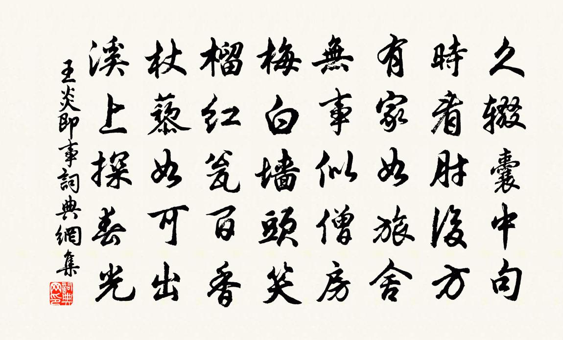 詩詞名句歷史字典書法欣賞書法字典國語詞典說文解字康熙字典古漢語字典標 題 作 者 詩 句 即事作者:王炎 朝代:宋代即事原文久輟囊中句,時看肘後方。有家如旅舍,無事似僧房。梅白牆頭笑,榴紅瓮百香。杖藜如可出,溪上探春光。詩詞問答問:即事的作者是誰?答:王炎問:即事寫於哪個朝代?答:宋代王炎即事書法欣賞即事書法作品詩詞推薦望薊門祖詠〔唐代〕燕台一望客心驚,笳鼓喧喧漢將營。萬里寒光生積雪,三邊曙色動危旌。沙場烽火連胡月,海畔雲山擁薊城。少小頌石頭和尚草庵歌釋印肅〔宋代〕基址堅牢以為最,百億輪錘擊不開。定慧圓明非我所,方知達磨不曾來。錢唐寒食柴隨亨〔宋代〕絮花如雪草如茵,寒食清明處處春。惆悵錢塘門外路,今年人哭去年人。辛未元日上樓參政攻愧齋先生戴復古〔宋代〕東風入仗慶雲翔,百辟朝元奉玉皇。一代安危寄黃髮,群生枯瘁轉青陽。梅花結果調勛鼎,柏葉宜年上壽觴。宰相【雙調】殿前歡_春據危闌,薛昂夫〔元代〕春據危闌,看浮屠雙聳倚高寒,鱗鱗萬瓦連霄漢。俯視塵寰,望飛來紫翠間。雲初散,放老眼情無限。知他是西山歷陽十詠之三濡須塢賀鑄〔宋代〕孫郎昔鷹揚,曹瞞方虎視。敢忘板築勤,遠推兵鋒銳。俄聞青蓋謠,無復金陵氣。六代迭傾亡,長江亦平地。練湖放閘二首楊萬里〔宋代〕水簟南舒去轉虛,天檐北卸望來無。相傅一萬四千頃,老眼初驚見練湖。淨髮吳生釋智愚〔宋代〕適意我雲水,尋幽訪所知。曾於竺峰下,會見寶溪時。巧理數莖發,清分兩點眉。忽忘心手處,何謂不如斯。夜雨乾隆〔清代〕夜雨打船窗,恰值清夢醒。入耳適宜聽,披衾不覽冷。即南已增潤,憶北牽懷永。須臾聲漸稀,無眠以耿耿。寒食二首劉克莊〔宋代〕古來禁火惟汾晉,今遍天涯海角然。一老家才有黔突,五侯第各起青煙。絕諛墓筆方無愧,比乞墦人豈不賢。獨恨虎牙灘范成大〔宋代〕傾崖溜雨色,慘澹水墨畫。辛夷碎花縣,瘣木老藤掛。翠莽楚甸窮,黃流蜀江下。一灘今始嘗,三峽此其亞。雨點和致軒趙使君午日讀騷釋道璨〔宋代〕君王愛不均,不信問江濱。卻是一江水,能知千載人。仲連寧蹈海,百里忍之秦。先死依蘭芷,還他不二臣。句張先〔宋代〕霓舟忽艤鱸魚鄉,槎閣卻凌雲漢域。寄友陳深〔宋代〕山中太王子,比日復何如。自恨數年別,無因一寄收。江湖驚老大,日月暗鎖除。會晤無期在,憑詩間起居。菩薩蠻·春風吹綠湖邊高觀國〔宋代〕春風吹綠湖邊草,春光依舊湖邊道。玉勒錦障泥,少年遊冶時。煙明花似繡,且醉旗亭酒。斜日照花西,歸鴉花外訪唐師善山居方回〔宋代〕苕溪南問舊長橋,渡水穿雲不作遙。迂道征鞍何自苦,隔林吟屋屢相邀。晚晴濃淡煙俱好,春近高低雪盡消。尚覺明日開霽益涼復得長句陸游〔宋代〕睡起東窗照眼明,朝陽爛熳作新晴。已聞雨斷空階滴,更覺風從細葛生。蛺蝶飛來停酒榼,石榴飄落糝棋枰。四時上張丞相十首張元乾〔宋代〕百六古今有,兩宮開闢無。興師誠刷恥,奮袂競捐軀。必挾三靈助,能令萬國孚。九宮驅六甲,何患五單于。風入松沈禧〔元代〕紅梅慶六十壽陽回潛谷起*虬。萬斛燦琳球。芳姿占得先春意,冰霜操、甘抱清幽。野店溪橋托質,蒼松翠竹為儔夏日荊渚書懷齊己〔唐代〕嵩岳去值亂,匡廬回阻兵。中途息瓶錫,十載依公卿。不那猿鳥性,但懷林泉聲。何時遂情興,吟繞杉松行。名句推薦不要人夸顏色好,只留清氣滿乾坤。王冕《墨梅》 南浦春來綠一川,石橋朱塔兩依然。范成大《橫塘·南浦春來綠一川》 東風兮東風,為我吹行雲使西來。李白《久別離》 禍福無門,唯人所召。左丘明《左傳·襄公·襄公二十三年》 尋常一樣窗前月,才有梅花便不同。杜耒《寒夜》 佇聽寒聲,雲深無雁影。周邦彥《關河令·秋陰時晴漸向暝》 閉門家裡坐,禍從天上來。馮夢龍《醒世恆言·卷十六》 長幼有序。孟子《孟子·滕文公章句上·第四節》 水天清話,院靜人銷夏。項鴻祚《清平樂·池上納涼》 一叢萱草,幾竿修竹,數葉芭蕉。石孝友《眼兒媚·愁雲淡淡雨瀟瀟》