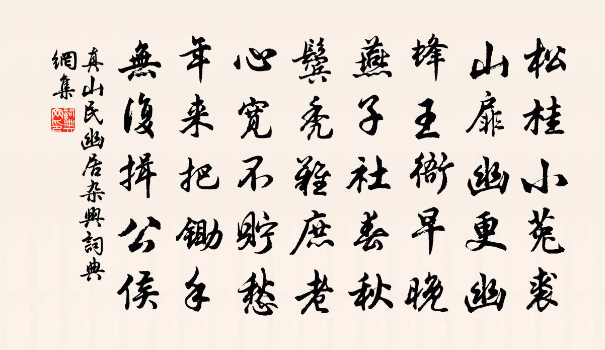 詩詞名句歷史字典書法欣賞書法字典國語詞典說文解字康熙字典古漢語字典標 題 作 者 詩 句 幽居雜興作者:真山民 朝代:宋代幽居雜興原文松桂小菟裘,山扉幽更幽。蜂王衙早晚,燕子社春秋。鬢禿難庶老,心寬不貯愁。年來把鋤手,無復揖公侯。詩詞問答問:幽居雜興的作者是誰?答:真山民問:幽居雜興寫於哪個朝代?答:宋代真山民幽居雜興書法欣賞幽居雜興書法作品詩詞推薦別圓澄禪師陳師道〔宋代〕法施老人臥不出,呼我取別行問疾。摩盤拭箸勸一飽,少待須臾莫蒼猝。早年著眼覷文字,萬卷初無一言契。多生天申萬壽宮岳珂〔宋代〕湖{左氵右父}溪邊春草青,張公洞下泉泠泠。兩行松檜列旌纛,中有金堂開福庭。壯哉神力出杳冥,樓觀矗立排頌證道歌證道歌釋印肅〔宋代〕頓入無生知見力,不問晴乾並雨濕。逢場作戲弄心花,彼自紛紛非我急。太常引 鳴鶴餘音卷之四譚處端〔元代〕非僧非俗亦非仙。茅屋兩三椽。白石與清泉。更誰問、桃源洞天。一爐寶篆,一甌春雪,澆灌淨三田。閒想穀神篇再游蔣山李流謙〔宋代〕寒山寺里立斜暉,只有垂楊自在垂。不待新亭成灑涕,向來已識寧馨兒。送臧奎之寧州謁韓使官魏野〔宋代〕路遠邠郊外,嚴冬去若何。時平防賊少,山險下驢多。塞色晴猶慘,蕃音譯尚訛。賢侯雖禮待,陟屺願頻歌。江上孔武仲〔宋代〕萬里長江一葉舟,客心蕭索已驚秋。亂霞影照山根寺,落日光翻水面樓。淺浦耀金知躍鯉,前灘點雪兒棲鷗。少年舟中見獵犬有感宋琬〔清代〕秋水蘆花一片明,難同鷹隼共功名。檣邊飯飽垂頭睡,也似英雄髀肉生。思歸八絕胡寅〔宋代〕夜夢俞音出帝闈,朝來江雨已生肥。扁舟載酒吹長笛,未減遼東獨鶴歸。李仁甫侍講閣學輓詩二首楊萬里〔宋代〕高議春江壯,長身野鶴孤。生涯一杯酒,行李五車書。凡例今迂叟,聲名後老蘇。岷峨氣悽愴,不為玉將珠。思耕亭高斯得〔宋代〕莘郊投耒興,六百奠殷祀。南陽轟耰出,漢業僨還起。聖賢憂世心,秋月照寒水。彼哉植杖徒,長在見何庳。我讀點絳唇丘崈〔宋代〕嘆之,作此,乃三月九日也。是日,楊花甚盛,蓋風雲花落花開,等閒不管流年度。舊遊何處。淺立空凝佇。驚拍偶至東堂范成大〔宋代〕岸幘蕭騷雪滿簪,一閒真是直千金。歸來栗里多情話,病後香山少醉吟。久坐 * 焦葉放,閒拖藜杖蘚花深。飢時泛舟回邑次韻史堯弼〔宋代〕人言佳句有風流,不羨騷人賦遠遊。坐遣目前無限意,筆端風起白苹洲。席上有舉東坡集歸去來字詩十首醉中戲續一首宋伯仁〔宋代〕傲世欲何求,歸來已倦遊。琴詩聊自嘯,丘壑復相留。問菊時攜酒,乘風或棹舟。樂天良有以,心事老田疇。初歸雜詠陸游〔宋代〕齒豁頭童盡耐嘲,即今爛飯用匙抄。朱門漫設千杯酒,青壁寧無一把茅?偶爾作官羞問馬,頹然對客但稱貓。此身詠漢高祖於季子〔唐代〕百戰方夷項,三章且代秦。功歸蕭相國,氣盡戚夫人。春日田園雜興李萼〔宋代〕村居只是舊衣冠,北墅南園熟往還。雨外泥深牛過觫,花邊風暖鳥開半。躬耕自得莘郊樂,日涉誰知陶逕閒。只說折丹桂 贈丹陽王哲〔元代〕氣財酒色相調引。迷惑人爭忍。因斯染患請郎中,思使言,你且盡。不須把脈休頻診。死病今番準。這回須去不推自述王珪〔唐代〕少從客路千波轉,老入流年萬事疏。野鶴定知乘寵誤,春冰多愧踐名虛。幾思漢殿金盤露,恣閱蓬山綠字書。未報名句推薦彩舟載得離愁動。無端更借樵風送。賀鑄《菩薩蠻·彩舟載得離愁動》 重鑄鋤犁作斤,姑舂婦擔去輪官,輸官不足歸賣屋。元稹《田家詞 / 田家行》 人生如寄,何事辛苦怨斜暉。朱熹《水調歌頭·隱括杜牧之齊山詩》 搖落深知宋玉悲,風流儒雅亦吾師。杜甫《詠懷古蹟五首·其二》 白髮悲明鏡,青春換敝裘。岑參《武威春暮聞宇文判官西使還已到晉昌》 新葉初冉冉,初蕊新霏霏。謝朓《詠落梅》 東園載酒西園醉,摘盡枇杷一樹金。戴復古《初夏遊張園》 人心險于山川,難於知天。莊子《莊子·雜篇·列禦寇》 不種閒花,池亭畔、幾竿修竹。陸容《滿江紅·詠竹》 善惡同,則功臣倦。黃石公《三略·上略》