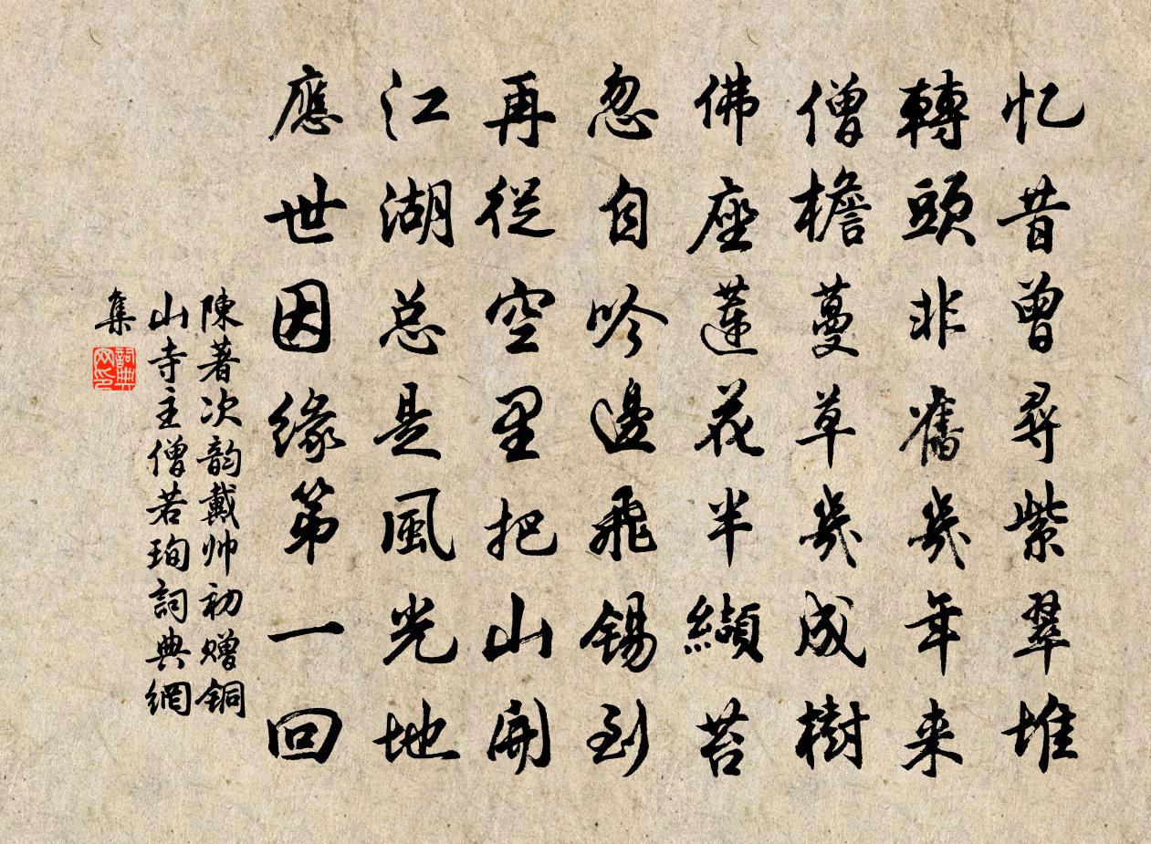 詩詞名句歷史字典書法欣賞書法字典國語詞典說文解字康熙字典古漢語字典標 題 作 者 詩 句 次韻戴帥初贈銅山寺主僧若珣作者:陳著 朝代:宋代原文憶昔曾尋紫翠堆,轉頭非舊幾年來。僧檐蔓草幾成樹,佛座蓮花半纈苔。忽自吟邊飛錫到,再從空里把山開。江湖總是風光地,應世因緣第一回。詩詞問答問:《次韻戴帥初贈銅山寺主僧若珣》的作者是誰?答:陳著問:該詩寫於哪個朝代?答:宋代書法欣賞次韻戴帥初贈銅山寺主僧若珣書法作品詩詞推薦送三藏歸西天國李洞〔唐代〕十萬里程多少磧,沙中彈舌授降龍。五天到日應頭白,月落長安半夜鍾。雞司晨者而此邦夜鳴為常不寐聞知作絕句趙蕃〔宋代〕雞鳴非時乃禍口,那無荒更同疾徐。信知南來事總異,不但斯人難並居。處守謝景思寄勸農詩次其韻曾幾〔宋代〕使君小隊出田間,卻擁旌旗鼓吹還。走送勞農詩俊逸,懸知領客事清閒。坐曹已白兒時鬢,置酒聊朱病後顏。無路念奴嬌(月)黃公紹〔宋代〕山圍寬碧,月十分圓滿,十分春暮。匹似涌金門外看,添得綠陰佳樹。野闊星垂,天高雲斂,不受紅塵污。徘徊水南陽閘下王冕〔元代〕十月黃河道,舟行濁水泥。今晨見清淺,不覺散淒迷。雲轉山腰斷,天連野色低。可知茅屋近,忽聽一聲雞。贈郭澹溪方回〔宋代〕赫日燒空暍欲死,詩來如向雪中看。古罍出土銅聲盡,明月浮空貝影寒。江海豈無鷗作社,頭顱安得鶡為冠。會須秋山圖王冕〔元代〕前年放船九江口,秋風獵獵吹蒲柳。買魚沽酒待月明,不知江上青山走。三更吹笛欲喚人,□□白露依衣巾。故鄉霜後紀園中草木十二絕范成大〔宋代〕風倒酴醾架,長條頭搶地。趁渠未萌芽,政可相料理。悲歌五顧況〔唐代〕臨春風,聽春鳥;別時多,見時少。愁人夜永不得眠,瑤井玉繩相對曉。留別陳藏一釋行海〔宋代〕君住江西我浙東,偶然相識在吳中。知名彼此非今日,愛客情懷有古風。歷數山川游已遍,苦吟風月趣還同。不須水調歌頭(次盧漕韻呈茶漕二使)京鏜〔宋代〕楊盧萬人傑,見我眼俱青。錦官城裡勝概,在在款經行。筆底煙雲飛走,胸次乾坤吐納,議論總縱橫。覺我形穢處白龍洞韓淲〔宋代〕西湖浪宕我能知,卻賦龍巖老古錐。便做詩家元不惡,華亭舉棹是因誰。金璫玉珮歌顧況〔唐代〕贈君金璫太霄之玉珮,金鎖禹步之流珠,五嶽真君之秘籙,九天丈人之寶書。東井沐浴辰巳畢,先進洞房上奔日。臨秋三首宋庠〔宋代〕兀坐臨秋水,悠然到夕霏。蓮叢經雨折,菰米待霜肥。有餌潛鱗出,無軒野鶴飛。騶呼且勿遽,更待月華歸。題西岩鄭剛中〔宋代〕終日徘徊得好涼,一懷炎暑變冰霜。會須月上出山去,更看芰荷生夜香。披襟台金君卿〔宋代〕紫微行樂不到處,絕勝何人共賞心。況是難逢開口笑,強須攜手一披襟。張公子行(一作古意)常建〔唐代〕日出乘釣舟,裊裊持釣竿。涉淇傍荷花,驄馬閒金鞍。俠客白雲中,腰間懸轆轤。出門事嫖姚,為君西擊胡。胡兵和陶勸農韻勉吾鄉之學者吳芾〔宋代〕吾鄉人物,散處川陸。豈無艇民,生而清穆。亦既從師,步趨隨逐。亦既窮經,訪尋歸宿。上天竺孫雄飛〔宋代〕行窮湖上徑,迤邐到林巒。地瘦馬蹄澀,水清山骨寒。樓台棲樹沙,鐘磬鬧雲端。自笑利名役,未能來掛冠。和孫端叟寺丞農具十五首其七耰鋤梅堯臣〔宋代〕蕪穢或不治,良苗安得長。薅來露未曦,荷去月初上。侵煙濕鵝頸,近茇翻蟻壤。生具自有餘,何辭汗沾顙。名句推薦已覺逝川傷別念,復看津樹隱離舟。王勃《秋江送別二首》 百囀千聲隨意移,山花紅紫樹高低。歐陽修《畫眉鳥》 無端聽畫角,枕畔紅冰薄。納蘭性德《菩薩蠻·朔風吹散三更雪》 人善被人欺,馬善被人騎。佚名《增廣賢文·上集》 紫燕一雙嬌語碎,翠屏十二晚峰齊,夢魂消散醉空閨。毛熙震《浣溪沙·花榭香紅煙景迷》 妾本秦羅敷,玉顏艷名都。李白《陌上桑》 今逢四海為家日,故壘蕭蕭蘆荻秋。劉禹錫《西塞山懷古》 張翰江東去,正值秋風時。李白《送張舍人之江東》 知君用心如日月,事夫誓擬同生死。張籍《節婦吟·寄東平李司空師道》 顧此耿耿存,仰視浮雲白。文天祥《正氣歌》