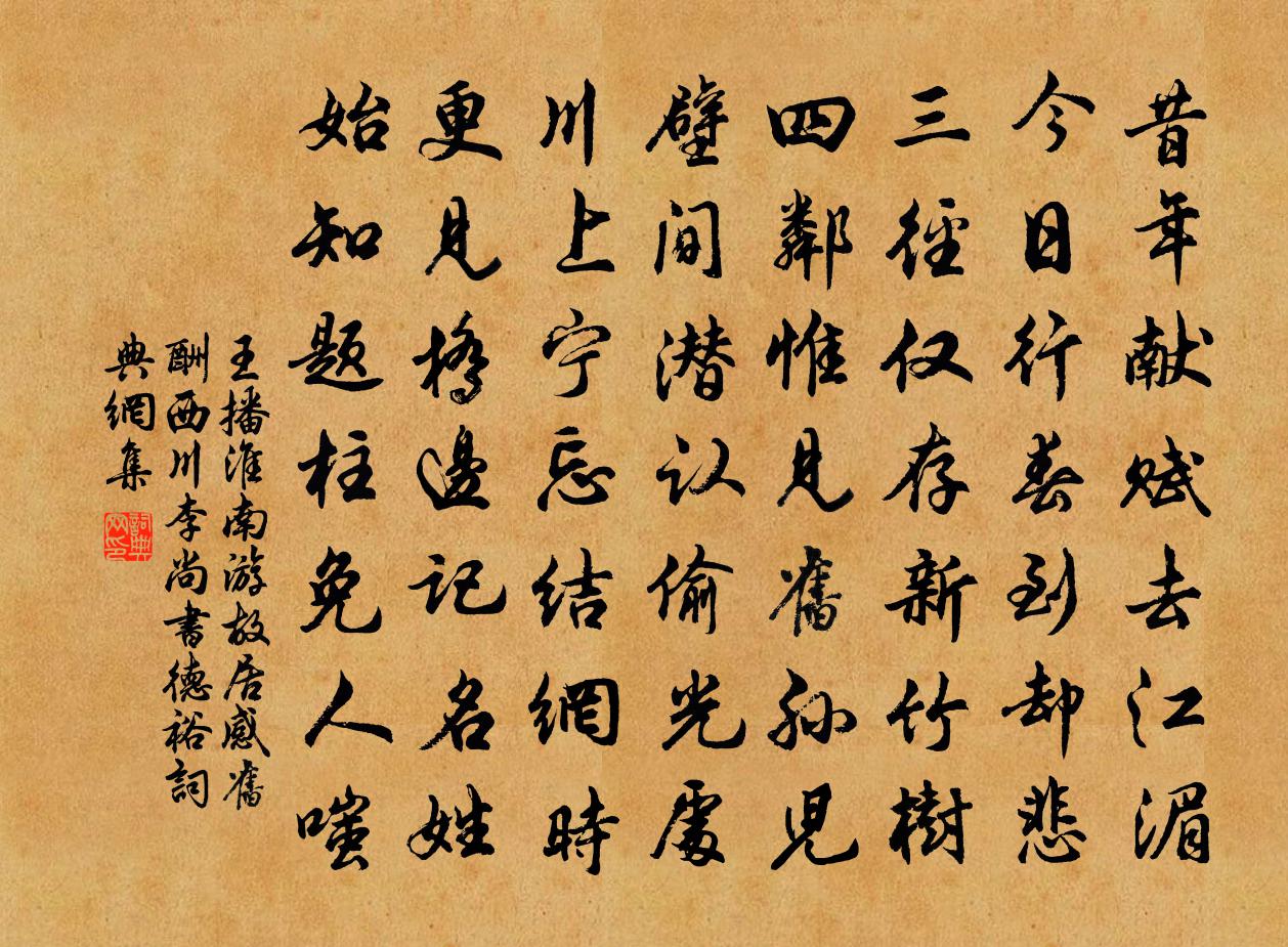 詩詞名句歷史字典書法欣賞書法字典國語詞典說文解字康熙字典古漢語字典標 題 作 者 詩 句 淮南遊故居感舊,酬西川李尚書德裕作者:王播 朝代:唐代原文昔年獻賦去江湄,今日行春到卻悲。三徑僅存新竹樹,四鄰惟見舊孫兒。壁間潛認偷光處,川上寧忘結網時。更見橋邊記名姓,始知題柱免人嗤。詩詞問答問:《淮南遊故居感舊,酬西川李尚書德裕》的作者是誰?答:王播問:該詩寫於哪個朝代?答:唐代書法欣賞淮南遊故居感舊,酬西川李尚書德裕書法作品注釋全唐詩:卷466-43詩詞推薦淮西席上醉歌盧群〔唐代〕祥瑞不在鳳凰麒麟,太平須得邊將忠臣。衛霍真誠奉主,貔虎十萬一身。江河潛注息浪,蠻貊款塞無塵。但得百寮題嚴子陵釣台章才邵〔宋代〕短櫂夷猶七里灘,人亡依舊水光寒。漢家名節君知否,盡在君家一釣竿。水龍吟(水仙花)趙聞禮〔宋代〕幾年埋玉藍田,綠雲翠水烘春暖。衣薰麝馥,襪羅塵沁,凌波步淺。鈿碧搔頭,膩 * 腦,參差難翦。乍聲沉素瑟京東雜感洪昇〔清代〕勝國巡遊地,孤城有廢宮。周垣春草外,園殿夕陽下。狐搰沙翻雪,鴟蹲樹嘯風。唯餘舊村落,雞犬似新豐。諸人頗有和余百梅詩者各賦一首劉克莊〔宋代〕出香影外別商量,盡擷菁英發秘藏。難把微酸諧眾口,只消一白賽宮妝。卻疑彼相調金鼎,未召斯人試玉堂。便好次仲舅韻寄拙庵樓鑰〔宋代〕涵秋古澗落珠旒,幾欲相將作勝游。芒屩未穿心已懶,不如莫莫且休休。布貸回頭笑髑髏贊釋智遇〔宋代〕咄者髑髏,荒草堆頭。斂眉一笑,萬壑雲收。用香字遺李恭叔敖陶孫〔宋代〕我無令君三日香,瘦鶴為軀龜作腸。薄寒中人曳兩縰,獨吟猗那遺我將。意從兩腳萬里回,政坐群兒相謗傷。朅來題時覺寺在在堂十二首舒坦〔宋代〕榛棘叢中舊草堂,千年誰復辯興亡。累累付與張儀印,珍重空中一炷香。漁家傲歐陽玄〔元代〕五月都城猶衣夾。端陽蒲酒新開臘。月傍西山青一掐。荷花夾。西湖近歲過苕*。血色金羅輕汗浹。宮中畫扇傳油聞蟋蟀有感蒲壽宬〔宋代〕煎煎促誰織,機杼咽空林。何處露藂下,入人秋思深。清燈一線淚,孤枕百年心。此意知誰會,悠然太古音。到妙寂寺陳宓〔宋代〕朝辭城市哄,近寺向昏黃。步步貪山色,依依顧水光。群魚猶出戲,歸路倦高翔。正喜無人見,迎僧欲下堂。送同年楊元直持憲節湖南二首馮時行〔宋代〕天闊風高旆纛輕,江清沙白映揚舲。西岷峻極開文紀,南斗昭垂並使星。已見帆頭湖水白,猶看柂尾蜀山青。祗應魯連子引諺佚名〔先秦〕百足之蟲。三斷不蹶。心誠憐。白髮玄。情不怡。艷色媸。密室憊坐范成大〔宋代〕如許頭顱莫振矜,但尋曲幾與枯藤。餘生不直一彈指,此病寧論三折肱。何處丹房痴候火,誰家籌室強傳燈?本來晚坐觀風亭三首宋庠〔宋代〕我來秋 * 霞曛,更作憑蘭遠望人。山口遠銜遙白渡,水頭斜略小平津。年華有恨驚心去,世事無端刺眼新。深愧詠燕釋智圓〔宋代〕來去知時候,堪憐異眾禽。變飛春雨細,對語畫堂深。寄宿雕梁穩,銜泥柳岸陰。棲身自有處,鷹隼莫相侵。和青州教授頓起九日見寄蘇轍〔宋代〕歲月飄然風際煙,紫萸 * 又霜天。莫思太室杉松外,且醉青州歌舞前。〈昔年與頓君同登嵩頂,時正重九。杯酒臨江仙山主〔元代〕始向初更才未睡,金天節屈清涼。星明霄漢乍分光。清風連夜,陣陣透幽窗。月下焚香頻啟告,爐煙直到穹蒼。十次韻單君范行李中諸詩前數章自道後二章為單陳著〔宋代〕浮世憧憧為底忙,百年光景等風狂。乾坤自隘胸襟豁,言語無多意思長。但覺高歌同夜酌,未應別賦寫春傷。吾儕名句推薦行人與我玩幽境,北風切切吹衣冷。李頎《少室雪晴送王寧》 過份求福,適以速禍;安分遠禍,將自得福。陳繼儒《小窗幽記·集靈篇》 花不語,水空流。年年拚得為花愁。晏幾道《鷓鴣天·守得蓮開結伴遊》 疑行無名,疑事無功。司馬遷《史記·七十列傳·商君列傳》 美女渭橋東,春還事蠶作。李白《陌上桑》 苟利國家生死以,豈因禍福避趨之。林則徐《赴戍登程口占示家人·其二》 蚊蟲遭扇打,只因嘴傷人!佚名《增廣賢文·下集》 大凡物不得其平則鳴韓愈《送孟東野序》 秋已盡,日猶長,仲宣懷遠更淒涼。李清照《鷓鴣天·寒日蕭蕭上瑣窗》 書卷多情似故人,晨昏憂樂每相親。于謙《觀書》