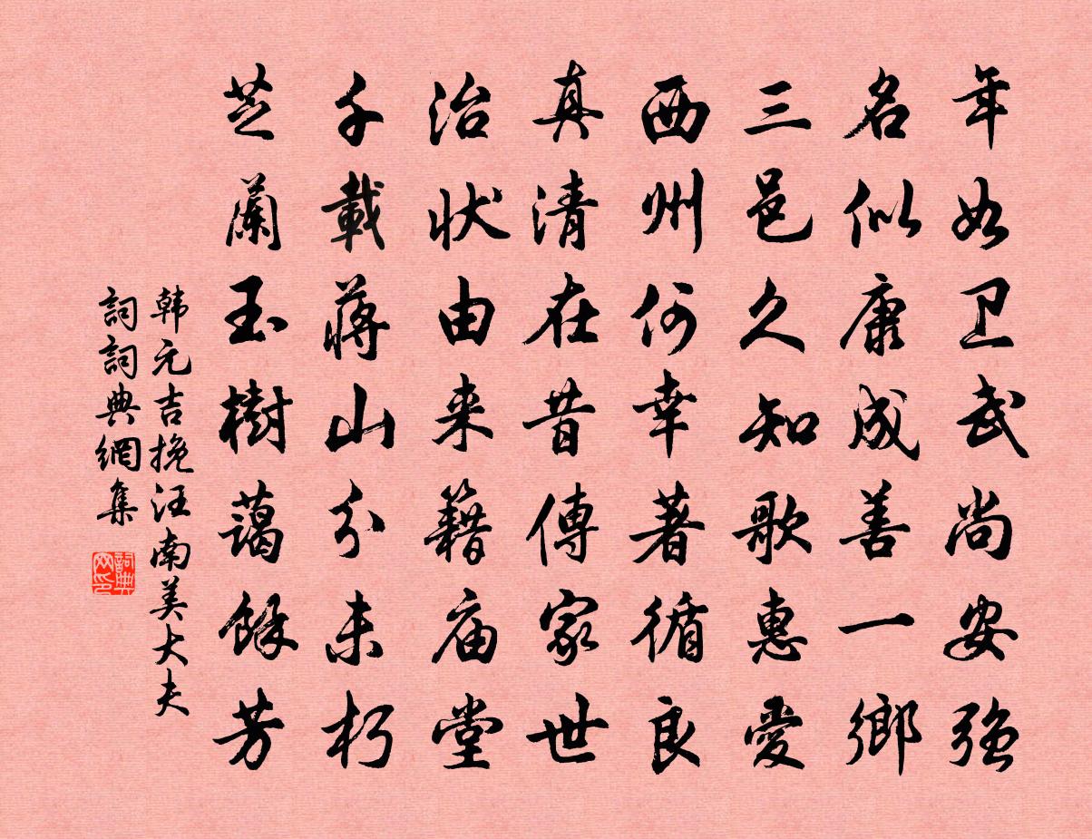 詩詞名句歷史字典書法欣賞書法字典國語詞典說文解字康熙字典古漢語字典標 題 作 者 詩 句 挽汪南美大夫詞作者:韓元吉 朝代:宋代挽汪南美大夫詞原文年如衛武尚安強,名似康成善一鄉。三邑久知歌惠愛,西州何幸著循良。真清在昔傳家世,治狀由來籍廟堂。千載蔣山分未朽,芝蘭玉樹藹余芳。詩詞問答問:挽汪南美大夫詞的作者是誰?答:韓元吉問:挽汪南美大夫詞寫於哪個朝代?答:宋代問:韓元吉的名句有哪些?答:韓元吉名句大全韓元吉挽汪南美大夫詞書法欣賞挽汪南美大夫詞書法作品詩詞推薦壽吳宰李商叟〔宋代〕向曉親闈共舉觴,老人星出翠岩傍。狻猊奩暖沉香裊,孔雀屏開紗蠟光。霜月正當圓此夕,江梅先已發奇祥。定知次韻梅花絕句喻良能〔宋代〕玉裙練帨清無塵,一笑喚回幽谷春。天寒日暮故相惱,不怕近前丞相嗔。趙飛燕姊妹趙崇嶓〔宋代〕甲帳初停燕子飛,小雛相趁共差池。春風吹水粼粼長,又有披香博士知。邕州陶弼〔宋代〕絕塞多秋色,孤城易夕陽。此間饒寵辱,還我水雲鄉。過華清宮絕句三首杜牧〔唐代〕長安回望繡成堆,山頂千門次第開。一騎紅塵妃子笑,無人知是荔枝來。新豐綠樹起黃埃, 數騎漁陽探使回。霓採蓮(搖捱遍)史浩〔宋代〕南鄰幄丹宮,赤伏顯符記。朱陵曜綺繡,箕翼炯、瑞光騰起。每歲秋分老人見,表皇家、襲慶迎祺。天子當膺,無惜別王鎡〔宋代〕袂分鴛錦夢雙殘,一線啼痕枕未乾。門掩青燈人自去,杏花風起落花看。偈頌三十六首釋如珙〔宋代〕群陰欲去未去之際,一陽欲來未來之時。樓上鐘鳴,堂前鼓響,凡聖交參,一期事畢。秋末江行貫休〔唐代〕四顧木落盡,扁舟增所思。雲沖遠燒出,帆轉大荒遲。天際霜雪作,水邊蒿艾衰。斷猿不堪聽,一聽亦同悲。蕪湖晚步李流謙〔宋代〕迥陂積水長蒲蔣,散步郊原借夕涼。塵袖風巾嗟久旅,稻畦柘逕似吾鄉。蛙聲月色當空曠,爨火人家在莽蒼。望合送鄧器先赴羅田尉五首曾協〔宋代〕我始來相居,談公口瀾翻。平生驚人句,筆力正始間。古人不可作,因君見班班。矍然起懦庸,褰裳撼詩關。菩薩蠻(春歸)韓元吉〔宋代〕牆根新筍看成竹。青梅老盡櫻桃熟。幽牆幾多花。落紅成暮霞。閉門風又雨。只道春歸去。媚臉笑持杯。卻驚春思北園雜詠陸游〔宋代〕短筇行樂出柴荊,雪意闌珊卻變晴。林際已看春雉起,屋頭還聽歲豬鳴。暮春雜興葛起耕〔宋代〕紫椹累累綴碧桑,林塘雨過綠生香。荊扉晝掩蒼苔寂,留得芸簽伴日長。寄提刑李學士陳師道〔宋代〕石渠金馬青雲上,東里西門濟水邊。上冢過家真樂事,平時持節貴當年。成家舊學諸儒問,脫手新詩眾口傳。范叔贈武處士韋莊〔唐代〕一身唯一室,高靜若僧家。掃地留疏影,穿池浸落霞。綠蘿臨水合,白道向村斜。賣藥歸來醉,吟詩倚釣查。夜香陸游〔宋代〕投老誤乘傳,竊食慚無功。清夜一炷香,實與天心通。忤物雖至愚,許國猶孤忠。一念倘自欺,百年寧有終。上帝涉世許月卿〔宋代〕涉世如溪谷,只宜在淺處。一生如一日,未暮早歸去。君不見偉哉男子韓淮陰,往往正坐涉世深。功成身退豈不好無寐方岳〔宋代〕雨寒不寒苔蘚紫,霜落未落楊柳黃。野鷹飢嘯獸擇肉,邊馬戰摧烏啄瘡。兵氛甚惡寸心折,劍無恙,雙毛蒼。極知【南呂】一枝花 送人入道李致遠〔元代〕白雲留故山,曉月流清澗。西風吹渭水,落葉滿長安。龍虎痴頑,正要別真贗,都來方寸間。內丹成未飲刀圭,宦名句推薦曲屏先暖鴛衾慣,夜寒深、都是思量。吳文英《風入松·為友人放琴客賦》 一道殘陽鋪水中,半江瑟瑟半江紅。白居易《暮江吟》 蓬鬢哀吟長城下,不堪秋氣入金瘡。盧綸《逢病軍人》 死別已吞聲,生別常惻惻。杜甫《夢李白二首·其一》 報答春光知有處,應須美酒送生涯。杜甫《江畔獨步尋花七絕句》 天清一雁遠,海闊孤帆遲。李白《送張舍人之江東》 會天大雨,道不通,度已失期司馬遷《陳涉世家》 童子柳陰眠正著,一牛吃過柳陰西。楊萬里《桑茶坑道中》 羈心積秋晨,晨積展游眺。謝靈運《七里瀨》 古人學問無遺力,少壯工夫老始成。陸游《冬夜讀書示子聿》
