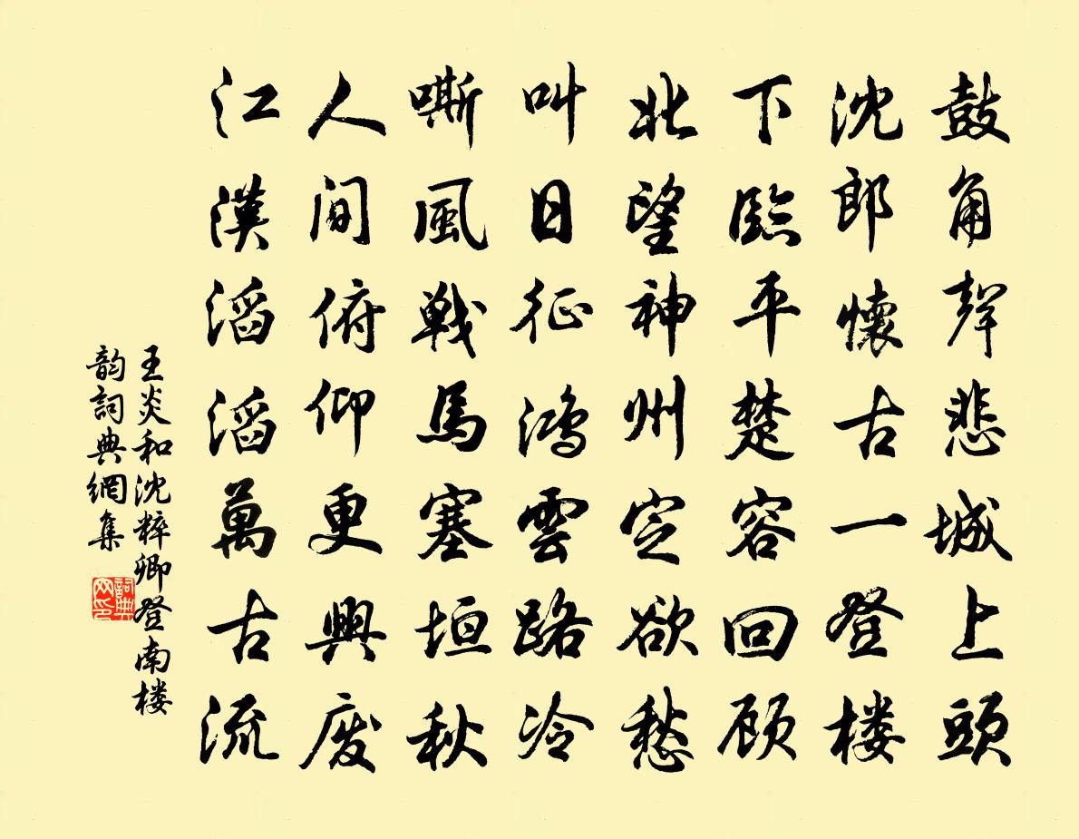詩詞名句歷史字典書法欣賞書法字典國語詞典說文解字康熙字典古漢語字典標 題 作 者 詩 句 和沈粹卿登南樓韻作者:王炎 朝代:宋代和沈粹卿登南樓韻原文鼓角聲悲城上頭,沈郎懷古一登樓。下臨平楚容回顧,北望神州定欲愁。叫日征鴻雲路冷,嘶風戰馬塞垣秋。人間俯仰更興廢,江漢滔滔萬古流。詩詞問答問:和沈粹卿登南樓韻的作者是誰?答:王炎問:和沈粹卿登南樓韻寫於哪個朝代?答:宋代王炎和沈粹卿登南樓韻書法欣賞和沈粹卿登南樓韻書法作品詩詞推薦觀窗前月過有感舒岳祥〔宋代〕檐影倒垂地,月高窗更陰。殘蛩沉積葉,悲鳥發遙岑。易下傷時淚,難平讀史心。胸中猶若此,酒盞可辭深。已亥雜詩 66龔自珍〔清代〕西京別火位非高,薄有遺聞瑣且勞。只算初識鏡背字,敢陳法物詁球刀。詩品二十四則。流動司空圖〔唐代〕若納水輨,如轉丸珠。夫豈可道,假體遺愚。荒荒坤軸,悠悠天樞。載要其端,載同其符。超超神明,返返冥無。似永固主僧惠福陳著〔宋代〕偶來乘暇隙,又過古禪林。白日鍾魚外,清風竹樹陰。無言自有趣,得句亦何心。相見不相問,老僧知我深。歸朝歡蘇軾〔宋代〕“我夢扁舟浮震澤。雪浪橫江千頃白。覺來滿眼是廬山,倚天無數開青壁。”蓋實夢也。然公詩復云:“扁舟震澤鷓鴣天·化度寺作吳文英〔宋代〕池上紅衣伴倚闌,棲鴉常帶夕陽還。殷雲度雨疏桐落,明月生涼寶扇閒。鄉夢窄,水天寬。小窗愁黛淡秋山。吳鴻望海潮劉一止〔宋代〕東郊人報,春風訊息,先歸御柳宮梅。殘雪戀枝,輕陰閣雨,郁蔥瑞氣佳哉。清曉九門開。聽舜韶聲舉,迤邐天街六月十四日宿東林寺陸游〔宋代〕看盡江湖千萬峰,不嫌雲夢芥吾胸。戲招西塞山前月,來聽東林寺里鍾。遠客豈知今再到,老僧能記昔相逢。虛窗詩(金陵黃進士夢遇台城故妓,自雲今為吳神樂部)故台城妓〔唐代〕歌罷玉樓月,舞殘金縷衣。勻鈿收迸節,斂黛別重闈。網斷蛛猶織,梁春燕不歸。那堪回首處,江步野棠飛。移居李洪〔宋代〕僦屋東甌城,爽氣挹西山。颶風忽作惡,柴荊不容關。再徙得陋巷,藩拔井亦眢。稍畢塗塈功,已覺容膝安。庭前宮詞楊皇后〔宋代〕薰風宮殿日長時,靜運天機一局棋。國手人人饒處看,須知聖算出新奇。到三聖廟坐池亭久之記經四十字陳鑒之〔宋代〕倦踏軟塵陌,琳宮取次行。紅桃窺瀲灩,翠柳立虛明。眼底得詩料,耳根猶市聲。黃冠啜茗茶,猶有舊交情。和柳子玉官舍十首之思山齋黃庭堅〔宋代〕吳兒心著吳山深,滿目終南不開慰。有時蟬蛻書幾邊,夢到五湖千里外。瑞鷓鴣方岳〔宋代〕中元過後恰三朝。因甚庭闈喜氣飄。李謫若非當此夕,甲生應是在今宵。滿斟綠醑歌檀口,慢拍紅牙舞柳腰。富貴和李舍人使君紓題雲明府道室皎然〔唐代〕許令如今道姓雲,曾經西嶽事桐君。流霞手把應憐壽,黃鶴心期擬作群。金籙時教弟子檢,砂床不遣世人聞。桂陽追和東坡先生親筆陳季常見過三首方回〔宋代〕前後赤壁賦,悲歌慘江風。江山元不改,在公神遊中。三經及字說,胎禍垂無窮。想如季常輩,對寤三嘆同。偈傾一百六十九首釋智朋〔宋代〕不知月之大小,不管歲之餘閏。黑牛臥死水,癩馬系枯椿。三年一閏,五年載閏。衲僧須經得與么時節過,方可成偈頌二百零五首釋正覺〔宋代〕人平不語,水平不流。嘉州大象,陝府鐵牛。莫怪扶桑最先照,大都家住海門洲。驟雨胡仲弓〔宋代〕神龍奮頭角,頃刻致風雷。雲逐溪南去,雨從山北來。炎涼分枕簟,灑落滿樓台。物物紼沾足,餘膏及草萊。過白沙竹枝歌六首楊萬里〔宋代〕穹崖絕嶂入雲天,烏鵲才飛半壁間。遠渚長汀草如積,牛羊須上最高山。名句推薦相知無遠近,萬里尚為鄰。張九齡《送韋城李少府》 飾美於外者,必其中無所有。王永彬《圍爐夜話·第一八八則》 一鼓作氣,再而衰,三而竭。左丘明《左傳·莊公·莊公十年》 萬里人南去,三春雁北飛。韋承慶《南中詠雁詩》 懷春情不斷,猶帶相思舊子。吳文英《丁香結·夷則商秋日海棠》 惜分長怕君先去,直待醉時休。賀鑄《眼兒媚·蕭蕭江上荻花秋》 千里黃雲白日曛,北風吹雁雪紛紛。高適《別董大二首》 凡事謹守規模,必不大錯;一生但足衣食,便稱小康。王永彬《圍爐夜話·第五三則》 落葉滿空山,何處尋行跡。韋應物《寄全椒山中道士》 今為羌笛出塞聲,使我三軍淚如雨。李頎《古意》
