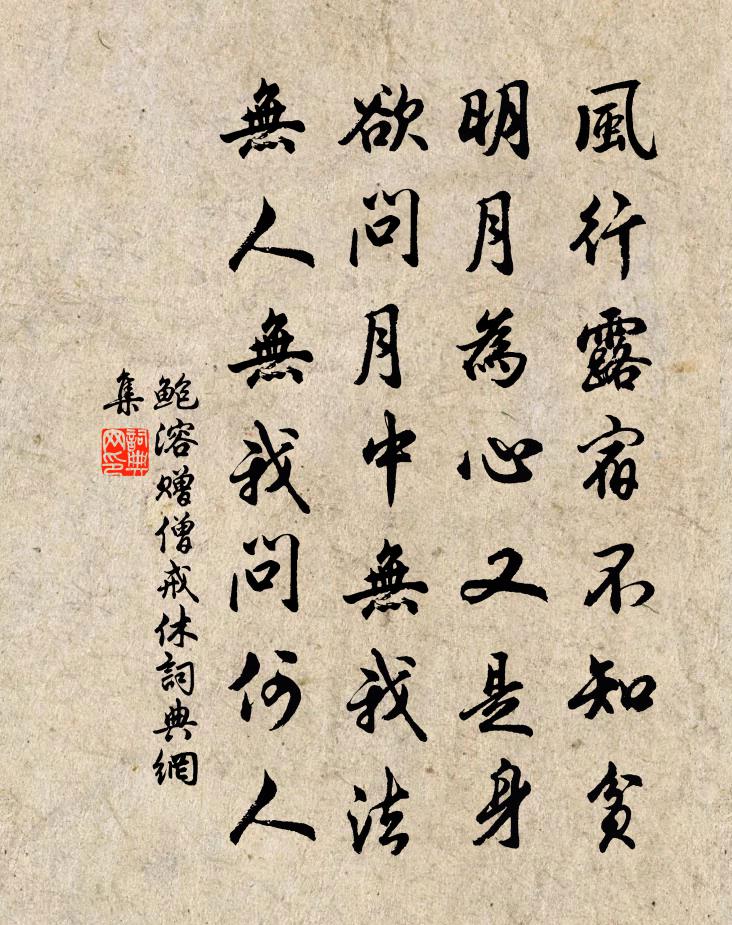 詩詞名句歷史字典書法欣賞書法字典國語詞典說文解字康熙字典古漢語字典標 題 作 者 詩 句 贈僧戒休作者:鮑溶 朝代:唐代贈僧戒休原文風行露宿不知貧,明月為心又是身。欲問月中無我法,無人無我問何人。詩詞問答問:贈僧戒休的作者是誰?答:鮑溶問:贈僧戒休寫於哪個朝代?答:唐代鮑溶贈僧戒休書法欣賞贈僧戒休書法作品詩詞推薦偈頌五首釋了悟〔宋代〕一即三,三即一,碧眼胡僧數不出。少林面壁九年,大似抱贓叫屈。屈屈,黃檗樹頭,討甚木蜜。入京第一程胡仲參〔宋代〕六載館杭州,重來訪舊遊。山中才過雨,客里又驚秋。嵐氣蒸衣濕,泉聲激石流。功名苦行役,差見渡頭鷗。擢第南歸道中早發宋庠〔宋代〕紫漢回天斗柄橫,蕭蕭羸馬困遄征。南歸晝繡恩偏厚,應有鄉人笑夜行。送徐棲霞周真一〔宋代〕顧我慚稱十高士,與君同是兩閒人。君今獨向名山去,說與歸雲我問津。辰十月八日同希周掃松靈石晚步松下愴然有懷謝直〔宋代〕長懷邴曼容,遠慕蘧伯玉。養志則安能,寡地變所欲。邈哉誤儒冠,坐使衣食促。籯書不論金,終身未易讀。灑掃春夕偶作李中〔唐代〕早是春愁觸目生,那堪春夕酒初醒。貫珠聲罷人歸去,半落桃花月在庭。送宣昭子游淮潘璵〔宋代〕幾年攜劍過邊城,非但譚兵善用兵。果是胸中抱材氣,肯於紙上立功名。事當著力機須敏,人匪知心語莫輕。況有夜宿龍井廣福寺分韻得來字張鎡〔宋代〕陽烏翅焦雲崔嵬,避熱馬轉南山隈。邊湖興熟厭頻往,幽討林落穿莓苔。澗聲引步陟層嶺,亭矗路側雙扉開。泓泉十四夜元衡見過趙蕃〔宋代〕餘酲索寞政須驅,多謝君能佩酒壺。回首林園重搖落,岸巾風月且須臾。不須相對哀囚楚,何日扁舟俱下吳。雅意詠史上漢高帝八首陳普〔宋代〕一帶陰山浪引弓,運移婚媾一朝通。英雄白首消磨盡,甘與梟雛作婦翁。閏月之臘詔賜銀合臘藥三首岳珂〔宋代〕驛使錦連乾,傳宣下九天。緘題瞻賜璽,走送跌鳴鞭。意溢兼金外,恩從玉陛前。更憐戍邊客,一騎入秦川。七夕溫庭筠〔唐代〕鳴機札札停金梭,芙蓉澹蕩生池波。神軒紅粉陳香羅,鳳低蟬薄愁雙蛾。微光奕奕凌天河,鸞咽鶴唳飄颻歌。彎橋頌古三十八首釋從瑾〔宋代〕棒頭有眼,眼裡無筋。多逢濁富,罕遇清貧。自入洞門煙銷斷,不知世上幾經春。孤石戴叔倫〔唐代〕迥若千仞峰,孤危不盈尺。早晚他山來,猶帶煙雨跡。貞堅自有分,不亂和氏璧。妻滿月日相唁元稹〔唐代〕十月辛勤一月悲,今朝相見淚淋漓。狂風落盡莫惆悵,猶勝因花壓折枝。春晚村居雜賦絕句陸游〔宋代〕作堤蜿蜿六百尺,西崦東村成一家。春雨乍晴桑吐葉,秋風初冷稻吹花。送澶州錄曹宋參軍陳師道〔宋代〕宦遊男子事,訪別故人情。能吏於今少,春風及此行。英雄余戰伐,犴獄寄廉平。未肯輕衰疾,人來闕寄聲。聞鄰寺粥陳起〔宋代〕寒釭旋擿動冥搜,泓玉摩研萬象愁。鐵版響廊催早粥,銅壺添水易新籌。一聲雞唱驚殘夢,再聽鴉群過小樓。可惜小樓晚眺雲日楊萬里〔宋代〕小樓掛上綠窗欞,落日孤雲萬態生。碧玉峰巒白銀綠,峰巒暗處綠偏明。題武夷孫士廉〔宋代〕翠岩九曲老仙家,玉女峰頭煉紫霞。紀海無人來跨鶴,天河有路可乘槎。春雲細釀幔亭酒,夜雨初煎石鼎茶。久矣名句推薦雪似梅花,梅花似雪。呂本中《踏莎行·雪似梅花》 春朝秋夜思君甚,愁見繡屏孤枕。魏承班《滿宮花·雪霏霏》 葉落風不起,山空花自紅。陳師道《妾薄命·為曾南豐作》 江南憶,最憶是杭州。白居易《憶江南詞三首》 統豺虎,御邊幅,號令明,軍威肅。宋江《滿江紅·喜遇重陽》 人不閒,勿事攪。人不安,勿話擾。李毓秀《弟子規·泛愛眾》 算陰晴,渾似幾番,渭城故人離會。吳文英《永遇樂·乙巳中秋風雨》 凡大事皆起於小事,小事不論,大事又將不可救吳兢《貞觀政要·卷一·論政體》 桑野就耕父,荷鋤隨牧童。孟浩然《田家元日》 亂則國危,治則國安。荀子《荀子·王霸》