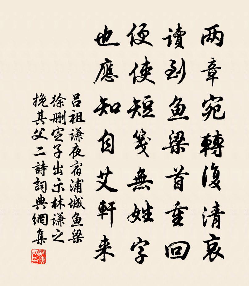 詩詞名句歷史字典書法欣賞書法字典國語詞典說文解字康熙字典古漢語字典標 題 作 者 詩 句 夜宿浦城魚梁徐刪定子出示林謙之挽其父二詩作者:呂祖謙 朝代:宋代原文兩章宛轉復清哀,讀到魚梁首重回。便使短箋無姓字,也應知自艾軒來。詩詞問答問:《夜宿浦城魚梁徐刪定子出示林謙之挽其父二詩》的作者是誰?答:呂祖謙問:該詩寫於哪個朝代?答:宋代書法欣賞夜宿浦城魚梁徐刪定子出示林謙之挽其父二詩書法作品詩文賞析【原題】:夜宿浦城魚梁徐刪定子出示林謙之挽其父二詩時謙之方按刑廣東有懷次韻詩詞推薦澹山岩遇雨二首項安世〔宋代〕水放沙痕出,雲將晚色昏。微茫上西渡,浩蕩出南門。欹側緣山罅,嵌空下石根。書崖無數墨,入寺兩山髠。贈徐希仁石硯別盧仝〔唐代〕靈山一片不靈石,手斫成器心所惜。鳳鳥不至池不成,蛟龍乾蟠水空滴。青松火煉翠煙凝,寒竹風搖遠天碧。今日戚郎中紅黃拒霜花金君卿〔宋代〕霜曉禁寒色不摧,若論花品是奇材。紅如錦帳香囊綻,黃似霓裳舞袖開。幸與畹蘭同素景,恥隨籬槿委輕埃。郡齋和孔周翰二絕 再觀邸園留題蘇軾〔宋代〕小園香霧曉蒙籠,醉手狂詞未必工。魯叟錄詩應有取,曲收彤管邶鄘風。跋江都王馬陳與義〔宋代〕天上房星空不動,人間畫馬亦難逢。當年筆下千金鹿,此日窗前八尺龍。挽刑邦用孫應時〔宋代〕區區倉掾救荒移,實惠洋洋攝令時。更有棠陰在空圄,廬山遺愛未應衰。與歐陽伯威同飲遇卿江樓趙蕃〔宋代〕不上江樓又兩春,人間到處略知津。勞君置酒仍呼客,快語端能洗劫塵。題小西湖姚勉〔宋代〕主人胸次一西湖,新展蘇堤小畫圖。待種梅花三百本,請君雪裡訪林逋。送友人東歸張喬〔唐代〕遠涉期秋卷,將行不廢吟。故鄉芳草路,來往別離心。掛席春風盡,開齋夏景深。子規誰共聽,江月上清岑。巫山一段雲(王氏樓)仇遠〔宋代〕酒力欺愁薄,輕紅暈臉微。雙鴛誰袖出青閨。剗襪步東西。倦蝶棲香懶,雛鶯調語低。釵盟惟有燭花知。半醉欲歸九日寄維揚劉明仲賀鑄〔宋代〕揚舲瓜步背瓜洲,底處孤亭是玉釣。蠟燭有心啼別夜,布帆無恙到南州。黃華嘉節與何事,白髮故人分取愁。賴有吳江三高祠陸龜蒙葉茵〔宋代〕江湖蕭散樂平生,夜課圖書日課耕。一段高風猶凜凜,逢人肯說鴨呼名。肉食陸游〔宋代〕平生愛枯淡,老病未免肉。殺戒苦難持,貪境則易熟。鄙夫五鼎少,達士一瓢足。紛紛刀機間,斷者豈復續。習聞折梅方蒙仲〔宋代〕看梅如看畫,由我不由他。千樹江頭少,一枝瓶里多。學弈孟子〔先秦〕弈秋,通國之善弈者也。使弈秋誨二人弈,其一人專心致志,惟弈秋之為聽;一人雖聽之,一心以為有鴻鵠將至,秋郊作韋應物〔唐代〕清露澄境遠,旭日照林初。一望秋山淨,蕭條形跡疏。登原忻時稼,採菊行故墟。方願沮溺耦,淡泊守田廬。奉寄韋太守陟王維〔唐代〕荒城自蕭索,萬里山河空。天高秋日迥,嘹唳聞歸鴻。寒塘映衰草,高館落疏桐。臨此歲方晏,顧景詠悲翁。故人宴周皓大夫光福宅(座上作)白居易〔唐代〕何處風光最可憐,妓堂階下砌台前。軒車擁路光照地,絲管入門聲沸天。綠蕙不香饒桂酒,紅櫻無色讓花鈿。野人世弼惠詩求舜泉輒欲以長安酥共泛一杯次韻戲黃庭堅〔宋代〕寒齏薄飯留佳客,蠹簡殘編作近鄰。避地梁鴻真好學,著書揚子未全貧。玉酥鏈得三危露,石火燒成一片春。沙鼎題盛令新亭方乾〔唐代〕舉目豈知新智慧,存思便是小天台。偶嘗嘉果求枝去,因問名花寄種來。春物誘才歸健筆,夜歌牽醉入叢杯。此中名句推薦從時者,猶救火、追亡人也,蹶而趨之,唯恐弗及。左丘明《國語·越語·越興師伐吳而弗與戰》 故園腸斷處,日夜柳條新。宋之問《途中寒食題黃梅臨江驛寄崔融》 罪人或免人罪,難為亦為也。來俊臣《羅織經·問罪卷第十》 見出以知入,觀往以知來列子及其弟子《列子·說符》 凝恨對殘暉,憶君君不知。韋莊《菩薩蠻》 江上旗亭,送君還是逢君處吳大有《點絳唇·送李琴泉》 記得綠羅裙,處處憐芳草。賀鑄《綠羅裙·東風柳陌長》 道吾好者是吾賊,道吾惡者是吾師。佚名《增廣賢文·上集》 何期今日酒,忽對故園花。文森《九日》 相思血,都沁綠筠枝。姜夔《小重山令·賦潭州紅梅》