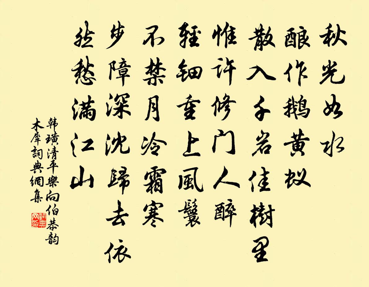 詩詞名句歷史字典書法欣賞書法字典國語詞典說文解字康熙字典古漢語字典標 題 作 者 詩 句 清平樂(向伯恭韻木犀)作者:韓璜 朝代:宋代清平樂(向伯恭韻木犀)原文秋光如水。釀作鵝黃蟻。散入千岩佳樹里。惟許修門人醉。輕鈿重上風鬟。不禁月冷霜寒。步障深沈歸去,依然愁滿江山。詩詞問答問:清平樂(向伯恭韻木犀)的作者是誰?答:韓璜問:清平樂(向伯恭韻木犀)寫於哪個朝代?答:宋代問:清平樂(向伯恭韻木犀)是什麼體裁?答:詞韓璜清平樂(向伯恭韻木犀)書法欣賞清平樂(向伯恭韻木犀)書法作品詩詞推薦舟中漫興李新〔宋代〕梅雨冥冥濕釣船,失群寒鷺下江天。一聲長笛無窮意。自疊漁蓑白日眠。柳梢青(季女生日)朱敦儒〔宋代〕秋光正潔。仙家瑞草,黃花初發。物外高情,天然雅致,清標偏別。仙翁笑酌金杯,慶兒女、團圓喜悅。嫁與蕭郎游毛公洞六首王之道〔宋代〕旋披荊棘入山來,洞口晴煙翳不開。試問真人竟何處,他年相就謁蓬萊。逍遙詠宋太宗〔宋代〕消遙閒物外,大道體柔剛。山河窮不盡,人心自短長。塵泥常曖昧,日月瑩輝光。出沒機關內,調持迥有方。百一詩 七應璩〔魏晉〕古有行道人。陌上見三叟。年各百餘歲。相與鋤禾莠。住車問三叟。何以得此壽。上叟前致辭。室內嫗貌醜。中叟題靈峰平步亭鄭俠〔宋代〕天險嘗聞不可升,人間危塹更難名。欲知平步亭中意,平得心來處處平。春遊吟李章〔唐代〕初春遍芳甸,十里藹盈矚。美人摘新英,步步玩春綠。所思杳何處,宛在吳江曲。可憐不得共芳菲,日暮歸來淚滿縱游深山隨所遇記之陸游〔宋代〕古寺蕭蕭不見僧,飛鼪滿屋老梟鳴。空房終夜無燈火,斷木支門睡到明。花心動(郭清華新軒)吳文英〔宋代〕入眼青紅,小玲瓏、飛檐度雲微濕。繡檻展春,金屋寬花,誰管采菱波狹。翠深知是深多少,不都放、夕陽紅入。秦樓月/憶秦娥郭應祥〔宋代〕三月一。題輿恰屆垂弧日。垂弧日。武安門外,歡聲揚溢。雙瞳炯炯頭如漆。天公付與長生質。長生質。雲霄穩坐柑花張九成〔宋代〕群芳落盡只青青,獨有柑花照眼明。已許江梅來結友,未容岩桂擅清名。芬芬蘭麝三春底,濯濯冰霜一座傾。更待游三峽一首王阮〔宋代〕玉淵真水府,三峽跨長虹。萬斛鎔銀瀉,千檛戰鼓雄。倚天危石立,透地密泉通。四海思霖雨,龍奚久在中。防風廟章傑〔宋代〕弭楫山水縣,驅馬東南隅。侯當溽暑至,乘涼出郊墟。曉月醒魂夢,輕颸動襟裾。氣爽體自輕,縱意馳坦途。俄然詠雞詩,題金雞報曉圖 其一唐寅〔明代〕武距文冠五色翎,一聲啼散滿天星;銅壺玉漏金門下,多少王侯勒馬聽。 題嘉祥殿南溪印禪師壁畫影堂盧綸〔唐代〕雙屐參差錫杖斜,衲衣交膝對天花。瞻容悟問修持劫,似指前溪無數沙。句姚西岩〔宋代〕根盤龍骨瘦,葉聳虎鬚長。頌古十七首釋宗演〔宋代〕動弦別曲,葉落知秋。不肯子放,只肯子收。來年更有新條在,惱亂春風卒未休。上巳游東禪詩王逵〔宋代〕紫陌破清晨,雕鞍映畫輪。因修洛陽禊,重憶永和春。錦鄉荀香度,樓台梵宇新。忙中得間暇,來見解空人。題釣台李誼〔宋代〕姜居渭水為周相,嚴隱桐江不漢臣。試把二公較名節,誰知總是一絲綸。淨因院赴浴孔武仲〔宋代〕漢客疲江海,乘槎萬里歸。重尋象王舍,一浣洛城衣。壞壁凝香靄,明軒泛暮暉。紅塵不相貸,歸路驟驂騑。名句推薦飲散離亭西去,浮生長恨飄蓬。徐昌圖《臨江仙·飲散離亭西去》 蕪然蕙草暮,颯爾涼風吹。李白《秋思》 念歸林葉換,愁坐露華生。張九齡《西江夜行》 日照新妝水底明,風飄香袂空中舉。李白《採蓮曲》 歸雁橫秋,倦客思家。張可久《折桂令·九日》 運往無淹物,年逝覺已催。謝靈運《歲暮》 白頭宮女在,閒坐說玄宗。元稹《行宮》 厚祿故人書斷絕,恆飢稚子色淒涼。杜甫《狂夫》 白馬黃金塞,雲砂繞夢思。李白《塞下曲六首》 不可以一時之得意,而自誇其能;亦不可以一時之失意,而自墜其志。馮夢龍《警世通言·卷十七》