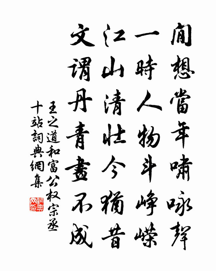 詩詞名句歷史字典書法欣賞書法字典國語詞典說文解字康熙字典古漢語字典標 題 作 者 詩 句 和富公權宗丞十站作者:王之道 朝代:宋代和富公權宗丞十站原文閒想當年嘯詠聲,一時人物斗崢嶸。江山清壯今猶昔,文謂丹青畫不成。詩詞問答問:和富公權宗丞十站的作者是誰?答:王之道問:和富公權宗丞十站寫於哪個朝代?答:宋代王之道和富公權宗丞十站書法欣賞和富公權宗丞十站書法作品詩詞推薦酬顧況見寄包佶〔唐代〕于越城邊楓葉高,楚人書里寄離騷。寒江鸂鶒思儔侶,歲歲臨流刷羽毛。長安春暮潘鹹〔唐代〕客在關西春暮夜,還同江外已清明。三更獨立看花月,惟欠子規啼一聲。銅雀妓顧非熊〔唐代〕鴉散陵樹曉,筵開繐帳空。嬋娟寵休妒,歌舞怨來同。往事與塵化,新愁生曲終。回軒葉正落,寂寞聽秋風。水調歌頭(和尹存吾)劉辰翁〔宋代〕造物反乎覆,白首困耆英。吟風賞月石上,一笑再河清。一百八盤道路,二十四橋歌舞,身世夢堪驚。獨酌未能醉聽歌六絕句。想夫憐白居易〔唐代〕玉管朱弦莫急催,容聽歌送十分杯。長愛夫憐第二句,請君重唱夕陽開。雜曲歌辭十二月樂辭五月李賀〔唐代〕雕玉押簾上,輕轂籠虛門。井汲鉛華水,扇織鴛鴦文。回雪舞涼殿,甘露洗空綠。羅袖從徊翔,香汗沾寶粟。程朱之學四首陳普〔宋代〕大中豈難明,不偏立可得。偏似扶醉人,中如正柱石。亭亭即道體,截截皆天則。一毫不可裒,一發不可益。舜君隆興書堂自警三十五首陳淳〔宋代〕言人必志聖,論學必志道。有如講為邦,規模必王佐。自省徐瑞〔宋代〕閉閣焚香一欠伸,晴窗如鏡暖如春。平生自有會心處,後世豈無知我人。漫拄蟲魚消白日,莫緣炙獨或天真。客來虎丘汪元量〔宋代〕維舟與客訪興亡,寺有殘僧說故王。寶物已銷龍虎氣,奎章猶射鬥牛光。為妖真女花藏墓,說法生公月滿堂。邂逅憶王孫汪元量〔宋代〕塵寰財色苦相縈。著愛浮華役此身。好收靈源一點真。絕貪嗔。便是逍遙到岸人。江上釋紹嵩〔宋代〕春岸波平汀草深,江雲黯黯作愁陰。詩材眼界知多少,欲罷不能聊一吟。寒夜陸游〔宋代〕堅冰塞川厚莫測,斷雁叫群聲可哀。草圍小瓮酒未熟,霜壓瘦枝梅不開。稚子忍寒守蠹簡,老夫忘睡畫爐灰。低頭十月上休日示求道人朱槔〔宋代〕老禪獨臥千岩表,枯木寒雲伴此身。只倚藜根作詩本,肯分秋色與騷人。心源落落故難合,筆勢翩翩想絕倫。記取初貶官過望秦嶺 自此後詩江州路上作。白居易〔唐代〕草草辭家憂後事,遲遲去國問前途。望秦嶺上回頭立,無限秋風吹白須。藍橋春雪君歸日,秦嶺秋風我去時。每到贈隱者薛能〔唐代〕自得高閒性,平生向北棲。月潭雲影斷,山葉雨聲齊。庭樹人書匝,欄花鳥坐低。相留永不忘,經宿話丹梯。句仙上人〔宋代〕男兒三十未有立,人世百年徒自勞。留別唐棲雲泉上人周弼〔宋代〕水宿唐棲寺,何緣更浹旬。千山今日路,三歲異鄉人。小殿眠身佛,空廊折臂神。歸時重作禮,又拂一番塵。詩挽樓少陽所生母夫人姜特立〔宋代〕繼室侯家古有聞,熒粕還得配樞臣。香嚴童子先成佛,瑣骨仙人後化身。共喜伯仁今有母,何妨小德外無親。向來初三日出東郊碑樓院范成大〔宋代〕遠柳新晴暝紫煙,小江吹凍舞清漣。紅塵一哄人歸後,跕跕飢鳶蹙紙錢。名句推薦日暮長江里,相邀歸渡頭。儲光羲《江南曲四首》 竹深樹密蟲鳴處,時有微涼不是風。楊萬里《夏夜追涼》 黃河水繞漢宮牆,河上秋風雁幾行。李夢陽《秋望》 可憐報國無路,空白一分頭。楊炎正《水調歌頭·登多景樓》 愛而知其惡,憎而知其善。戴聖《禮記·曲禮上》 不力行,但學文。長浮華,成何人。李毓秀《弟子規·餘力學文》 願為西南風,長逝入君懷。曹植《七哀詩》 綠鬢能供多少恨,未肯無情比斷弦晏幾道《破陣子·柳下笙歌庭院》 南風吹其心,搖搖為誰吐?王冕《墨萱圖·其一》 一種青山秋草里,路人唯拜漢文陵許渾《途經秦始皇墓》