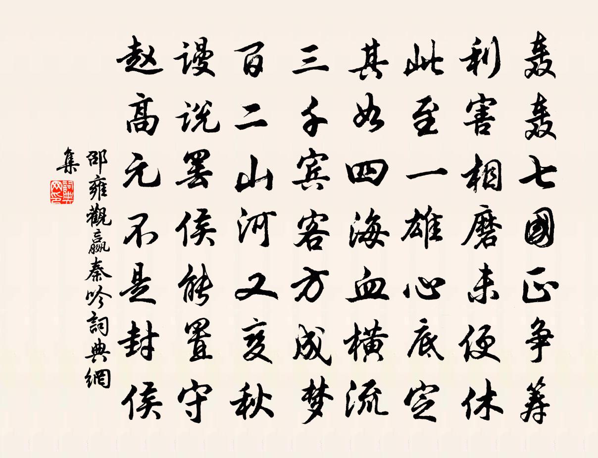 詩詞名句歷史字典書法欣賞書法字典國語詞典說文解字康熙字典古漢語字典標 題 作 者 詩 句 觀嬴秦吟作者:邵雍 朝代:宋代觀嬴秦吟原文轟轟七國正爭籌,利害相磨未便休。此至一雄心底定,其如四海血橫流。三千賓客方成夢,百二山河又變秋。謾說罷侯能置守。趙高元不是封侯。詩詞問答問:觀嬴秦吟的作者是誰?答:邵雍問:觀嬴秦吟寫於哪個朝代?答:宋代邵雍觀嬴秦吟書法欣賞觀嬴秦吟書法作品詩詞推薦司理弟之官岳陽相別於定王台悽然有感為賦五真德秀〔宋代〕定王百尺台,長安萬里目。昔人思親心,山川詎能局。於焉共登臨,使我增感觸。微霜隕陔蘭,悲風撼庭木。銀山夜意李商隱〔唐代〕簾垂幕半卷,枕冷被仍香。如何為相憶,魂夢過瀟湘。梅花十首張耒〔宋代〕任教雪壓色終勝,卻要風嚴香更聞。江雨細時青子熟,聞名猶救渴將軍。長相思石孝友〔宋代〕紅依稀。綠依稀。寒勒花梢開較遲。蝶魂空自迷。怕人疑。使人疑。人道閒愁想未知。歌眉因甚低。華嚴院黃彥平〔宋代〕懶病尋幽意已忘,茲辰得與步同岡。一聲啼鳥喚愁醒,百尺遊絲惹恨長。沙際旋供隨意綠,雪餘何物反魂香。江南贈馮法師舒岳祥〔宋代〕我昔登巾山,曾題翠微閣。清詩照江月,月落詩不落。踏露沐長松,遼東一隻鶴。千載還歸來,塔杪棲寥廓。過我春山雨中聞笛邵棠〔宋代〕余寒欺酒不成醺,轉覺供詩景物新。篛笠帶歸山路雨,竹簫吹老隴梅春。田君泉石閒招隱,顏子簞瓢自食貧。莫詫送茶宋大監毛滂〔宋代〕玉兔甌中霜月色,照公問路廣寒宮。絕勝自酌寒窗下,睡減悲添愁事叢。貧居陸游〔宋代〕囊空如客路,屋窄似僧寮。得飯多菰米,烹蔬半藥苗。草生初失徑,筍放欲乾霄。不道弓旌誤,虞人自畏招。送陳吏部還朝陸游〔宋代〕邂逅稽山許攬須,塵埃時得近冰壺。不辭我老雞豚社,且喜公歸櫻筍廚。滿室琴書懷燕几,一川風雨送行艫。勉哉雜曲歌辭車遙遙張祜〔唐代〕東方曨曨車軋軋,地色不分新去轍。閨門半掩床半空,斑斑枕花殘淚紅。君心若車千萬轉,妾身如轍遺漸遠。碧川菩薩蠻(梅)趙長卿〔宋代〕肩輿曉踏江頭月。月華冷浸消殘雪。雪月照疏籬。梅花三兩枝。人憐花淡薄。花恨人牢落。不似那回時。醺醺醉玉寄陳伯耕二首袁燮〔宋代〕風梳雨沐厭馳驅,我馬虺聵我仆痡。惟有風流髯主簿,才高不肯混泥塗。水調歌頭(壽馬守·五月十八)梅坡〔宋代〕五月進農黍,三葉換階蓂。不知今夕何夕,嵩岳慶生申。蓮幕泮宮小試,花懸二車遍歷,所至藹芳聲。一札頒明詔食老菱有感楊萬里〔宋代〕幸自江湖可避人,懷珠韞玉冷無塵。何須抵死露頭角,荇葉荷花老此身。頌古五十三首釋文禮〔宋代〕賸噇生菜似頭驢,臨濟堂前捉敗渠。聳耳長鳴隨踢踏,不知業債倩誰除。唐樂府十首邊軍過劉駕〔唐代〕城前兵馬過,城裡人高臥。官家自供給,畏我田產破。健兒食肥肉,戰馬食新谷。食飽物有餘,所恨無兩腹。草青苦熱張嵲〔宋代〕三吳多異候,瘧癘日愁予。夏日雖可畏,清風非穆如。殘春且重繭,徂暑但深居。凍飲清涼耐,由來未可儲。句劉褒〔宋代〕蘇堤一帶柳陰長。喜遷鶯楊再可〔宋代〕臘天初曉,慶五色瑞雲,華軒呈繞。紫府真人,丹台仙伯,合降世間榮耀。彩筆素題,篇翰未減,家聲詞藻。秀眉名句推薦黃河西來決崑崙,咆哮萬里觸龍門。李白《公無渡河》 乃知兵者是兇器,聖人不得已而用之。李白《戰城南》 萬物迎春送殘臘,一年結局在今宵。戴復古《除夜》 漢臣曾此作縲囚,茹血衣毛十九秋。汪遵《詠北海》 良馬難乘,然可以任重致遠;良才難令,然可以致君見尊。墨子《墨子·01章 親士》 理直千人必往,心虧寸步難移。馮夢龍《醒世恆言·卷十六》 千門開鎖萬燈明,正月中旬動帝京。張祜《正月十五夜燈》 嘆寄與路遙,夜雪初積。姜夔《暗香疏影》 心似已灰之木,身如不系之舟。蘇軾《自題金山畫像》 為我引杯添酒飲,與君把箸擊盤歌。白居易《醉贈劉二十八使君》