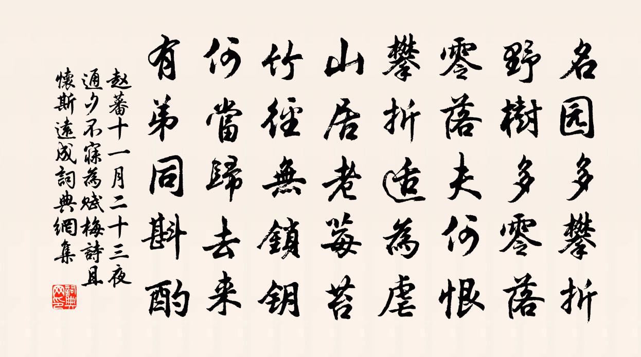 詩詞名句歷史字典書法欣賞書法字典國語詞典說文解字康熙字典古漢語字典標 題 作 者 詩 句 十一月二十三夜通夕不寐為賦梅詩且懷斯遠成作者:趙蕃 朝代:宋代原文名園多攀折,野樹多零落。零落夫何恨,攀折適為虐。山居老莓苔。竹徑無鎖鑰。何當歸去來,有弟同斟酌。詩詞問答問:《十一月二十三夜通夕不寐為賦梅詩且懷斯遠成》的作者是誰?答:趙蕃問:該詩寫於哪個朝代?答:宋代書法欣賞十一月二十三夜通夕不寐為賦梅詩且懷斯遠成書法作品詩文賞析【原題】:十一月二十三夜通夕不寐為賦梅詩且懷斯遠成父友弟及五首而曉書呈在伯詩詞推薦青玉案 和友人壽席袁易〔元代〕春來十日春多少。扶路金釵試燈早。旋翦壽幡飛蝶小。東家垂柳,西家明月,風物年年好。種桃三千今餘九,誰道橫吹曲辭隴頭吟王維〔唐代〕長安少年遊俠客,夜上戍樓看太白。隴頭明月迥臨關,隴上行人夜吹笛。關西老將不勝愁,駐馬聽之雙淚流。身經扇子詩李石〔宋代〕春暖錦棠覆徑,夏涼紅藕盈池。九蕊東籬綻菊,一花南岸梅枝。吏隱宜春郡詩十首祖無擇〔宋代〕吏隱宜春郡,追惟二相賢。節明天寶日,業茂會昌年。友善曾何累,朋誣亦自煎。不才非不幸,異代若差肩。滿江紅(赴玉山之謫,與諸父泛舟大澤,分題為別)晁補之〔宋代〕莫話南征,船頭轉、三千餘里。未嘆此、浮生飄蕩,但傷佳會。滿眼青山芳草外,半篙碧水斜陽里。問此中、何處初夏書事方回〔宋代〕平生萬事鳥飛空,綠鬢蒼顏俯仰中。醉若山頹無舊侶,坐如泥塑有新功。新成不覺窗移日,心定何煩扇引風。結網雨中即事簡二友鄭清之〔宋代〕鶯聲求友亂繅車,兀坐翻思二客佳。乞得晚晴紅照水,南坡東畔月侵階。過沖寂觀蔣璨〔宋代〕兔井橋邊鷁首橫,過逢仍怯近鄉情。路人失喜交頭語,鄰犬何知掉尾迎。重到雲房驚落寞,直須金闕早崇成。百年清明日新霽陳杰〔宋代〕昨夜風雨聲,今朝鳥弄晴。光陰殊變態,天地本清明。世事觀親火,年華怯冷餳。棠梨溪上冢,諸老得無情。騏驥池上與沖卿同賦韓維〔宋代〕清簾醫華屋,脩樹環廣池。涼風欣然來,忽若與我朝。感激氣節異,念言此何時。雲霄有靈匹,嘉會方在茲。瓜華重送曾誠之兼簡俞澹陳庾賀鑄〔宋代〕春風漠漠老江蘺,行矣騷人好自持。半百幻身如且健,石頭城下兩茅茨。寄呈飯牛翁王遂〔宋代〕早計關防意敢{左牛右角},莫教露盡草頭枯。芒寒甯戚謳歌怨,色自涪翁牧養圖。露地相忘無踐稼,縣官雖巧不道逢文通北使歸王安石〔宋代〕朱顏使者錦貂裘,笑語春風入貝州。欲報京都近訊息,傳聲車馬少淹留。行人盡道還家樂,騎士能吹出塞愁。回首深山逢老僧二首貫休〔唐代〕衲衣線粗心似月,自把短鋤鋤榾柮。青石溪邊踏葉行,數片雲隨兩眉雪。山童貌頑名乞乞,放火燒畬采崖蜜。擔頭山居雜詩九十首曹勛〔宋代〕和靖骨已槁,後來欲無說。細雨斷魂句,妙處益清絕。朅來客異縣,籬落泠風月。吟喔一字難,愧此枝下雪。隆興書堂自警三十五首陳淳〔宋代〕克己貴乎嚴,存心大而正。改過勿憚吝,任道尤須勁。貢院題魏扶〔唐代〕梧桐葉落滿庭陰,鎖閉朱門試院深。曾是昔年辛苦地,不將今日負初心。書嘆七首戴表元〔宋代〕數友越州居,無書無三年。台州已無數,逢人每相賢。日夜已遠友,遠者隔蠻煙。風氣不擇州。俗情輕目前。管鮑武康道中俞灝〔宋代〕竹窗聽雨自安眠,不道驚湍近屋前。省得去年桃棄渡,水痕只到樹傍邊。洞天春侯善淵〔元代〕道要仙機,頓悟方知,物物盡捐。見本來一性,沖開昊境,朗如秋月,清似寒泉。湛湛澄澄,纖塵不染,出入龍鄉名句推薦此心隨去馬,迢遞過千峰。方乾《送從兄郜 / 韋郜 / 途中別孫璐》 前年伐月支,城上沒全師。張籍《沒蕃故人》 城門失火,殃及池魚。司馬光《資治通鑑·梁紀·梁紀十六》 富貴不能淫,貧賤不能移,威武不能屈。孟子《孟子·滕文公章句下·第二節》 蠟淚惱東風,舊壘眠新燕。納蘭性德《生查子·鞭影落春堤》 風雨端陽生晦冥,汨羅無處吊英靈。貝瓊《已酉端午》 午窗睡起鶯聲巧,何處喚春愁?朱淑真《眼兒媚·風日遲遲弄輕柔》 蒼蒼竹林寺,杳杳鐘聲晚。劉長卿《送靈澈上人》 出家人莫說在家話。吳承恩《西遊記·第三十二回》 波上馬嘶看棹去,柳邊人歇待船歸。溫庭筠《利州南渡》