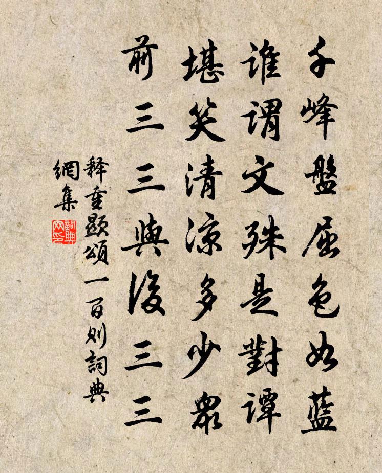 詩詞名句歷史字典書法欣賞書法字典國語詞典說文解字康熙字典古漢語字典標 題 作 者 詩 句 頌一百則作者:釋重顯 朝代:宋代頌一百則原文千峰盤屈色如藍,誰謂文殊是對譚。堪笑清涼多少眾,前三三與後三三。詩詞問答問:頌一百則的作者是誰?答:釋重顯問:頌一百則寫於哪個朝代?答:宋代釋重顯頌一百則書法欣賞頌一百則書法作品詩詞推薦送劉尉李新〔宋代〕斗南無兩劉,弟子半分魯。傳法得其人,只履便西去。天章蜀家世,生女如士虎。我叔亦不痴,最寶劉家婦。道通次韻和復古春日五絕句司馬光〔宋代〕燕拂人衣絮撲頭,紅英滿地綠陰稠。殘春舉目多愁思,休上迢迢百尺樓。籌筆驛(余為蜀從事,病武侯非王佐才,因有是題)薛能〔唐代〕葛相終宜馬革還,未開天意便開山。生欺仲達徒增氣,死見王陽合厚顏。流運有功終是擾,陰符多術得非奸。當初貧甚戲作絕句陸游〔宋代〕北齏孤坐破三更,庭戶無人有月明。數種褲襦秋未贖,羨他鄰巷搗衣聲。宮詞王安石〔宋代〕六宅新妝促錦,三宮巧仗叢花。一片黃雲起處,內人遙認官家望思台羅隱〔唐代〕芳草台邊魂不歸,野煙喬木弄殘暉。可憐高祖清平業,留與閒人作是非。除夜感懷楊時〔宋代〕愛日乖予願,親顏長在心。遠遊仍換歲,華發想盈簪。永夜誰同席,殘盃憶共斟。相思空有淚,揮灑滿衣襟。挽郭處士劉克莊〔宋代〕昔聞東郭先生者,處士寧非是遠孫。空有新詩喧一邑,竟無明詔老孤村。雷琴酷愛應同殉,草字尤工惜不存。復說石孫試童子郡廣文贈之詩代賡為謝方岳〔宋代〕不緣青紫不明經,科目多慚舊兩生。三豕魯魚曾未學,一蝸蠻觸已爭名。棟樑材欲丘山重,滄海珠遺星斗明。未必杜侍郎輓詞三首陳師道〔宋代〕驥騄方懷遠,松筠忽有秋。雍容名士數,終始法家流。凜凜驚千載,堂堂閟一丘。能令羊季子,不肯過西州。木蘭花慢 在德六年正旦 天下同文補遺盧摯〔元代〕問東風何似,早吹綠、洞庭波。要催起江頭,梅妝的,柳態婆娑。遙知玉墀鷺,對青陽、綠禁郁嵯峨。歡動雲燒筍釋紹曇〔宋代〕稚子相呼脫錦衣,餉春不減道山薇。翻身跳入爐中浴,透得山僧齧鏃機。奉詔止雨宿齋建隆觀宋庠〔宋代〕漢家候神館,奉詔穰沈災。解纓就齋幕,恍若躋蓬萊。雲羅絓朝舄,露掌承仙杯。眾真拱象帝,寶宇正崔嵬。爐煙不怕鬼 / 曹司農竹虛言紀昀〔清代〕曹司農竹虛言,其族兄自歙往揚州,途經友人家。時盛夏,延坐書屋,甚軒爽,暮欲下榻其中。友人曰:“是有魅行路難贈蕭坦翁朱繼芳〔宋代〕行路難,居不易,旋買生柴煮一字。三千風不直一杯水,何用狂吟動天地。郡不見陸天隨。忍窮讀書白眼屠沽兒。鷓鴣天(季功旬會之次日,小醵餞陳巡入鄉)郭應祥〔宋代〕點檢尊前主與賓。今宵依舊昨宵人。自緣笑語生和氣,不為風光屬小春。香靉靆,酒清醇。山餚野蔌總前陳。掀髯題大年關路逢僧圖晁說之〔宋代〕關深羇思滿,風斷綠陰單。一遇空門侶,那知行路難。舟行即事朱淑真〔宋代〕對景如何可遣懷,與誰江上共詩裁。江長景好題難盡,每日臨風愧乏才。謝麪謝枋得〔宋代〕豐年自古說來牟,四月麥熟勝秋收。天廚送食不待求,有麪餺飥吾何憂。安得化身為兒童,戲沙作麪可報答。授記贈婦詩秦嘉〔兩漢〕皇靈無私親,為善荷天祿。傷我與爾身,少小罹煢獨。既得結大義,歡樂苦不足。念當遠離別,思念敘款曲。河廣名句推薦春山碧樹秋重綠,人在武陵溪。劉基《眼兒媚·秋思》 晚妝初了明肌雪,春殿嬪娥魚貫列。李煜《木蘭花·晚妝初了明肌雪》 其交也以道,其接也以禮孟子《孟子·萬章章句下·第四節》 貧無可奈惟求儉,拙亦何妨只要勤。王永彬《圍爐夜話·第三則》 宮衣亦有名,端午被恩榮。杜甫《端午日賜衣》 善惡同,則功臣倦。黃石公《三略·上略》 日暮征帆何處泊,天涯一望斷人腸。孟浩然《送杜十四之江南 / 送杜晃進士之東吳》 宮女如花滿春殿,只今惟有鷓鴣飛。李白《越中覽古》 風雨如晦,雞鳴不已。佚名《風雨》 綠兮絲兮,女所治兮。我思古人,俾無訧兮!佚名《綠衣》