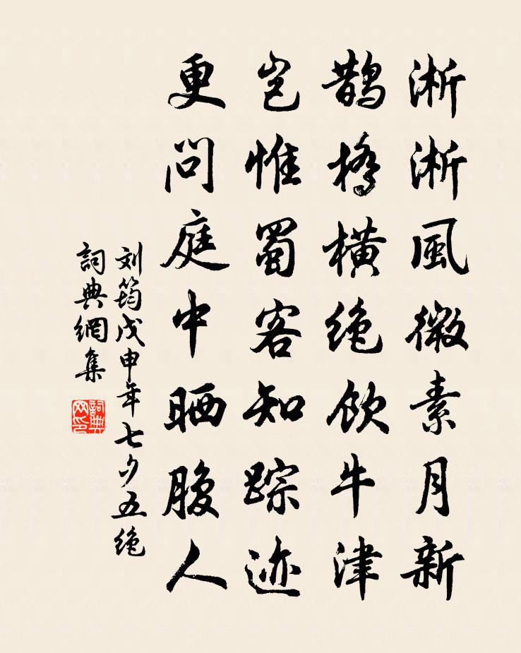 詩詞名句歷史字典書法欣賞書法字典國語詞典說文解字康熙字典古漢語字典標 題 作 者 詩 句 戊申年七夕五絕作者:劉筠 朝代:宋代戊申年七夕五絕原文淅淅風微素月新,鵲橋橫絕飲牛津。豈惟蜀客知蹤跡,更問庭中曬腹人。詩詞問答問:戊申年七夕五絕的作者是誰?答:劉筠問:戊申年七夕五絕寫於哪個朝代?答:宋代劉筠戊申年七夕五絕書法欣賞戊申年七夕五絕書法作品詩詞推薦謝潘端叔惠紅梅樓鑰〔宋代〕歲晚紅英繞凍柯,玉人無那醉顏酡。廣平賦就如逢妝,鐵石心腸可柰何。次韻答趙之源仍簡演師王灼〔宋代〕年年春事寄征鞍,一笑歸來已強顏。但得從今千日醉,寧論自古四並難。憐君不怕憑烏幾,顧我猶知愛碧山。應許陽復武衍〔宋代〕一變陽爻七日初,窗閒測影弄徐徐。不知曾未添宮線,但覺多翻數葉書。感皇恩 登樓即事王惲〔元代〕斜日倚高樓,亂峰圍繞。山色湖光翠如埽。天涯倦客,目斷野煙高鳥。□□□□□,□□□。老境**,憂心悄悄泗州過倉中劉景文老兄戲贈一絕蘇軾〔宋代〕既聚伏波米,還數魏舒籌。應笑蘇夫子,僥倖得湖州。寄楊贊圖學士學士與元昆俱以龍腦登選黃滔〔唐代〕東堂第一領春風,時怪關西小驥慵。華表柱頭還有鶴,華歆名下別無龍。君恩鳳閣含毫數,詩景珠宮列肆供。今日東興鋪二首趙文〔宋代〕老人無淚與君啼,夢裡相逢路竟迷。二十三年崇勝寺,對床今夜是江西。打馬賦李清照〔宋代〕 歲令雲徂,盧或可呼。千金一擲,百萬十都。樽俎具陳,已行揖讓之禮;主賓既醉,不有博奕者乎!打馬爰興古墳詩周端臣〔宋代〕短牆摧倒樹欹斜,碧齋開滿地花。馬鬣就荒無認處,墓臆碑在野人家。韋侍郎山居王維〔唐代〕幸忝君子顧,遂陪塵外蹤。閒花滿岩谷,瀑水映杉松。啼鳥忽歸澗,歸雲時抱峰。良游盛簪紱,繼跡多夔龍。詎枉上巳游東禪詩王逵〔宋代〕紫陌破清晨,雕鞍映畫輪。因修洛陽禊,重憶永和春。錦鄉荀香度,樓台梵宇新。忙中得間暇,來見解空人。登樓晚望華岳〔宋代〕六曲朱闌瞰碧虛,淡煙秋水接平蕪。展開風月添詩料,裝點江山歸畫圖。舉足便堪馳駟馬,折腰何必問雙鳧。當年念奴嬌范成大〔宋代〕十年舊事,醉京花蜀酒,萬葩千萼。一棹歸來吳下看,俯仰心情今昨。強倚雕闌,羞簪雪鬢,老恐花枝覺。揩摹愁滿庭芳陳允平〔宋代〕槐影釣魚連陰,竹光摶露,小荷新綠浮園。簟紋如浪,綃帳碧籠煙。回合溪橋一曲,初雨過、流水濺濺。闌乾外,范至能游靈石錄示詩仙留題雲李洪〔宋代〕勝概風生步武,山靈景從歸雲。塵世欲尋飈馭,藤陰萬個蒼筠。古意題徐令壁陳子昂〔唐代〕白雲蒼梧來,氛氳萬里色。聞君太平世,棲泊靈台側。垂虹亭錢明逸〔宋代〕千里波平瑟瑟風,纖雲不解翳虛空。素娥自有清光在,上下清明一鑒中。答高計使韻趙汝騰〔宋代〕使承帝若予工,膴膴周原布惠風。正似公權懷筆諫,豈如後蔡譜茶功。春盈夏涸疑神水,茶苦飴甘屬太空。芹獻固逸再為婺女之行既別出郭矣夜不能寐成六絕句趙蕃〔宋代〕正學堂堂呂紫微,有孫端的為傳衣。只今一派金華是,戴路年來汝所依。慶建州葉守劉克莊〔宋代〕不比群花取次開,晚香高節匹寒旃。分明帶得清癯相,故傍層冰積雪來。名句推薦葉落當歸根,雲沉久必起。錢嶫《憫黎詠》 欲將心事付瑤琴。岳飛《小重山·昨夜寒蛩不住鳴》 新歡不抵舊愁多,倒添了、新愁歸去范成大《鵲橋仙·七夕》 人惡人怕天不怕,人善人欺天不欺。佚名《增廣賢文·上集》 明日隔山嶽,世事兩茫茫。杜甫《贈衛八處士》 一山飛峙大江邊, 躍上蔥蘢四百旋 * 《七律·登廬山》 窗外日光彈指過,席間花影坐前移。施耐庵《水滸傳·第二回》 光陰可惜,譬諸逝水。顏之推《顏氏家訓·勉學篇》 香到酴醾送晚涼,荇風輕約薄羅裳。曲闌憑遍思偏長。葉小鸞《浣溪沙·初夏》 因思杜陵夢,鳧雁滿回塘。溫庭筠《商山早行》
