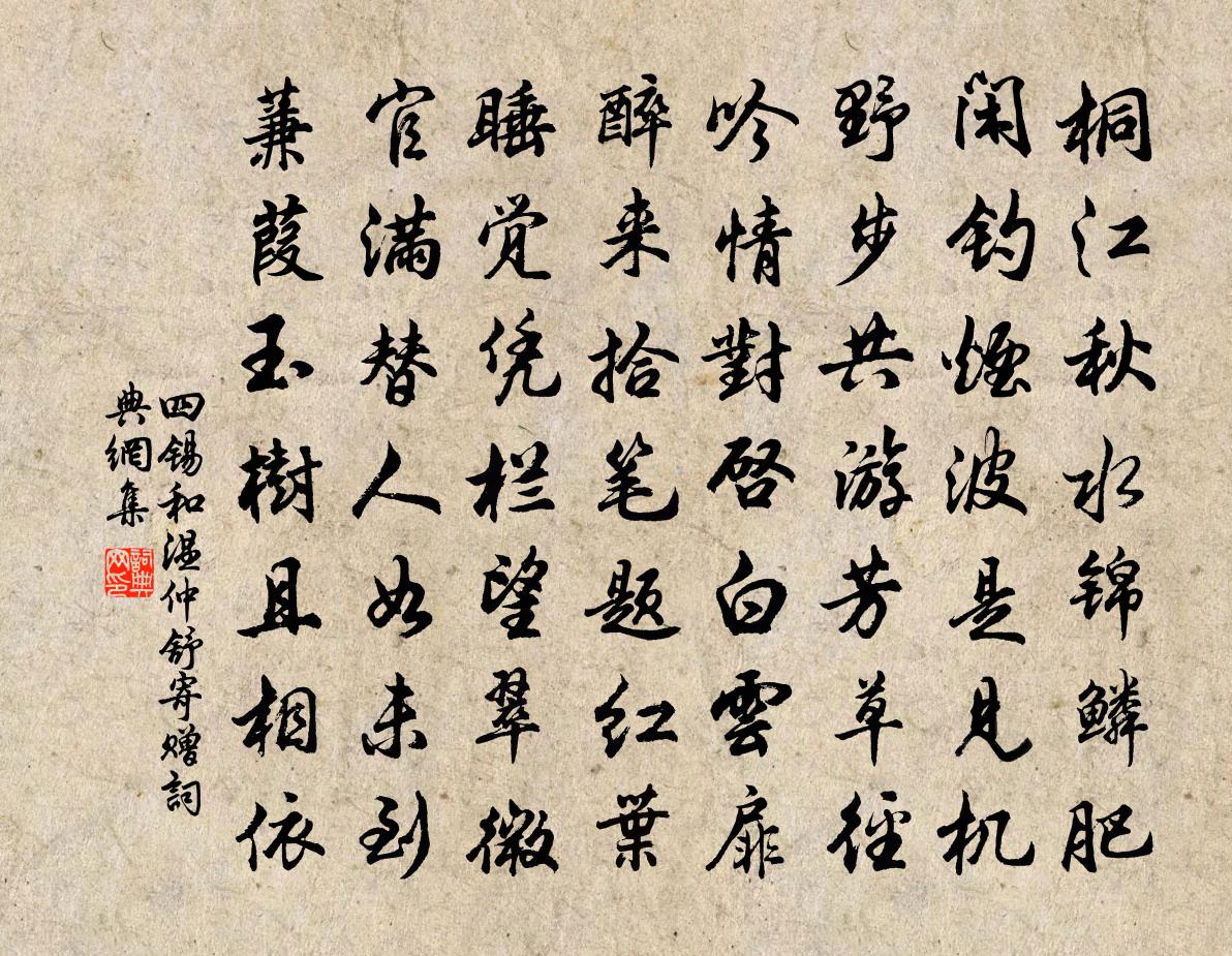 詩詞名句歷史字典書法欣賞書法字典國語詞典說文解字康熙字典古漢語字典標 題 作 者 詩 句 和溫仲舒寄贈作者:四錫 朝代:宋代和溫仲舒寄贈原文桐江秋水錦鱗肥,閒釣煙波是見機。野步共游芳草徑,吟情對啟白雲扉。醉來拾筆題紅葉,睡覺憑欄望翠微。官滿替人如未到,蒹葭玉樹且相依。詩詞問答問:和溫仲舒寄贈的作者是誰?答:四錫問:和溫仲舒寄贈寫於哪個朝代?答:宋代四錫和溫仲舒寄贈書法欣賞和溫仲舒寄贈書法作品詩詞推薦滿庭芳·紅杏香中趙良玉〔宋代〕紅杏香中,綠楊影里,畫橋春水泠泠。深沉院滿,風送賣花聲。又是清明近也,粉牆畔,時有遷鶯。當此際,人傳菩薩蠻李洪〔宋代〕寒山橫抹修眉綠。樓前溪瀑鏘鳴玉。車馬各西東。行人如轉蓬。闌乾成獨倚。海闊天無際。雲淡隔壺山。鴻飛杳靄寄玉笥蕭高士羅與之〔宋代〕滴露謄真誥,蕭然莫與群。新詩高似月,世念薄於雲。俗走堪憐我,閒眠極羨君。唯余綠綺韻,惆悵未曾聞。遇仇仁近出齋小飲次前韻五首方回〔宋代〕萬端□□□難宣,此腹便便六十年。寧作鴟夷長貯酒,可能□□□名錢。一瓢陋巷應常事,駟馬高車特偶然。潦倒秋夕遣興汪晫〔宋代〕秋月清如水,涼生善養堂。鵲驚梧葉墜,露厭稻花香。煨芋薦蛆白,開橙擘蟹黃。客來隨所有,此興不能忘。西江月 贈張先生尹志平〔元代〕日用灶頭然火,時教突里亡煙。始終如一志精專。也勝往來打轉。放下紛紛塵事,明通朗朗玄言。一朝功到性靈圓相見歡·林花謝了春紅李煜〔唐代〕林花謝了春紅,太匆匆。無奈朝來寒雨晚來風。胭脂淚,相留醉,幾時重。自是人生長恨水長東。(相留 一作:潁亭留別元好問〔金代〕故人重分攜,臨流駐歸駕。乾坤展清眺,萬景若相借。北風三日雪,太素秉元化。九山郁崢嶸,了不受陵跨。寒波次韻外舅黃虞卿為愛山園好八首喻良能〔宋代〕為愛山園好,都無塵世喧。穗禾臨芰沼,繩草對苔垣。去就隨佳醞,窮通付寓言。還同李長吉,來過有高軒。醉蓬萊(壽八窗叔)李曾伯〔宋代〕指梅花雪片,問訊八窗,南枝開未。一點春風,訊息嶺頭寄。太白精神,廣平韻度,是豈眾芳擬。東閣吟邊,水清定水寺行香鄭谷〔唐代〕聽經看畫繞虛廊,風拂金爐待賜香。丞相未來春雪密,暫偷閒臥老僧床。失子林季仲〔宋代〕檐鵲哺雛時自喜,壟牛舐犢互相噓。老妻覷我無他語,歡笑何年得似渠。開井葛天民〔宋代〕小圃新穿土,中藏一丈空。山腰泉脈透,進口樹陰蒙。澆藥先資用,煎茶已見功。甘涼羞自薦,汲許四鄰同。謝賜臘藥感遇之什范成大〔宋代〕鴻寶刀圭下九關,十年長奉璽封看。扶持蒲柳身猶健,收拾桑榆歲又寒。天地恩深雙鬢雪,山川途遠一心丹。疲甿登泰州城樓蔣春霖〔清代〕四野霜晴海氣收,高城嘯侶共登樓。 旌旗雜沓連三郡,鎖鑰矜嚴重一州。 西望雲山成間阻,南飛鳥鵲尚淹留。坐中聞思帝鄉有感令狐楚〔唐代〕年年不見帝鄉春,白日尋思夜夢頻。上酒忽聞吹此曲,坐中惆悵更何人。晚登東樓懷子京鎮陽二首宋庠〔宋代〕周界西窮陝,常山北盡邊。關河相望日,容鬢各衰年。蓬亂將風野,禽稀欲雪天。治戎如有暇,莫惜賦歸田。朝中措 游靈源山 以上二首見孫德謙全金詞稿冀國公主〔元代〕倦遊蹤跡查無憑,寥落過山城。客館瀟瀟夜雨,披襟鳳燭青熒。追思往事,十年一夢,堪笑堪驚。冉冉隙駒光景,別懷杜牧〔唐代〕相別徒成泣,經過總是空。勞生慣離別,夜夢苦西東。去路三湘浪,歸程一片風。他年寄訊息,書在鯉魚中。胡孫愁范成大〔宋代〕傾崖當胸石足齧,失勢毛氂槁幽谷。王孫卻走斷不到,惟有衰猿如鬼哭。僕夫酸嘶訴塗窮,我亦付命無何中悲風忽名句推薦龜言此地之寒,鶴訝今年之雪。庾信《小園賦》 治生乎君子,亂生乎小人。荀子《荀子·王制》 夜雨做成秋,恰上心頭。納蘭性德《浪淘沙·夜雨做成秋》 戰陣之間,不厭詐偽。韓非及後人《韓非子·難一》 天意憐幽草,人間重晚晴。李商隱《晚晴》 不經一事,不長一智。佚名《增廣賢文·下集》 如何同枝葉,各自有枯榮李白《樹中草》 西風稍急喧窗竹,停又續,膩臉懸雙玉。閻選《河傳·秋雨》 多言數窮,不如守中。老子《老子·道經·第五章》 樸實渾厚,初無甚奇,然培子孫之元氣者,必此人也。王永彬《圍爐夜話·第十九則》