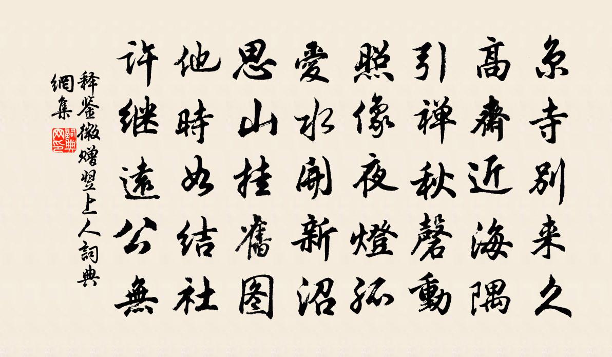 詩詞名句歷史字典書法欣賞書法字典國語詞典說文解字康熙字典古漢語字典標 題 作 者 詩 句 贈翌上人作者:釋鑒微 朝代:宋代贈翌上人原文京寺別來久,高齋近海隅。引禪秋磬動,照像夜燈孤。愛水開新沼,思山掛舊圖。他時如結社,許繼遠公無。詩詞問答問:贈翌上人的作者是誰?答:釋鑒微問:贈翌上人寫於哪個朝代?答:宋代釋鑒微贈翌上人書法欣賞贈翌上人書法作品詩詞推薦陵州羅公升〔宋代〕五月征裘路五千,長安疑在北辰邊。故園歸夢西風冷,明日陵州正覓船。不善吟邵雍〔宋代〕不良之人,稟氣非正。蛇蠍其情,豺狼其性。至良之人,稟氣清明。金玉其性,芝蘭其情。跋蔡節齋為題張生所畫文公像真德秀〔宋代〕張生父子稱紫陽,於容人物非尋常。能傳遺像數百本,粹然千載存無忘。言學工夫日星皎,無言氣象真難曉。後學中隱堂詩蘇軾〔宋代〕都城更幾姓,到處有殘碑。古隧埋蝌蚪,崩崖露伏龜。安排壯亭榭,收拾費金貲。岣嶁何須到,韓公浪自悲。睡覺聞兒子讀書陸游〔宋代〕夢回聞汝讀書聲,如聽簫韶奏九成。且要沉酣向文史,未須辛苦慕功名。人人本性初何欠,字字微言要力行。老病南歌子詞三首裴諴〔唐代〕不是廚中丳,爭知炙里心。井邊銀釧落,展轉恨還深。不信長相憶,抬頭問取天。風吹荷葉動,無夜不搖蓮。簳蠟袁從道山廬三首葛紹體〔宋代〕人生盡馳騖,忙裡換烏兔。白髮忽相侵,紅顏若何駐。豈如向丘壑,味此閒中趣。鶬鶊啼春風,鳲鳩喚時雨。因林宿輝公精舍溫庭筠〔唐代〕禪房無外物,清話此宵同。林彩水煙里,澗聲山月中。橡霜諸壑霽,杉火一爐空。擁褐寒更徹,心知覺路通。句姚彥游〔宋代〕見說巴南一小州,孤城寂莫字江顏。聞說巴南無一事,助人清思有江山。紹興以後祀五方帝六十首佚名〔宋代〕[圜鍾為宮]維帝奠位,乃鹹於時。孰主張是,而樞紐之。觳我腹我,比予於見。告我冠服,迨其委蛇。閒思陸游〔宋代〕溝水細無聲,窗扉晚更明。簾開燕雙入,人靜鵲群行。青李求初至,黃醅釀已成。出門無奈嬾,不是傲公卿。次張安國舍人讀王侍郎詩有懷其人韻虞儔〔宋代〕蓋世聲名紫府仙,平生襟袖著山川。一麾管領秋江月,千首憑陵杜曲天。疇昔風雲餘感慨,歸來文字帶芳鮮。和韓分得無題陳起〔宋代〕露杯雲館昔相留,解佩人歸暗綠洲。八斗才高空賦洛,九層台迥易悲秋。定知玉鳳人吹怨,還念金龜婿遠遊。屏曲過閻氏橋亭李廌〔宋代〕綠芰紅蕖照眼新,池塘風軟起青苹。遠山碧映重林暮,委徑香傳別洞春。五月獨為長道客,滄浪自有濯纓人。誰知禪人並化主寫真求贊釋正覺〔宋代〕靜復湛存,潮退珊瑚之根;智隨用奔,派發崑崙之源。光風草木獻春像,霽夜魚龍吞月魂。相撲兒趙文〔宋代〕一兒攀肩猿上枝,一兒接臂倒立之。立者忽作踞地伏,攀者引頭立其足。飛跳倏忽何輕翾,憐爾骨節柔如綿。少年湖上書所見王冕〔元代〕東南富貴是神仙,日日西湖坐畫船。繡帽擁雲籠翠羽,紫牙宣響出紅蓮。香風宛轉珠簾動,縴手親傳玉鱠鮮。最是見三山翁插山茶花一朵二首蘇泂〔宋代〕故里歸來一幅巾,廟堂誰記此祠臣。卻將筆下黃麻意,自語山中白髮人。辨弦聲/迎春樂賀鑄〔宋代〕瓊瓊絕藝真無價。指尖纖、態閒暇。幾多方寸關情話。都付與、弦聲寫。三月十三寒食夜。映花月、絮風台榭。明僮方搗茶知予書初輟搗以待呼而戒之鄭剛中〔宋代〕頑童來聽老夫言,困至如今我欲眠。汝但閉門推客去,破茶不礙夢魂圓。名句推薦年年歲歲花相似,歲歲年年人不同。劉希夷《代悲白頭翁 / 白頭吟 / 有所思》 日光下澈,影布石上,佁然不動;柳宗元《小石潭記》 那堪好風景,獨上洛陽橋。李益《上洛橋》 九月九日望鄉台,他席他鄉送客杯。王勃《蜀中九日 / 九日登高》 淡淡梅花香欲染,絲絲柳帶露初乾。曹雪芹《香菱詠月·其二》 兒不嫌母醜,狗不嫌家貧。佚名《增廣賢文·下集》 君子安禮樂利,謹慎而無斗怒,是以百舉而不過也。荀子《荀子·臣道》 奢侈足以敗家;慳吝亦足以敗家。王永彬《圍爐夜話·第五九則》 將贍才力,務在博見劉勰《文心雕龍·事類》 十年種木,一年種穀,都付兒童。元好問《人月圓·重岡已隔紅塵斷》