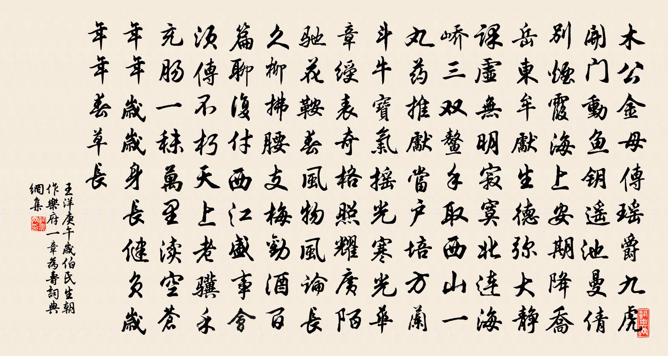 詩詞名句歷史字典書法欣賞書法字典國語詞典說文解字康熙字典古漢語字典標 題 作 者 詩 句 庚午歲伯氏生朝作樂府一章為壽作者:王洋 朝代:宋代原文木公金母傳瑤爵,九虎開門動魚鑰。遙池曼倩別煙霞,海上安期降喬嶽。東牟先生德彌大,靜課虛無明寂寞。北連海嶠三雙鰲,手取西山一丸藥。推先當戶培方蘭,鬥牛寶氣搖光寒。光華章綬表奇格,照耀廣陌馳花鞍。春風物風論長久,柳拂腰支梅勸酒。百篇聊復付西江,盛事會須傳不朽。天上老驥禾充腸,一秣萬里瀆空蒼。年年歲歲身長健,負歲年年春草長。詩詞問答問:《庚午歲伯氏生朝作樂府一章為壽》的作者是誰?答:王洋問:該詩寫於哪個朝代?答:宋代書法欣賞庚午歲伯氏生朝作樂府一章為壽書法作品詩詞推薦程高承議赴夔路轉運判官求詩李廌〔宋代〕聖主躬仁政,群方布詔條。洪恩溫海嶠,嘉頌滿芻蕘。聚斂除奸吏,依違屏具僚。鈞衡無碩鼠,城社絕余妖。皇化洞庭風雨二首李群玉〔唐代〕面南一片黑,俄起北風顛。浪潑巴陵樹,雷燒鹿角田。魚龍方簸蕩,雲雨正喧闐。想赭君山日,秦皇怒赫然。巨浸贈廬陵三劉神童姚勉〔宋代〕唐時劉正字,今復見廬陵。珠樹三根秀,金門一日登。贈君無句錦,覓我到溪冰。不為炎涼變,童年有此能。平時兄弟間十三章四句送定叟弟之官桂林張栻〔宋代〕子行日以遠,我思日以長。政或少閒暇,書來不可忘。長相思·長相思晏幾道〔宋代〕長相思,長相思,若問相思甚了期。除非相見時。長相思,長相思,欲把相思說似誰。淺情人不知。罷還邊將雍陶〔唐代〕白須虜將話邊事,自失公權怨語多。漢主豈勞思李牧,趙王猶是用廉頗。新鷹飽肉唯閒獵,舊劍生衣懶更磨。百戰挽石應之提刑孫應時〔宋代〕天姥千年秀,西京萬石孫。蟬聊書雁塔,鼎盛說龍門。奮建光前躅,封胡藹後昆。寢門今日淚,悽斷不堪論。逍遙詠宋太宗〔宋代〕雅澹玄中得,常人故不知。幽深無遠近,道外細推之。碧落神仙境,煙霞日月隨。參詳寰宇內,邪正豈相離。致政孫從政輓詞范成大〔宋代〕丈室推居士,安居稱老夫。回骸桑下餓,續命轍中枯。重道幾三叟,輕財似八廚。欲知潛德報,青紫付遺孤。水仙花分韻得鴻字劉學箕〔宋代〕借水開花體態豐,獲畦寒日玉瓏{左王右忽}。素槃黃珏清尊並,綠箸青簪白髮同。楚楚凌波明振鷺,翩翩遵渚潔九月十四日夜雞初鳴夢一故人相語曰我為蓮華陸游〔宋代〕白首歸修汗簡書,每因囊粟戲侏儒。不知月給千壺酒,得似蓮華博士無?送權守解印趨闕李新〔宋代〕欲挽行人入醉鄉,殘春岐路日偏長。花容貼雨蜂兒靜,麥浪翻風燕子涼。心計已高劉晏幕,恩波終載召公棠。去思題趙子固水仙圖翠屏道人〔宋代〕翠帶懸璫重,凌波步步輕。春深不成怨,錦瑟夜無聲。初春苦寒久不到雙溪成長句書懷王炎〔宋代〕老去頗多病,苦寒摧折之。袍繭非不溫,不能護清羸。 * 穩附火,蓄縮如凍龜。西山有桃李,借問惟枯枝。好花無罪福張伯端〔宋代〕終日行不曾行,終日坐何曾坐。修善不成功德,造惡元無罪過。時人若未明心,莫執此言亂做。死後須見閻王,難浣溪沙向子諲〔宋代〕一夜涼E97C動碧廚。曉庭飛雨濺真珠。玉人睡起倚金鋪。雲髻作堆初未整,柳腰如醉不勝扶。天仙風調世間無游山陽十首陳造〔宋代〕熙台楚觀小開樽,老去登臨易斷魂。蹀血龍荒平昔志,即今搔首望中原。送陳經略二首汪應辰〔宋代〕清明公正復慈祥,觸眼平生見未嘗。自幸來依驃騎幕,如何又趣舍人裝。雲霄去路日千里,萍梗微蹤天一方。獨有過劉員外長卿別墅(一作碧澗別業)皇甫曾〔唐代〕謝客開山後,郊扉積水通。江湖千里別,衰老一尊同。返照寒川滿,平田暮雪空。滄洲自有趣,不便哭途窮。議糾合兩淮復興文天祥〔宋代〕揚州兵了約廬州,某向瓜洲某鷺洲。直下南徐侯自管,皇親刺史統千舟。名句推薦此時相望不相聞,願逐月華流照君。張若虛《春江花月夜》 一行足以玷終身,故古人飭躬若璧,惟恐有瑕疵也。王永彬《圍爐夜話·第四八則》 暝色入高樓,有人樓上愁。李白《菩薩蠻·平林漠漠煙如織》 黯然銷魂者,唯別而已矣!江淹《別賦》 城門失火,殃及池魚。司馬光《資治通鑑·梁紀·梁紀十六》 長於春夢幾多時,散似秋雲無覓處。晏殊《木蘭花·燕鴻過後鶯歸去》 女子今有行,大江溯輕舟。韋應物《送楊氏女》 驚奇喜異者,終無遠大之識;苦節獨行者,要有恆久之操。洪應明《菜根譚·概論》 勇,志之所以敢也。墨子《墨子·40章 經(上)》 更可惜,雪中高樹,香篝熏素被。周邦彥《花犯·小石梅花》