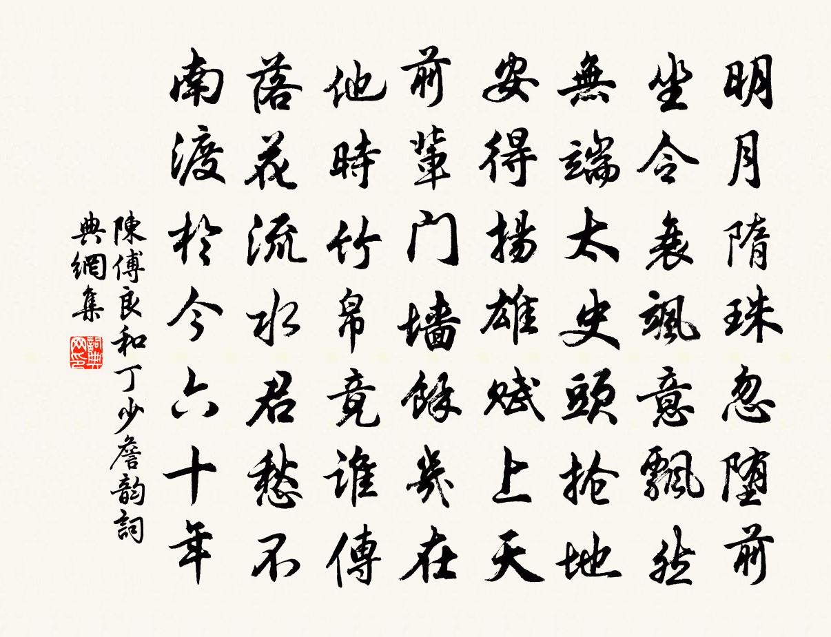 詩詞名句歷史字典書法欣賞書法字典國語詞典說文解字康熙字典古漢語字典標 題 作 者 詩 句 和丁少詹韻作者:陳傅良 朝代:宋代和丁少詹韻原文明月隋珠忽墮前,坐令衰颯意飄然。無端太史頭搶地,安得揚雄賦上天。前輩門牆余幾在,他時竹帛竟誰傳。落花流水君愁不,南渡於今六十年。詩詞問答問:和丁少詹韻的作者是誰?答:陳傅良問:和丁少詹韻寫於哪個朝代?答:宋代陳傅良和丁少詹韻書法欣賞和丁少詹韻書法作品詩詞推薦挽知軍劉公三首陳棣〔宋代〕種學三冬富,禔身百行兼。文章崑玉瑩,政事莫邪銛。才贍榮登早,心休進取廉。典刑今已矣,遐想淚空沾。游靈泉呈性老王灼〔宋代〕曉發雲靈山,千憩靈泉山。兩山信有靈,相對各開顏。阿師達磨孫,文字昔所刪。戲出香積供。憐我半生孱。時維端平乙未新元王柏〔宋代〕檯曆更新德未新,讀書未濟腹中貧。屢因快意行來錯,卻向閒中認得真。性性不忘千聖旨,惺惺毋欠滿腔仁。榮枯青玉案(西湖路)韓淲〔宋代〕蘇公堤上西湖路。柳外躍、青驄去。多少韶華驚暗度。南山游遍,北山歸後,總是題詩處。如今老矣傷春暮。澤畔子由在筠作《東軒記》,或戲之為東軒長老。蘇軾〔宋代〕大士何曾有生死,小儒底處覓窮通。偶留一吷千山上,散作人間萬竅風。感詠十解寄呈楊安撫白玉蟾〔宋代〕上界足官府,大仙多拘束。遂令東方朔,只戀殿前肉。病中有懷吳泳〔宋代〕二年多病少佳懷,酒落杯中見影猜。青女降霜溪屋冷,白姑記日命宮災。柳州解崇崇頻作,孫子逐痁痁轉來。就使休假大佛寺王安石〔宋代〕罷憊得休假,衣冠倦趨翔。挾書聊自娛,解帶寺東廊。六龍高徘徊,光景在我裳。冬屋稍暄暖,病身更強梁。從我釣台范成大〔宋代〕久矣心空客路埃,茲行端為主恩來。杜陵詩是吾詩句,臥病豈登江上台!以坡公君如大江日千里我如此水千山底為韻作趙蕃〔宋代〕聞君射策日,落筆字數千。行看玉堂試,闊步踵英躔。水調歌頭夏元鼎〔宋代〕三三乾妙畫,佑聖誕彌塵。北方壬癸,水生於坎產元精。一數先天有象,元始化生相應,靈氣屬陽神。壽永齊天地滿江紅佚名〔宋代〕林外溪邊,深深見、一林寒雪。惟覺有、襲人襟袖,暗香不絕。天與風流標格在,肯同桃杏開時節。也須煩、玉手明皇覽鏡妃子剪鬟劉子翬〔宋代〕不復青銅照瘁顏,耄荒從諫若移山。只將女子論賢否,陶母當時亦翦鬟。贈天童監寺袁燮〔宋代〕平生樸拙本無奇,珍重高人不我遺。自顧原無一滴水,何能復有兩篇詩。金陵雜興二百首蘇泂〔宋代〕紙錢吹掛樹枝風,積李崇桃白間紅。但見牛羊上丘壠,忽看禾黍出蒿蓬。戲書虞儔〔宋代〕去年今日到湖州,救得饑民歲又周。閱遍炎涼還自笑,坐靡廩餼更何求。淵明栗里終歸去,太史周南枉滯留。咄咄詠鶴張嵲〔宋代〕昂藏野鶴混群雞,志在雲天失路悲。湖海稻粱元未足,虞衡羅網莫輕施。獨憐鎩翮垂寒雨,可念長鳴向曉曦。卻使送韋整尉長沙張祜〔唐代〕遠遠長沙去,憐君利一官。風帆彭蠡疾,雲水洞庭寬。木客提蔬束,江烏接飯丸。莫言卑濕地,未必乏新歡。奉寄中書王舍人皇甫曾〔唐代〕腰金載筆謁承明,至道安禪得此生,西掖幾年綸綍貴,東山遙夜薜蘿情。風傳刻漏星河曙,月上梧桐雨露清。聖主改唱佚名〔唐代〕張公吃酒李公顛,盛六生兒鄭九憐。舍下雄雞失一足,街頭小福拉三拳。名句推薦報君黃金台上意,提攜玉龍為君死!李賀《雁門太守行》 坐開桑落酒,來把菊花枝。杜甫《九日楊奉先會白水崔明府》 惜別浮橋駐馬時,舉頭試望南山嶺。李頎《少室雪晴送王寧》 上林苑裡花徒發,細柳營前葉漫新。杜審言《春日京中有懷》 此身合是詩人未?細雨騎驢入劍門。陸游《劍門道中遇微雨》 芳菲歇。故園目斷傷心切。向子諲《秦樓月·芳菲歇》 離離原上草,一歲一枯榮。白居易《草 / 賦得古原草送別》 火冷燈稀霜露下,昏昏雪意雲垂野。蘇軾《蝶戀花·密州上元》 爾來從軍天漢濱,南山曉雪玉嶙峋。陸游《金錯刀行》 歷冰霜、不變好風姿,溫如玉。陸容《滿江紅·詠竹》
