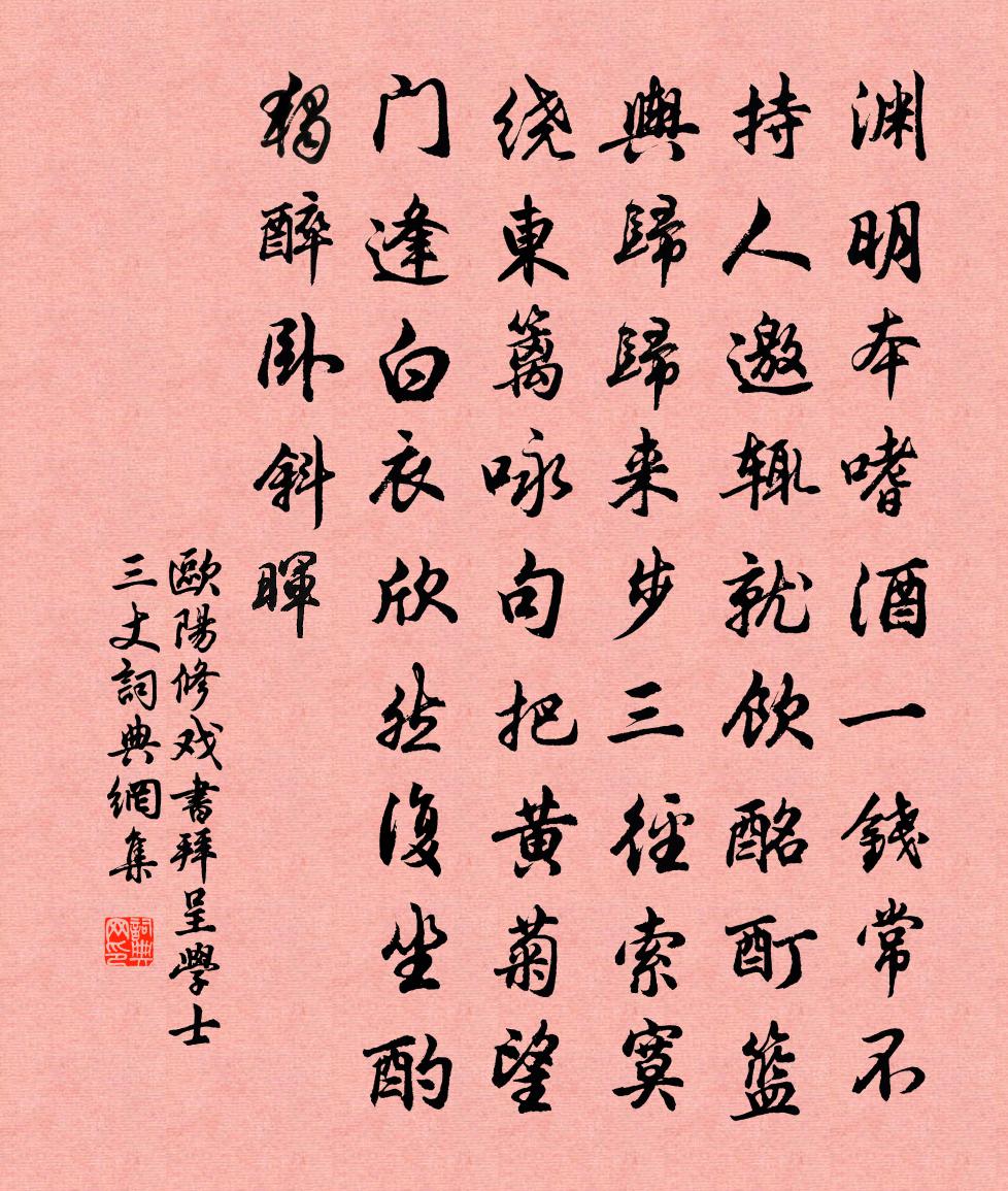 詩詞名句歷史字典書法欣賞書法字典國語詞典說文解字康熙字典古漢語字典標 題 作 者 詩 句 戲書拜呈學士三丈作者:歐陽修 朝代:宋代戲書拜呈學士三丈原文淵明本嗜酒,一錢常不持。人邀輒就飲,酩酊籃輿歸。歸來步三徑,索寞繞東籬。詠句把黃1/1菊,望門逢白衣。欣然復坐酌,獨醉臥斜暉。詩詞問答問:戲書拜呈學士三丈的作者是誰?答:歐陽修問:戲書拜呈學士三丈寫於哪個朝代?答:宋代問:歐陽修的名句有哪些?答:歐陽修名句大全歐陽修戲書拜呈學士三丈書法欣賞戲書拜呈學士三丈書法作品詩詞推薦晏元獻公輓辭三首歐陽修〔宋代〕四鎮名藩忽十春,歸來白首兩朝臣。上心方喜親耆德,物論猶期秉國鈞。退食圖書盈一室,開樽談笑列嘉賓。昔人清平樂王質〔宋代〕斷橋流水。香滿扶疏里。忽見一枝明眼底。人在山腰水尾。梨花應夢紛紛。征鴻叫斷行雲。不見綠毛么鳳,一方明題唐圉人調馬圖陳深〔宋代〕飛龍天廄隘雲稠,一匹驕馳掣電流。櫪下髯奴真廝養,眼中元不識驊騮。送歸中丞使新羅皇甫曾〔唐代〕南巾憲銜恩去,東夷泛海行。天遙辭上國,水盡到孤城。已變炎涼氣,仍愁浩淼程。雲濤不可極,來往見雙旌。入湘二首徐照〔宋代〕土若丹砂顏色赤,山無高勢小成叢。江船未慣行湘水,越客新能下楚風。蘭杜滿汀過綠草,鴛鴦近日別輕鴻。地塗南柯子馬鈺〔元代〕王與馬相見,心交應宿緣。太原梁苑已升天。記得當初,留語再相傳。守服須三載,持心更五年。誘人歸善行功全清平樂陳師道〔宋代〕重重疊疊。娜娜裙千襵。時樣官黃香百葉。一歲相逢兩節。曲闌繞遍芳叢。一枝作意妍穠。折得有誰相憶,卻須還餘杭道中范成大〔宋代〕落花流水淺深紅,盡日帆飛繡浪中。桑眼迷離應欠雨,麥須騷殺已禁風。牛羊路杳千山合,雞犬村深一徑通。五柳少年新婚為之詠詩沈約〔南北朝〕山陰柳家女。莫言出田墅。丰容好姿顏。便僻工言語。腰肢既軟弱。衣服亦華楚。紅輪映早寒。畫扇迎初暑。錦履一落索陳允平〔宋代〕澹澹雙蛾疏秀。為誰頻皺。落花何處不春愁,料不是、因花瘦。錦字香箋封久。鱗鴻稀有。舞腰銷減不禁愁,怕一太皇太后閣六首蘇軾〔宋代〕日永蠶收簇,風高麥上場。朝來藉田令,菰黍獻時芳。送江少府授延陵後寄伍喬〔唐代〕五老雲中勤學者,遇時能不困風塵。束書西上謁明主,捧檄南歸慰老親。別館友朋留醉久,去程煙月入吟新。莫因八景歌趙汝鐩〔宋代〕嗷嗷哀鳴肅肅羽,魂清意爽愛湘楚。西風作惡陣腳散,斜行千點下煙浦。飛力已困日且晡,便欲就宿依寒蘆。大者暮秋書事陸游〔宋代〕暮秋風雨卷茆茨,砧杵聲中過雁悲。楓葉欲丹先慘澹,菊叢半倒不支持。旗亭人熟容賒酒,野寺僧閒得對棋。莫怪送李志全還鄉李若水〔宋代〕半竿曉日明柳梢,飛沙眯眼東風豪。之子北歸顏色好,黃紙寫敕藍染袍。只輪軋軋鳴長路,回首高風隔煙霧。自憐壽柏峰陳普〔宋代〕愛道愛寶同縮蝸,福善一點如朝霞。稽天利慾渺無路,不妨甪里留巔崖。清虛淡素天所覷,百神萬物爭擁遮。七十沁園春·試望陰山納蘭性德〔清代〕試望陰山,黯然銷魂,無言排徊。見青峰幾簇,去天才尺;黃沙一片,匝地無埃。碎葉城荒,拂雲堆遠,雕外寒煙水調歌頭李光〔宋代〕庚午八月望夜,士友悉赴郡會。杖策獨游,頗懷平生故人,作水調歌以自釋。予自長年,粗聞養生之術。放逐以來江神子/江城子林正大〔宋代〕拾遺流落錦宮城。故人情。眼為青。時向百花,潭水濯冠纓。韋曲杜陵行樂地,塵土暗,嘆漂零。園翁溪友總比鄰子規杜耒〔宋代〕不論南北與東西,但是春山有子規。啼到日邊啼未了,何嘗勸得二人歸。名句推薦飛雲當面化龍蛇,夭矯轉空碧。秦觀《好事近·夢中作》 讀書破萬卷,下筆如有神。杜甫《奉贈韋左丞丈二十二韻》 寒日蕭蕭上瑣窗,梧桐應恨夜來霜。李清照《鷓鴣天·寒日蕭蕭上瑣窗》 活水源流隨處滿,東風花柳逐時新。于謙《觀書》 冬夜夜寒覺夜長,沉吟久坐坐北堂。李白《夜坐吟》 對酒捲簾邀明月,風露透窗紗。蘇軾《少年游·潤州作》 悲莫悲生離別,樂莫樂新相識,兒女古今情。辛棄疾《水調歌頭·壬子三山被召陳端仁給事飲餞席上作》 人無禮則不生,事無禮則不成,國家無禮則不寧。荀子《荀子·修身》 人煙寒橘柚,秋色老梧桐。李白《秋登宣城謝朓北樓》 仰天大笑出門去,我輩豈是蓬蒿人。李白《南陵別兒童入京》