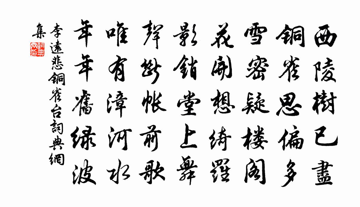 詩詞名句歷史字典書法欣賞書法字典國語詞典說文解字康熙字典古漢語字典標 題 作 者 詩 句 悲銅雀台作者:李遠 朝代:唐代悲銅雀台原文西陵樹已盡,銅雀思偏多。雪密疑樓閣,花開想綺羅。影銷堂上舞,聲斷帳前歌。唯有漳河水,年年舊綠波。詩詞問答問:悲銅雀台的作者是誰?答:李遠問:悲銅雀台寫於哪個朝代?答:唐代問:悲銅雀台是什麼體裁?答:五律李遠悲銅雀台書法欣賞悲銅雀台書法作品注釋全唐詩:卷519-9詩詞推薦夏日游南湖謝薖〔宋代〕麴塵裙與草爭綠,象鼻筩勝瓊作杯。可惜小舟橫兩槳,無人催送莫愁來。胡氏書房鄭會〔宋代〕臘盡山中不見梅,閉門高枕夢瑤台。午窗晴日蜂喧紙,忽有訂溪道士來。宿青溪米處士幽居李中〔唐代〕寄宿溪光里,夜涼高士家。養風窗外竹,叫月水中蛙。靜慮同搜句,清神旋煮茶。唯憂曉雞唱,塵里事如麻。峨眉亭黃虛舟〔宋代〕浩蕩長流浪拍天,貔貅十萬坐樓船。年年春滿江南岸,夜夜風傳塞化煙。中界靈祗藏水府,六朝廢寢落山邊。秋來又海眼光贊釋了惠〔宋代〕玉腕指尖新,力能提萬鈞。上他籃子裹,未必是金鱗。山坡羊·晨雞初叫陳草庵〔元代〕晨雞初叫,昏鴉爭噪。那個不去紅塵鬧?路迢迢,水迢迢,功名盡在長安道。今日少年明日老。山,依舊好;人,水宿洪咨夔〔宋代〕分席眠鷗渚,廬山夢已通。蓬聲疏密雨,燈影往來風。我正思吾母,兒應說乃翁。擁衾天未曉,此味與誰同。詠夜韋應物〔唐代〕明從何處去,暗從何處來。但覺年年老,半是此中催。梅嶺有松無竹曾豐〔宋代〕與梅結友問為誰,松竹中含霜雪姿。竹豈寒盟已仙去,宿心惟有老松知。長安新晴陸暢〔唐代〕九重深淺人不知,金殿玉樓倚朝日。一夜城中新雨晴,御溝流得宮花出。送羅正之兩浙提刑秦觀〔宋代〕豈為鱸魚憶故丘,東南昏墊賴良謀。一封暮別雲間閣,三組秋歸海上州。子政暫為都水使,千秋終作富民侯。贈君挽知臨安府兼浙西制置使曾公曾子良〔宋代〕德佑思良弼,江西出大臣。報忠昭漢議,靖獻有殷仁。皦日五朝老,清風百世人。幾時歸袞繡,秋草臥麒麟。登舟吳芾〔宋代〕天憐行客困陽秋,許舍車徒上小舟。十里好風袪滯思,一溪寒水助清游。觀洛城花呈堯夫先生張岷〔宋代〕平生自是愛花人,到處尋芳不遇真。祗道人間無正色,今朝初見洛陽春。偈釋圓〔宋代〕新縫紙被烘來暖,一覺安眠到五更。聞得上方鐘鼓動,又添一日在浮生。感遇十首次韻和黃著作魯直以將窮山海跡勝絕晁補之〔宋代〕平生莫逆交,弦斷寄心賞。相思望青楓,目極江水上。念當及時節,農事動春壤。來者不有年,何能咎吾往。禽獸昆蟲之孝十首犬林同〔宋代〕食肉隱兩頰,飼母向頹垣。終感主養母,能將死報恩。贈逸民詩 十二蕭衍〔南北朝〕晨朝已失。桑榆復過。漏有去箭。流無還波。切念不減。疑慮益多。季俗易驕。危心少知。我之憂矣。用是作歌。自鹹平至太康鞍馬間得十小詩寄懷晏叔原並問黃庭堅〔宋代〕東南萬里江,緣淨一杯酒。王孫江南去,更得訊息否。新秋盛熱楊萬里〔宋代〕度夏今年未覺難,那知秋熱政無端。晚林不動蟬聲若,蟬亦無風可得餐。名句推薦寄語天涯客,輕寒底用愁。于謙《除夜太原寒甚》 今宵樓上一尊同。雲濕紗窗。辛棄疾《一剪梅·中秋元月》 梧桐更兼細雨,到黃昏、點點滴滴。李清照《聲聲慢·尋尋覓覓》 江上幾人在,天涯孤棹還。溫庭筠《送人東遊》 心欲小而志欲大,智欲員而行欲方劉安及其門客《淮南子·主術訓》 深宮桃李無人問,舊愛玉顏今自恨。元好問《玉樓春·驚沙獵獵風成陣》 繡幃人念遠,暗垂珠淚,泣送征輪。韓縝《鳳簫吟·鎖離愁》 夢斷香消四十年,沈園柳老不吹綿。陸游《沈園二首》 赤壁磯頭落照,肥水橋邊衰草,渺渺喚人愁張孝祥《水調歌頭·和龐佑父》 鬢髮已甘塵路白,菊花猶送塞垣黃。齊之鸞《九日登清水營城》