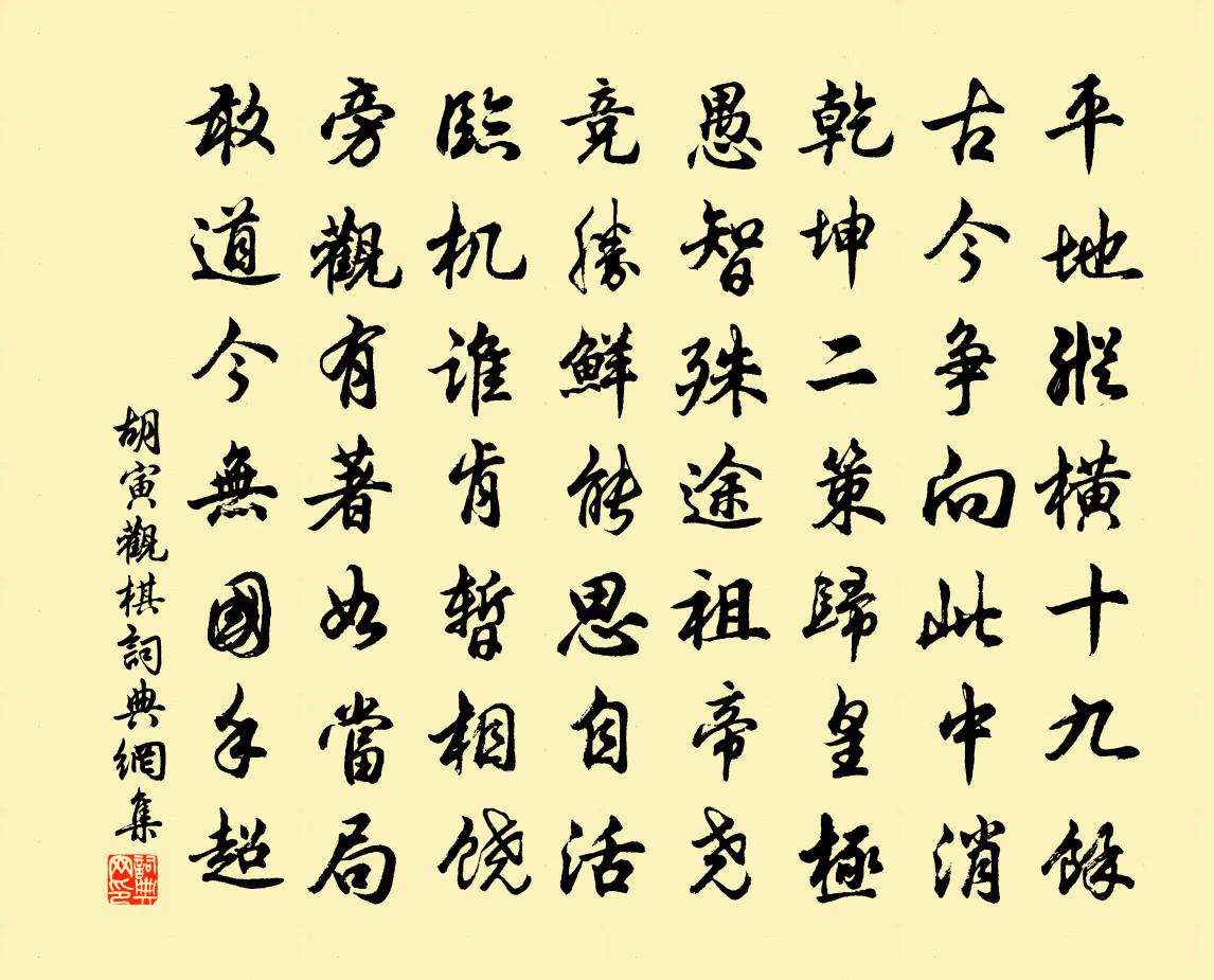 詩詞名句歷史字典書法欣賞書法字典國語詞典說文解字康熙字典古漢語字典標 題 作 者 詩 句 觀棋作者:胡寅 朝代:宋代觀棋原文平地縱橫十九餘,古今爭向此中消。乾坤二策歸皇極,愚智殊途祖帝堯。競勝鮮能思自活,臨機誰肯暫相饒。旁觀有著如當局,敢道今無國手超。詩詞問答問:觀棋的作者是誰?答:胡寅問:觀棋寫於哪個朝代?答:宋代胡寅觀棋書法欣賞觀棋書法作品詩詞推薦登樓歌王維〔唐代〕聊上君兮高樓,飛甍鱗次兮在下。俯十二兮通衢,綠槐參差兮車馬。卻瞻兮龍首,前眺兮宜春。王畿郁兮千里,山詠和親蘇郁〔唐代〕關月夜懸青冢鏡,寒雲秋薄漢宮羅。君王莫信和親策,生得胡雛虜更多。和令狐相公春日尋花有懷白侍郎閣老劉禹錫〔唐代〕芳菲滿雍州,鸞鳳許同游。花徑須深入,時光不少留。色鮮由樹嫩,枝亞為房稠。靜對仍持酒,高看特上樓。晴宜和段季承左藏惠四絕句楊萬里〔宋代〕道是詩壇萬丈高,端能辨卻一生勞。阿誰不識珠將玉,若個關渠風更騷。永遇樂(林鐘商過李氏晚妝閣,見壁間舊所題詞,遂再賦)吳文英〔宋代〕春酌沈沈,晚妝的的,仙夢遊慣。錦漵維舟,青門倚蓋,還被籠鶯喚。裴郎歸後,崔娘沈恨,漫客請傳芳卷。聯題雜興陸游〔宋代〕少年豈知酒,借醉以作狂;中年狂已歇,始覺酒味長,湛湛癭樽綠,酌以紅螺觴,醒醉不可名,兀坐萬事忘。賀呂守用中黃公度〔宋代〕紫帽山顛秋色高,刺桐城頭風怒號。乾坤沖融忽異態,千里和氣生旌旄。昂星之精來瑞世,要令致主唐虞際。骨相聞王媽媽定做小祥功德作二首釋道濟〔宋代〕媽媽好善結良緣,齋僧不論聖和凡。經資齋襯明舍施,少間暗裡送來還。懷剡川故居釋仲皎〔宋代〕病日飛蠅鬢雪乾,欲扶吾道愧衰殘。把他杓柄力何倦,還我钁頭心便安。待摘菜花添午供,便裁荷葉備春寒。不辭詠愁石象之〔宋代〕來何容易去何遲,半在心頭半在眉。門掩落花春去後,窗窺殘月酒醒時。柔如萬頃連天草,亂比千尋匝地絲。除卻中觴二絕蘇籀〔宋代〕欲瀾秋水剪瞳人,愁絕春山俲玉真。擘了荔支拋豆寇,送鉤非復近前嗔。東風何應龍〔宋代〕和徹詩篇得暫閒,落梅香里立欄乾。新裁白紵春衫薄,猶怯東風一陣寒。問桂林景熙〔宋代〕空吟招隱句,林下立多時。秋信在何處,天香開幾枝。山河深夜影,水石隔年期。曾是搴英客,清愁欲語誰。南歌子·手裡金鸚鵡溫庭筠〔唐代〕手裡金鸚鵡,胸前繡鳳凰。偷眼暗形相。不如從嫁與,作鴛鴦。相和歌辭烏夜啼王建〔唐代〕庭樹烏,爾何不向別處棲,夜夜夜半當戶啼。家人把燭出洞戶,驚棲失群飛落樹。一飛直欲飛上天。回回不離舊棲晚雪吟孟郊〔唐代〕貧富喜雪晴,出門意皆饒。鏡海見纖悉,冰天步飄颻。一一仙子行,家家塵聲銷。小兒擊玉指,大耋歌聖朝。睿氣賞酴醾病不赴陳造〔宋代〕不得花前共一樽,蕭齋藥裹自相親。閒追水佩裳為夢,空負雲階月地春。縹緲瑤英霧為幄,敷腴玉面酒生鱗。蜚觴漁父詞四首戴復古〔宋代〕漁父醉,釣竿閒。柳下呼兒牢擊船。漁家傲馬熙〔元代〕池上水枯根岸峭。池邊雪霽無行道。三島遙遙心欲造。舟子誚。*舟恐受堅冰笑。遵渚一鴻方矯矯。苦飢雙鶴從形念奴嬌京鏜〔宋代〕出愈奇,輒復賦一首以謝萬分,並述所懷。郎闈夙望,問何因袖手,雙流溪畔。憶昔班行曾接武,今喜一尊同泛。名句推薦織婦何太忙,蠶經三臥行欲老。元稹《織婦詞》 持志如心痛。一心在痛,人安有工夫說閒語,管閒事王陽明《傳習錄·卷上·門人薛侃錄》 歲華向晚愁思,誰念玉關人老?蔡挺《喜遷鶯·霜天秋曉》 書劍時將晚,丘園日已暮。孟浩然《田園作》 記少年、駿馬走韓盧,掀東郭。辛棄疾《滿江紅·和范先之雪》 何人解賞西湖好,佳景無時。歐陽修《採桑子·何人解賞西湖好》 望征路愁迷,離緒難整陸叡《瑞鶴仙梅》 他人有心,予忖度之。佚名《巧言》 江心雲帶蒲帆重,樓上風吹粉淚香。嚴仁《鷓鴣天·惜別》 欲渡黃河冰塞川,將登太行雪滿山。李白《行路難·其一》