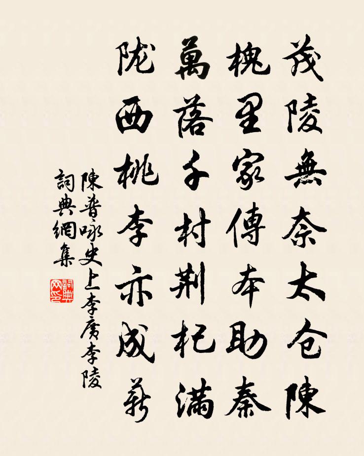 詩詞名句歷史字典書法欣賞書法字典國語詞典說文解字康熙字典古漢語字典標 題 作 者 詩 句 詠史上李廣李陵作者:陳普 朝代:宋代詠史上李廣李陵原文茂陵無奈太倉陳,槐里家傳本助秦。萬落千村荊杞滿,隴西桃李亦成薪。詩詞問答問:詠史上李廣李陵的作者是誰?答:陳普問:詠史上李廣李陵寫於哪個朝代?答:宋代陳普詠史上李廣李陵書法欣賞詠史上李廣李陵書法作品詩詞推薦賀晚生子李劉〔宋代〕商瞿五十子何遲,佳氣充閭慶可知。喜溢麟生天上日,夢回虎墮月中時。犀錢{左月右卷下換貝}送沾佳客,麝顆頌古五首釋如琰〔宋代〕趙州老漢熱心腸,一盞粗茶驗當行。回首路傍橋斷處,白蘋紅蓼映斜陽。郊居值雨韓維〔宋代〕愁雲覆西郊,氣象棲以冽。夜雨朝不止,冰霰相纏結。南堂何蕭條,散秩坐超忽。頹然附爐炭,兩髁冷如鐵。俯念集高亭高文虎〔宋代〕山亭十月晏溫朝,倚檻一聲婆餅焦。舌澀力微寒氣早,不成清亮卻成嬌。益壽美金花侯善淵〔元代〕靈源虛靜。物換流陽如寶鏡。滿目清光。寂寞無為用在常。本乎一性。返照真空終復始。性命俱全。煉就陽神得自舟次卷雪樓四首陶夢桂〔宋代〕虎豹從渠守九關,不求進步只求閒。歸裝幸有新時在,一字千金盡買山。何復教授以事待理陳師道〔宋代〕負俗寧能累哲人,昔賢由此致功名。驥收鹽坂車前足,琴得焦桐爨下聲。三獻荊山時未識,一鳴齊鳥眾方驚。傳聞浣溪沙(己未元夕)吳潛〔宋代〕慶賞元宵只願晴。天公每事秤能平。管教檐溜便收聲。三市海巡那惜夜,九街社火亦爭名。權將歌酒作工程。東天目施樞〔宋代〕不辭巘險訪龍潭,潭底無窮碧似藍。亂石鳴灘溪過九,飛泉瀉瀑塹分三。雖然道士能相引,不比樵人得盡諳。怊悵無夢令 京兆譚急腳索馬鈺〔元代〕且做塵中急足。有日清閒願足。隨分更隨緣,自是常常知足。知足。知足。捉住金烏三足。雨中不出呈斯遠兼示成父四首趙蕃〔宋代〕燠甚宜為雨,晴來又復陰。霜風吹不變,雪霰已相侵。寒且依爐密,泥防著屐深。未能從子去,何暇復梅尋。懷古二首王安石〔宋代〕長者一床室,先生三徑園。非無飯滿缽,亦有酒盈樽。不起華邊坐,常開柳際門。漫知談實相,欲辯已忘言。答張五弟王維〔唐代〕終南有茅屋。前對終南山。終年無客常閉關。終日無心長自閒。不妨飲酒復垂釣。君但能來相往還。廣列女四首劉克莊〔宋代〕前有條桑女子,後有茶蕊夫人。潔以自媒為婦,賢於奉表稱臣。題范季實秋山縱目圖王灼〔宋代〕江天物態兩憑陵,借與懸岸倚瘦藤。又作吳中十年夢,胥山絕頂望西興。曇智禪師院韋應物〔唐代〕高年不復出,門徑眾草生。時夏方新雨,果藥發餘榮。疏澹下林景,流暮幽禽情。身名兩俱遣,獨此野寺行。題馬麟畫宋高宗〔宋代〕南望青山滿禁闈,曉陪鴛鷺正差池。共愛朝來何處雪,蓬萊宮裡拂松枝。行縣憩九龍巖黃朝散〔宋代〕金鱗玉角照人寒,何事清時此蟄蟠。甘澤不辭膏品物,奚慚濟濟舜朝官。望長安賀鑄〔宋代〕排辦張燈春事早。十二都門。物色宜新曉。金犢車輕玉驄小。拂頭楊柳穿馳道。蓴羹鱸鱠非吾好。去國謳吟,半落言志韓湘〔唐代〕青山雲水窟,此地是吾家。後夜流瓊液,凌晨咀絳霞。琴彈碧玉調,爐煉白硃砂。寶鼎存金虎,元田養白鴉。一瓢名句推薦柳鎖鶯魂,花翻蝶夢,自知愁染潘郎史達祖《夜合花·柳鎖鶯魂》 蒼旻霽涼雨,石路無飛塵。岑參《暮秋山行》 採蓮時,小娘紅粉對寒浪。溫庭筠《荷葉杯·鏡水夜來秋月》 翠葉吹涼,玉容消酒,更灑菇蒲雨。姜夔《念奴嬌·鬧紅一舸》 江送巴南水,山橫塞北雲王勃《江亭夜月送別二首》 誰憐一片影,相失萬重雲?杜甫《孤雁 / 後飛雁》 春潮帶雨晚來急,野渡無人舟自橫。韋應物《滁州西澗》 梅子金黃杏子肥,麥花雪白菜花稀。范成大《四時田園雜興·其二》 積雪覆平皋,飢鷹捉寒兔。孟浩然《南歸阻雪》 柳葉雙眉久不描,殘妝和淚污紅綃。江采萍《謝賜珍珠》