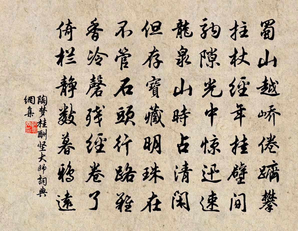 詩詞名句歷史字典書法欣賞書法字典國語詞典說文解字康熙字典古漢語字典標 題 作 者 詩 句 酬堅大師作者:陶夢桂 朝代:宋代酬堅大師原文蜀山越嶠倦躋攀,拄杖經年掛壁間。駒隙光中驚迅速,龍泉山時占清閒。但存寶藏明珠在,不管石頭行路難。香冷磬殘經卷了,倚欄靜數暮鴉遠。詩詞問答問:酬堅大師的作者是誰?答:陶夢桂問:酬堅大師寫於哪個朝代?答:宋代陶夢桂酬堅大師書法欣賞酬堅大師書法作品詩詞推薦去秋芮國器以詩賀入館今渠繼來次韻周必大〔宋代〕一自傳刀夢,遲君已隔秋。浪傳迷弱水,未省礙虛舟。天子方神武,狂胡敢寇讎。應須漢充國,早晚與兵謀。詠柳薛逢〔唐代〕弱植驚風急自傷,暮來翻遣思悠揚。曾飄紫陌隨高下,敢拂朱闌競短長。縈砌乍飛還乍舞,撲池如雪又如霜。莫令和堯夫見寄司馬光〔宋代〕仁政如慈父,蒲人得所依。教條前後接,風亦古今稀。試郡纏書最,還朝必奮飛。西台舊班列,猶望繡衣歸。題汪水雲詩卷楊學李〔宋代〕野服意翛然,心無世網牽。衣冠舊朝士,湖海老詩仙。橫槊思公瑾,登樓憶仲宣。瀟湘風月好,何日理歸船。句彭止〔宋代〕可憐蹤跡似流萍。謝趙太傅遺聚米圖經黃庶〔宋代〕文武生賢子,羌圖帝所多。始欣知馬援,終嘆失廉頗。蒼鼠巢遺稿,黃埃鎖舊戈。遠人猶偃蹇,掩帙淚滂沱。憶天台曹勛〔宋代〕懸車歸台山,乘田方自勤。豈謂羈紲舊,嚴召煩聖君。至止忽三歲,遇事無一欣。屢奏歸田書,遐心行白雲。閉戶丘葵〔宋代〕自我來茲泮,閉戶交遊絕。經生一二輩,長庚伴殘月。芹藻自青青,誰與共採擷。唯於潑潑處,見得源頭活。振策釋紹嵩〔宋代〕振策出遊眺,清吟竹景東。石門千仞斷,秀水一篙通。郡閣煙光裹,人家秋色中。烏衣多勝概,老了奈途窮。頌古十七首釋宗演〔宋代〕色空明暗本無因,見見由來亦誤人。見不及時猶未瞥,那知殃祟是家親。題意大師房曾幾〔宋代〕頭白高僧心已灰,石菖蒲長水蕉開。莊嚴茗事爐煙起,不用關防俗子來。六醜方千里〔宋代〕看流鶯度柳,似急響、金梭飛擲。護巢占泥,翩翩飛燕翼。昨夢前跡。暗數歡娛處,艷花幽草,縱冶遊南國。芳心蘭陵王 春日寄錢塘諸友邵亨貞〔元代〕舊時月。曾照河橋夜別。鞦韆下、花露染衣,倚馬相看動愁絕。登臨黯望徹。思落吳山萬疊。江村路,春水乍生,呂與叔挽章四首秦觀〔宋代〕追惟獻歲發春間,和我新詩憶故山。今日始知詩是讖,魂兮應已度函關。游武夷,作棹歌呈晦翁十首辛棄疾〔宋代〕一水奔流疊嶂開,溪頭千步響如雷。扁舟費盡篙師力,咫尺平瀾上不來。山上風吹笙鶴聲,山前人望翠雲屏。蓬萊木蘭花慢(為同年趙必達壽)黃機〔宋代〕亶文王前子,自不與、世人同。況地望既華,天資更偉,雲驥行空。年少才名蜚動,泛星槎、曾到廣寒宮。桂子香頌證道歌證道歌釋印肅〔宋代〕貧則身常披樓褐,教化眾生求解脫。眾生愈把采縱纏,見我如斯嗔咄咄。宣和五年二月初九日偶書呈如公妙空禪師朱濟道〔宋代〕二年催遣向東州,見盡東州水石幽。不把尋常費心眼,靈岩消得少遲留。北山道中方鳳〔宋代〕拂衣去城市,信步踏晴泥。草意春風蚤,松陰野日西。語長忘路遠,行近覺山低。更欲遲來此,穿林聽鳥啼。頌古九首釋思岳〔宋代〕本是山中人,愛說山中話。五月賣松風,人間恐無價。名句推薦雨過月華生,冷徹鴛鴦浦。柳永《甘草子·秋暮》 金絡青驄白玉鞍,長鞭紫陌野遊盤。萬楚《驄馬》 憶年十五心尚孩,健如黃犢走復來。杜甫《百憂集行》 丈夫志,當景盛,恥疏閒。蘇舜欽《水調歌頭·滄浪亭》 白頭太守真愚甚,滿插茱萸望辟邪。宋祁《九日置酒》 凡百事之成也,必在敬之;其敗也,必在慢之。荀子《荀子·議兵》 階下青苔與紅樹,雨中寥落月中愁。李商隱《端居》 開到荼蘼花事了。曹雪芹《紅樓夢·第六十三回》 愁雲淡淡雨瀟瀟。暮暮復朝朝。石孝友《眼兒媚·愁雲淡淡雨蕭蕭》 江淮度寒食,京洛縫春衣。王維《送綦毋潛落第還鄉 / 送別》