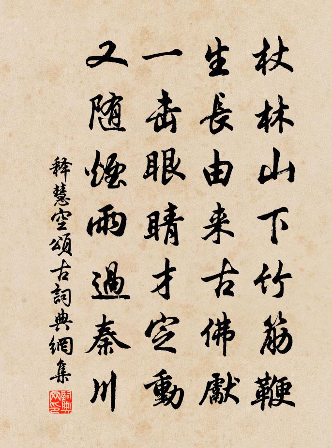 詩詞名句歷史字典書法欣賞書法字典國語詞典說文解字康熙字典古漢語字典標 題 作 者 詩 句 頌古作者:釋慧空 朝代:宋代頌古原文杖林山下竹筋鞭,生長由來古佛先。一擊眼睛才定動,又隨煙雨過秦川。詩詞問答問:頌古的作者是誰?答:釋慧空問:頌古寫於哪個朝代?答:宋代釋慧空頌古書法欣賞頌古書法作品詩詞推薦郡齋水閣閒書蓮子文同〔宋代〕綠實填房未滿,黃茸繞殼方開。為問因誰勸酒,一時齊側金杯。東園觀梅陸游〔宋代〕出世仙姝下草堂,高標肯學漢宮妝。數苞冷蕊愁渾破,一寸殘枝夢亦香。問訊不嫌泥濺屐,端相每到月侵廊。高樓新寨餞南歸客黃庭堅〔宋代〕初更月蝕缺半璧,三更北風雪平屋。夜寒置酒送歸客,長歌燕雁燈前落。故園無書已十月,目極千里雲水隔。客方已亥雜詩 18龔自珍〔清代〕詞家從不覓知音,累汝千回帶淚吟。惹得爾翁懷抱惡,小橋獨立慘歸心。貝州未破書寄王子直司徒劉敞〔宋代〕孤城死地尚瞧盱,智勇俱當竭蹶趨。貧且賤焉真恥也,壯之良者蓋行乎。料無豪傑同吳反,陰有神靈助漢誅。深怪白帝廟蘇軾〔宋代〕朔風催入峽,慘慘去何之。共指蒼山路,來朝白帝祠。荒城秋草滿,古樹野藤垂。浩蕩荊江遠,淒涼蜀客悲。遲回句釋惠崇〔宋代〕遺偈傳諸國,留真在一峰。望雲謝緒〔宋代〕東山渺渺白雲低,丹鳳何時下紫泥。翹首夕陽連舊眺,謾看 * 滿新谷。鶴閒庭砌人稀跡,苔護松蔭山徑迷。野老蒙恩除大蓬一首劉克莊〔宋代〕拜昭文相辟翹材,封冠軍侯築將台。得以先生新主判,兩為玉帝管蓬萊。贈茅山高拾遺許渾〔唐代〕諫獵歸來綺季歌,大茅峰影滿秋波。山齋留客掃紅葉,野艇送僧披綠莎。長覆舊圖棋勢盡,遍添新品藥名多。雲中皇雅十首《耆武》三章尹洙〔宋代〕耆武定功,時惟二方。淮服其乂,海南遂荒。孰孱而盭,孰暴而猖。自底不譓,乃終滅亡。感秋六首鄭獬〔宋代〕落日在高木,輝輝淡秋容。白雲起天鏡,飛去忽無蹤。雨蘚爛漫紫,幽徑誰相從。孤慮如有根,糾結生心胸。良時鷓鴣天葉夢得〔宋代〕一曲青山映小池。綠荷陰盡雨離披。何人解識秋堪美,莫為悲秋浪賦詩。攜濁酒,繞東籬。菊殘猶有傲霜枝。一年茂陵封禪壇王奕〔宋代〕祥符天子舊明堂,二丈豐碑宿草荒。人世已非壇更是,摩挲老淚濕斜陽。八絕詩歸雲洞王禹偁〔宋代〕碧洞何眈眈,呀然倚山根。朝雲出如嘔,暮雲歸如吞。大塊氣不死,茲為玄牝門。怪石攡左右,勢若貙虎蹲。旁行逍遙詠宋太宗〔宋代〕口稱千歲少年顏,不是天人即地仙。四海五湖皆遍歷,十洲一島去周遷。道高舉措何優劣,精彩非常語更賢。物理四月中休日聞蟬楊萬里〔宋代〕荔枝葉底暑陰清,已有新蟬一兩聲。荷露柳風餐未飽,怪來學語不分明。次花翁喜雪快晴韻杜范〔宋代〕何人急急走靈符,扶醒摐摐十萬夫。隘巷未收穿履跡,短檐已倚曬書儒。日開雪色如翻手,景屬詩家費捻須。起望晚步阡陌見水珠逡逡上沿苗葉月華露彩相映清姜特立〔宋代〕月璧上遙巘,水珠生晚苗。田家足清曠,野步自超搖。有叟談耕鑿,無人說市朝。卻憐膏火地,車馬客塵囂。蝶戀花(梁才甫席上次韻)王安中〔宋代〕翠袖盤花金捻線。曉炙銀簧,勸飲隨深淺。復幕重簾誰得見。余醺微覺紅浮面。別喚清商開綺宴。玉管雙橫,抹起名句推薦百花頭上開,冰雪寒中見。辛棄疾《生查子·重葉梅》 紅葉黃花秋意晚,千里念行客。晏幾道《思遠人·紅葉黃花秋意晚》 望廬思其人,入室想所歷。潘安《悼亡詩三首》 芙蓉金菊斗馨香。天氣欲重陽。晏殊《訴衷情·芙蓉金菊斗馨香》 柳重煙深,雪絮飛來往。歐陽修《蝶戀花·面旋落花風蕩漾》 蘭陵美酒鬱金香,玉碗盛來琥珀光。李白《客中行 / 客中作》 差之毫厘,失之千里。佚名《增廣賢文·上集》 縱被無情棄,不能羞。韋莊《思帝鄉·春日游》 儉則傷事,侈則傷貨管仲《管子·乘馬》 非淡泊無以明志,非寧靜無以致遠。諸葛亮《誡子書》
